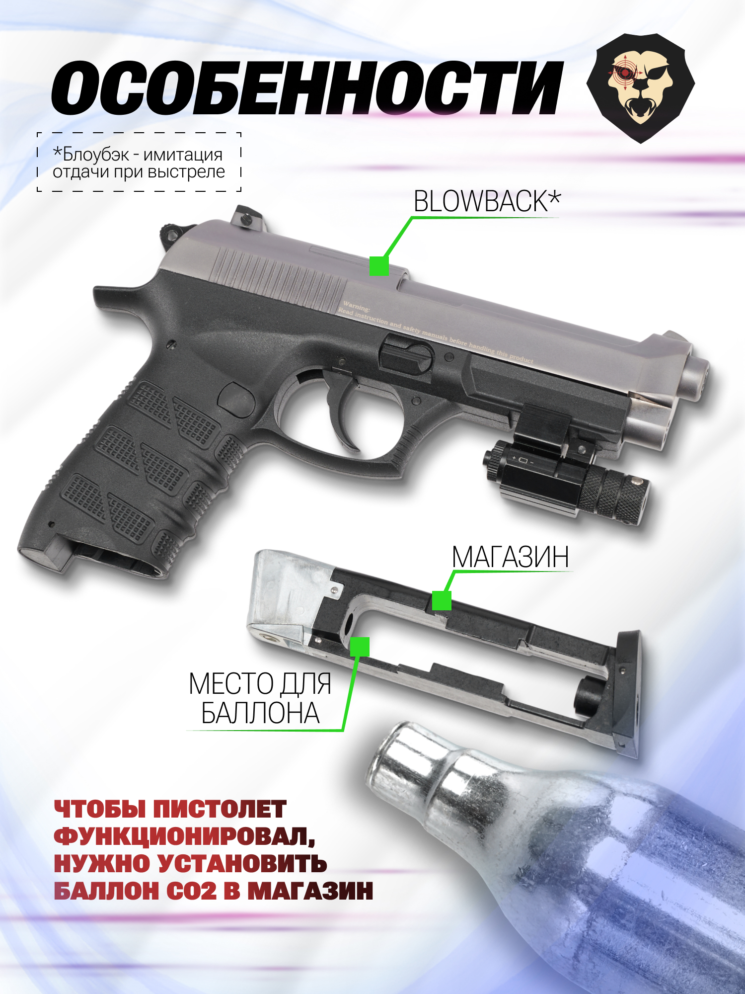 В описываемой вариации исполнения пистолет оснащается металлической затворной рамой в никелированной расцветке, удачно сочетающейся с черным цветом рамки, что придает оружию современный и тактический внешний вид. Отмечается, что при длине в 216 миллиметров масса конструкции достигает 735 грамм. На реалистичность стрельбы также влияет наличие механизма Блоубэк, который за счет приведения в движение затворной рамы имитирует отдачу выстрела.