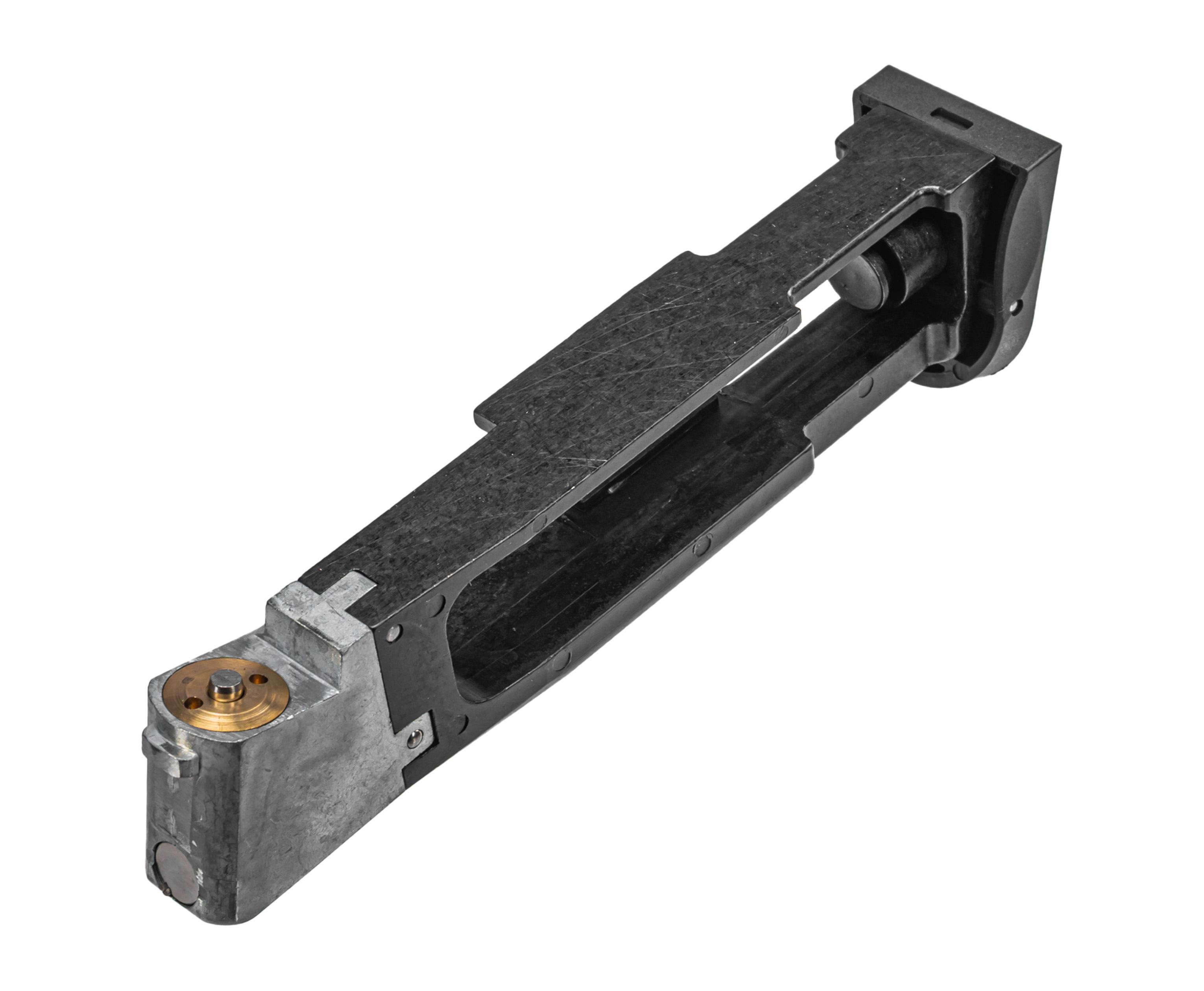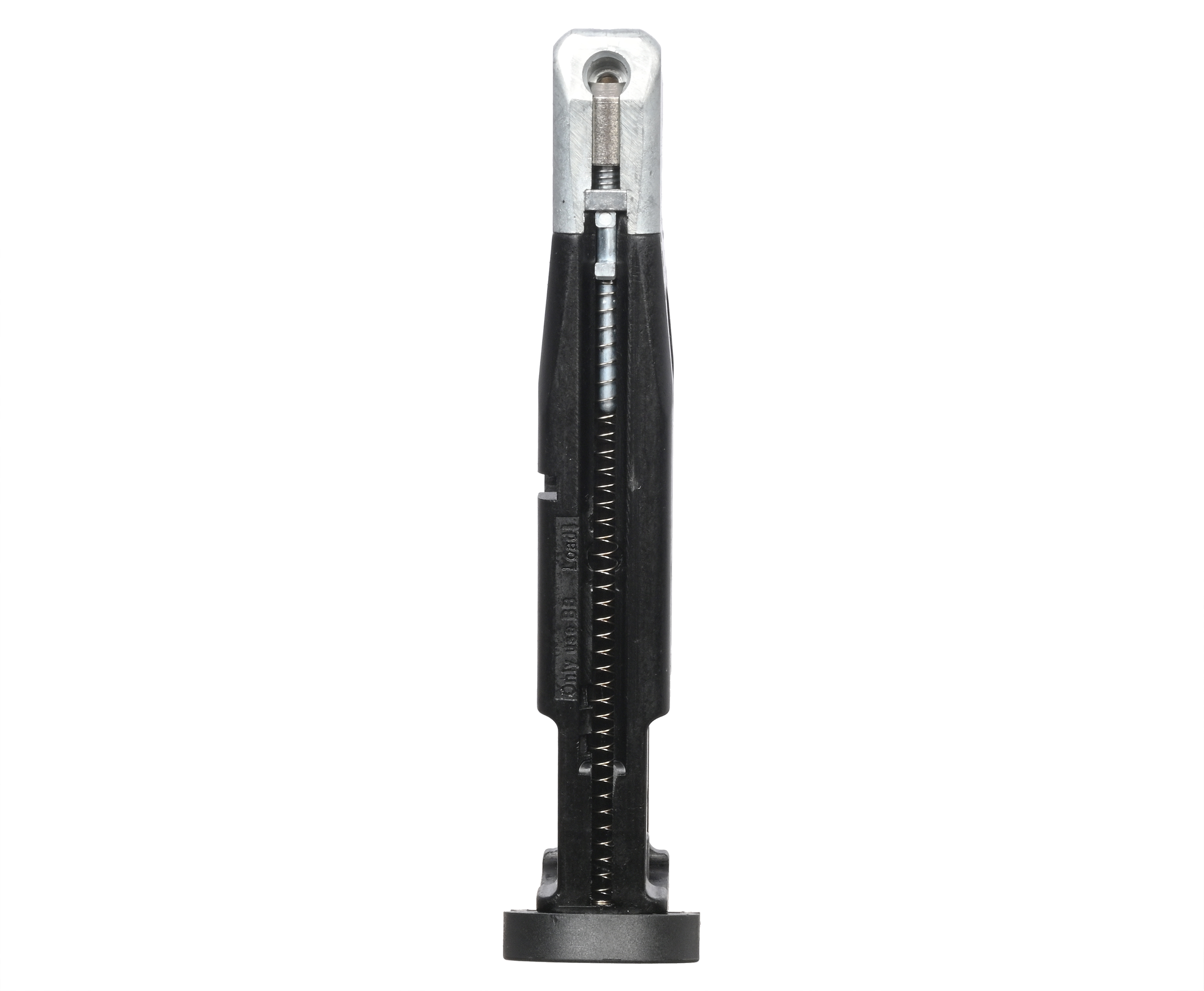 Внутри элемента боепитания, помимо прочего, находится канал с пластиковым подавателем. Магазин рассчитан на 14 шаров, укладываемых вручную через верхние губки. Благодаря наличию витой металлической пружины сферические пульки бесперебойно поступают в ствол пистолета вне зависимости от его положения.