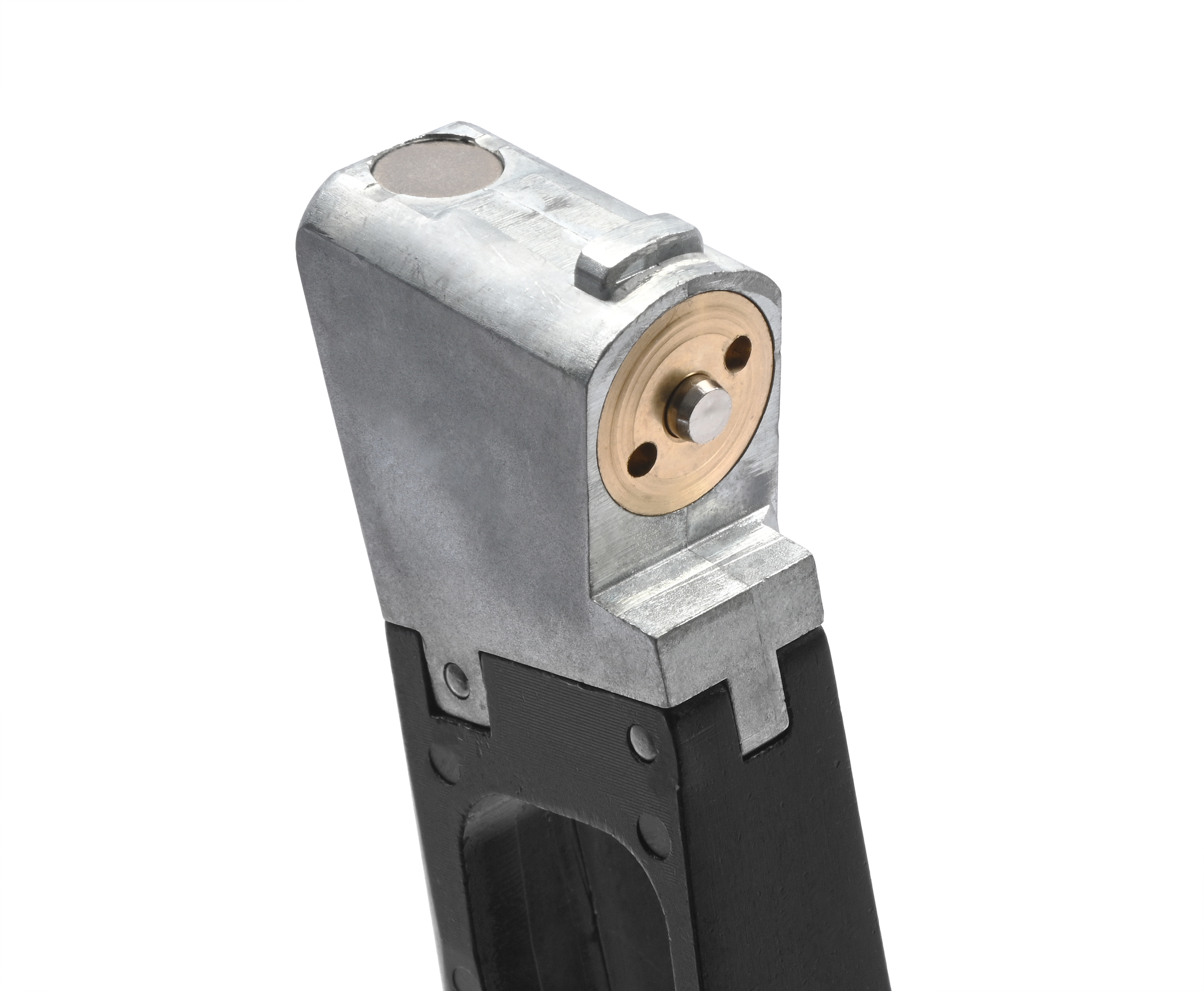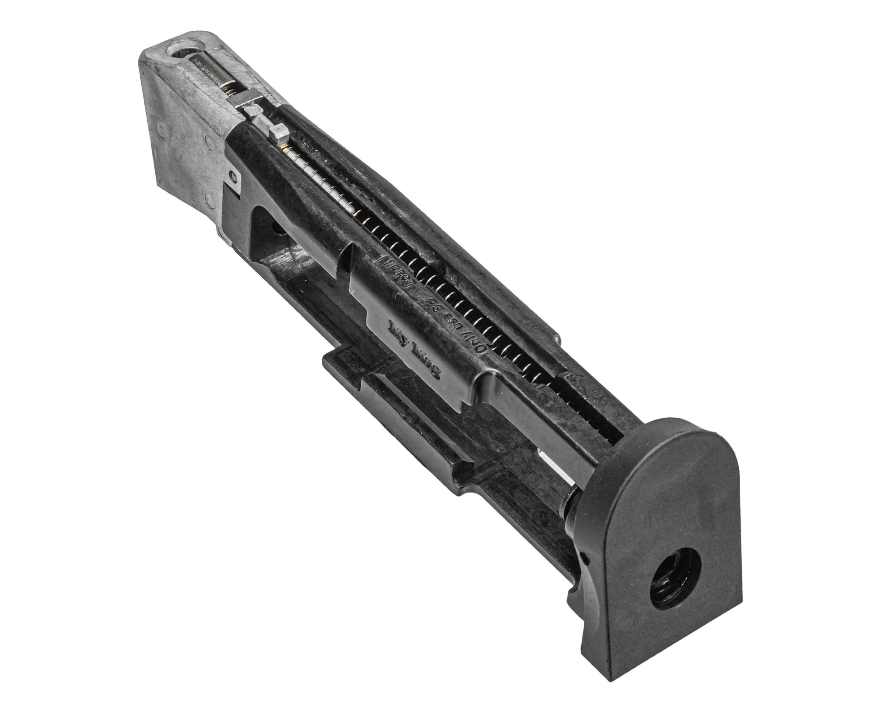 Питается пневматика баллончиками CO2 12 грамм, помещаемыми внутрь магазина. Для отсоединения накопителя потребуется зажать круглую клавишу, которая находится у спусковой скобы. Резервуар устанавливается в паз магазина и затягивается до накола носика с характерным шипящим звуком травления газа - для удобства в комплекте с пистолетом идет специальный ключ.