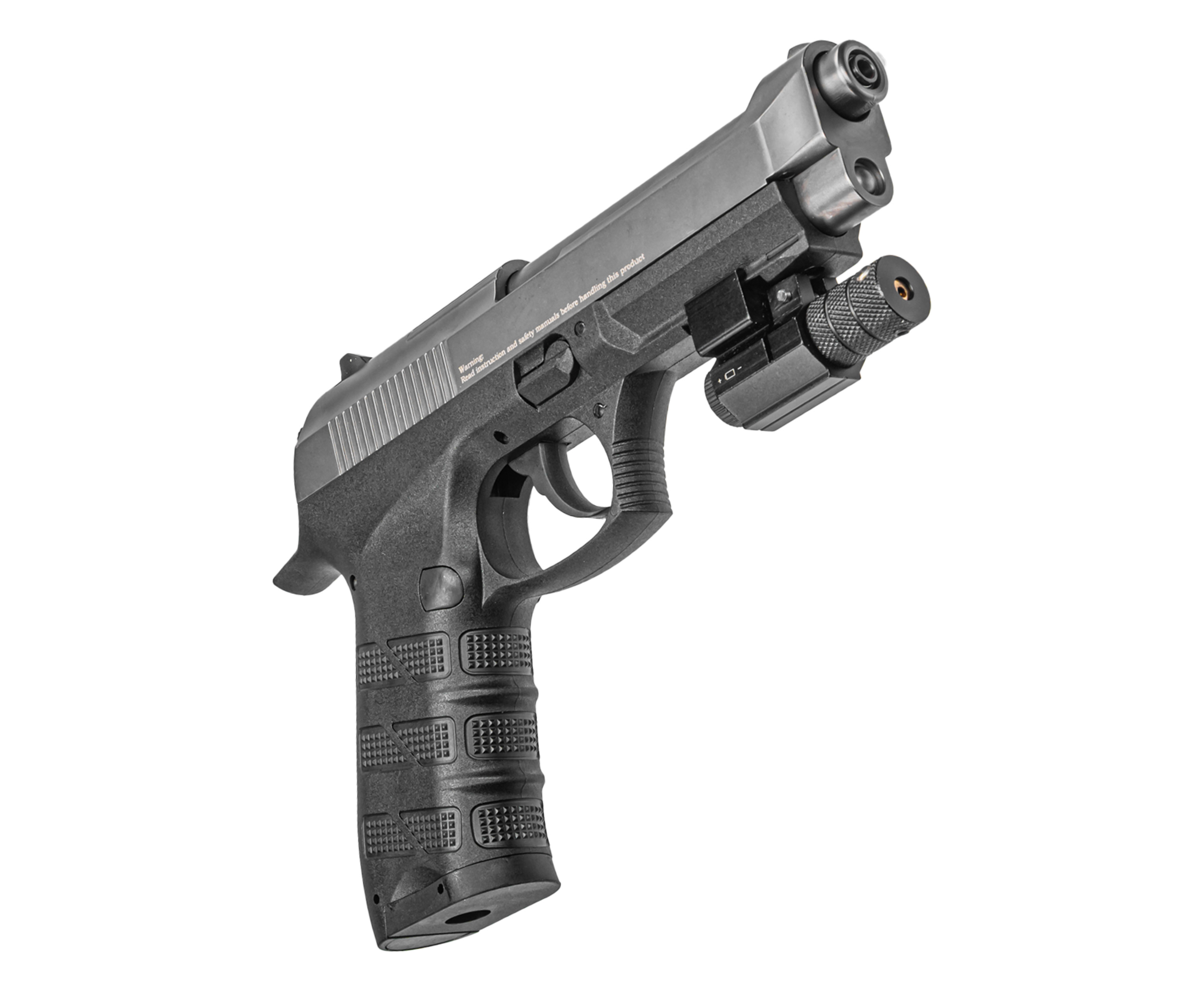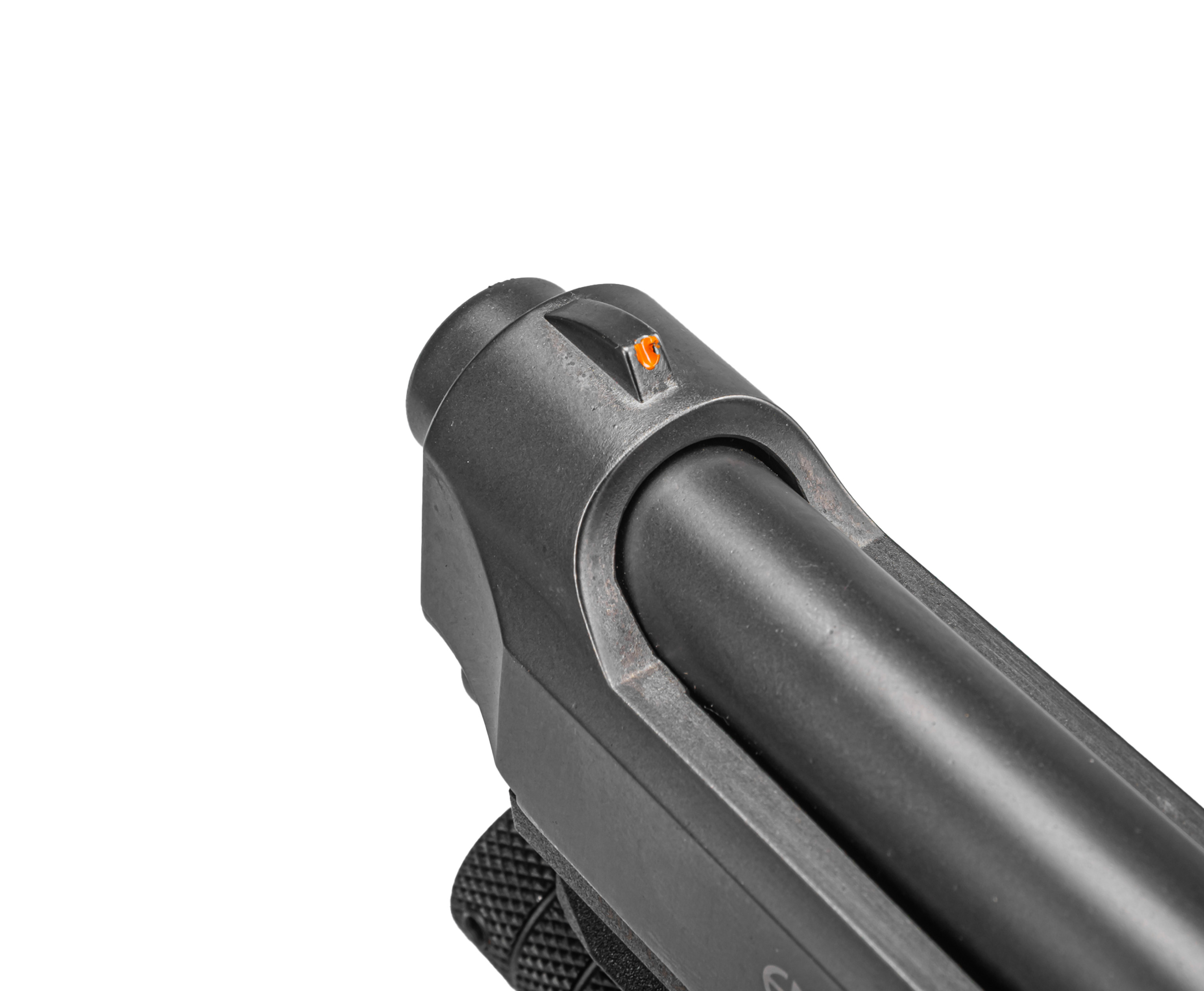 Наличие рельефных насечек вкупе с увеличенным наплывом рукояти повышает комфорт удержания модели во время стрельбы, исключая выскальзывание из ладони. Для наведения на мишень предусмотрены открытые прицельные приспособления - целик и мушка. Перед спусковой скобой под стволом присутствует посадочная планка Weaver 22 мм, используя которую на пистолет закрепляется фонарик или лазерный целеуказатель.