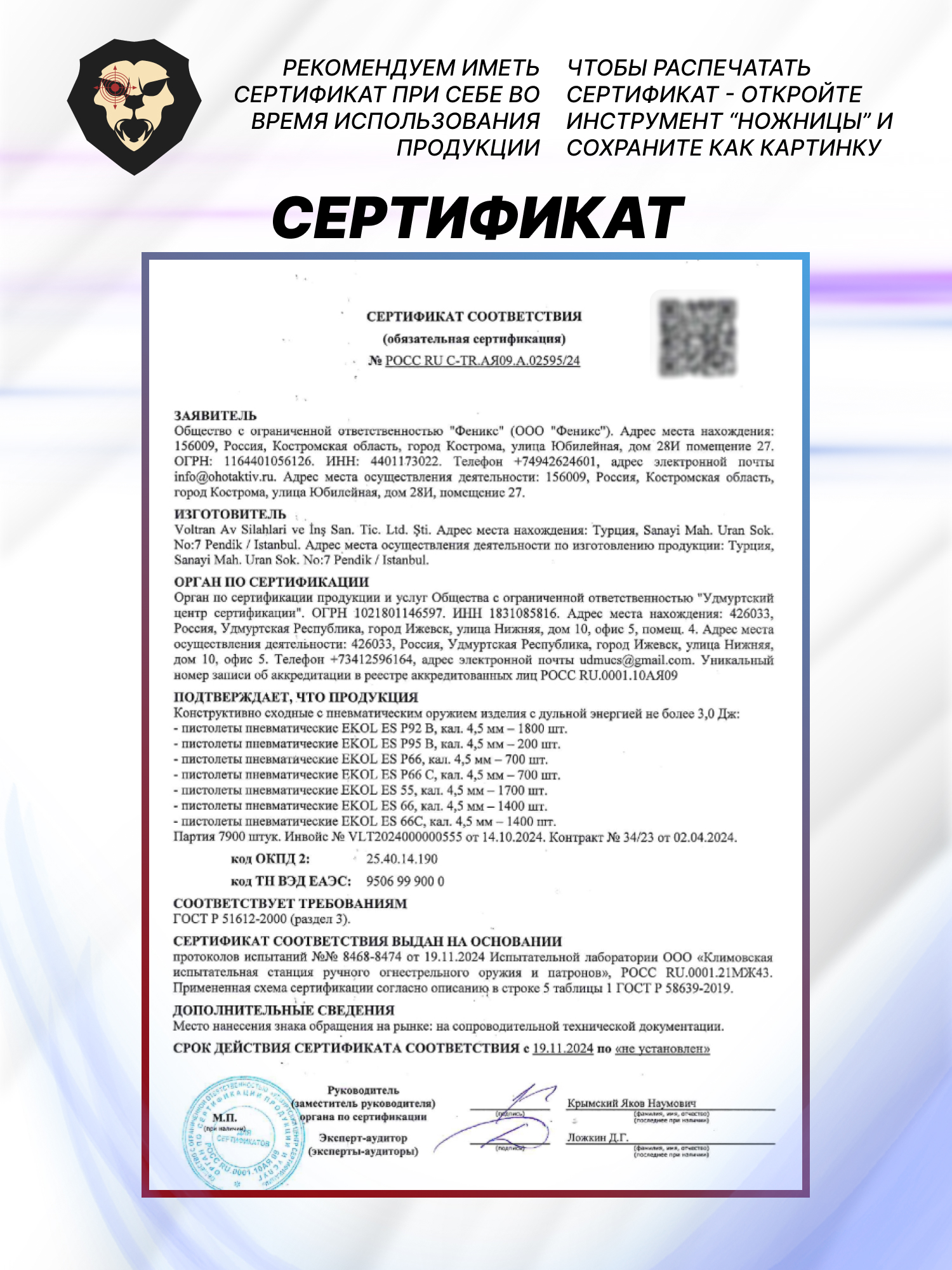 | Комплектация | Пистолет, магазин, упаковка, краткая документация, копия сертификата (по запросу покупателя) |