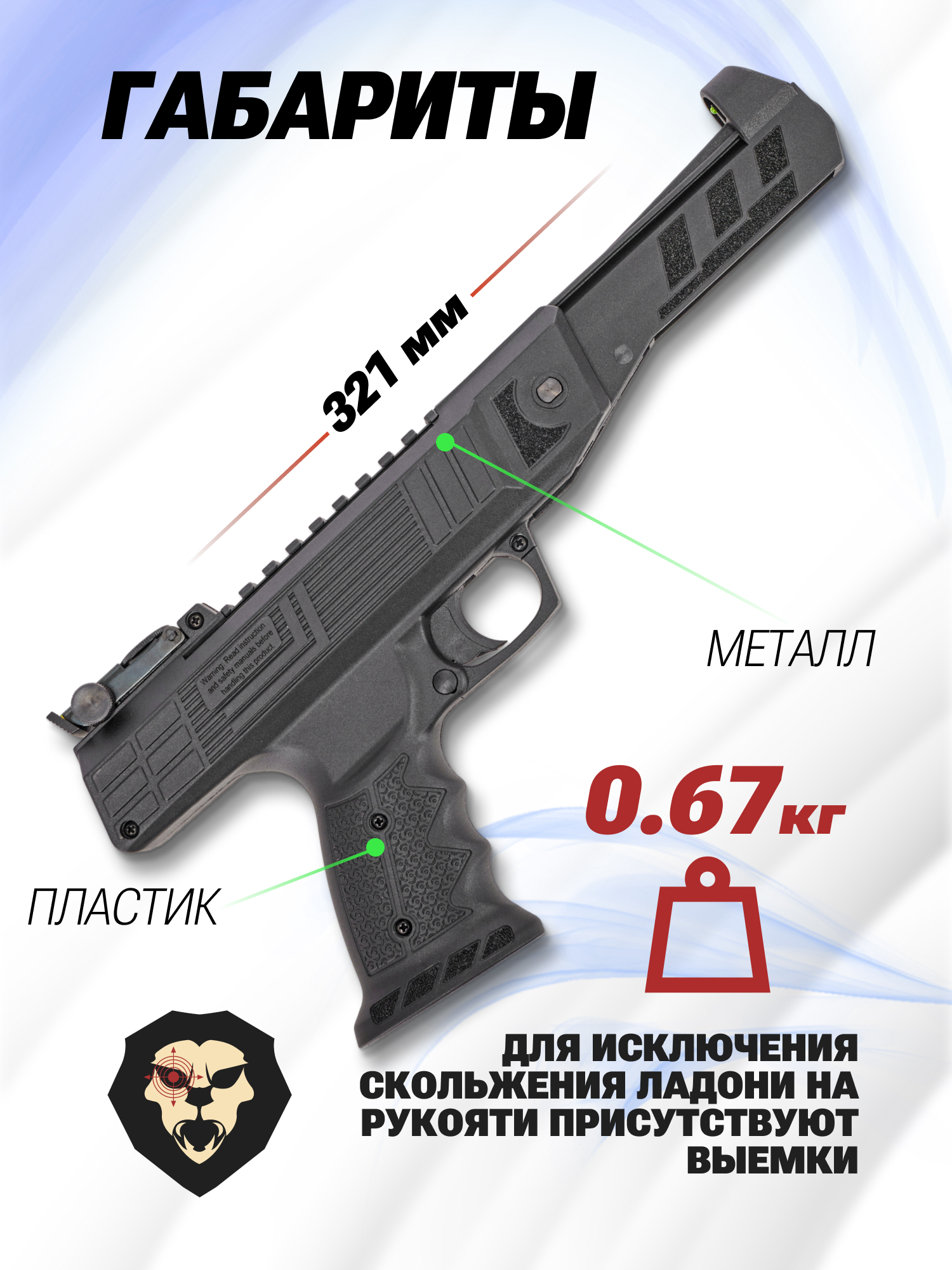 При изготовлении пистолета задействуется металл и современный полимер. Такая комбинация дала оптимальное сочетание прочности и массы - вес изделия не превышает 670 грамм, тогда как длина пневматики составляет 321 мм. Комфортному удержанию способствует рукоять с утолщенной пяткой и подпальцевыми выемками, что вкупе предотвращает скольжение ладони.