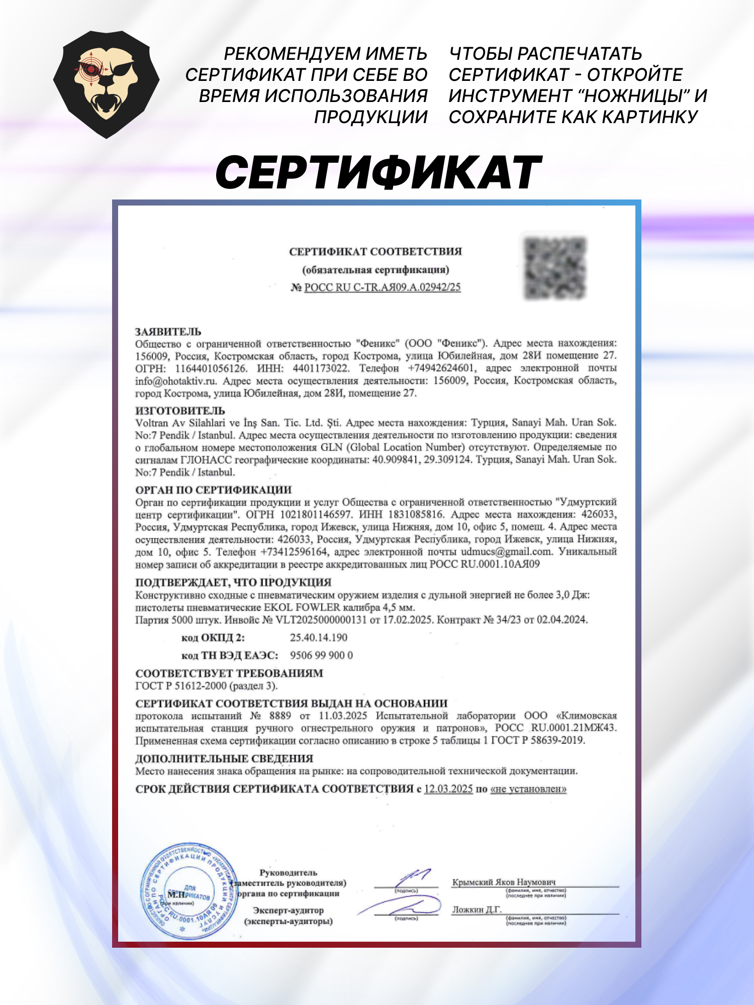 | Комплектация | Пистолет, упаковка, краткая документация, копия сертификата (по запросу покупателя) |