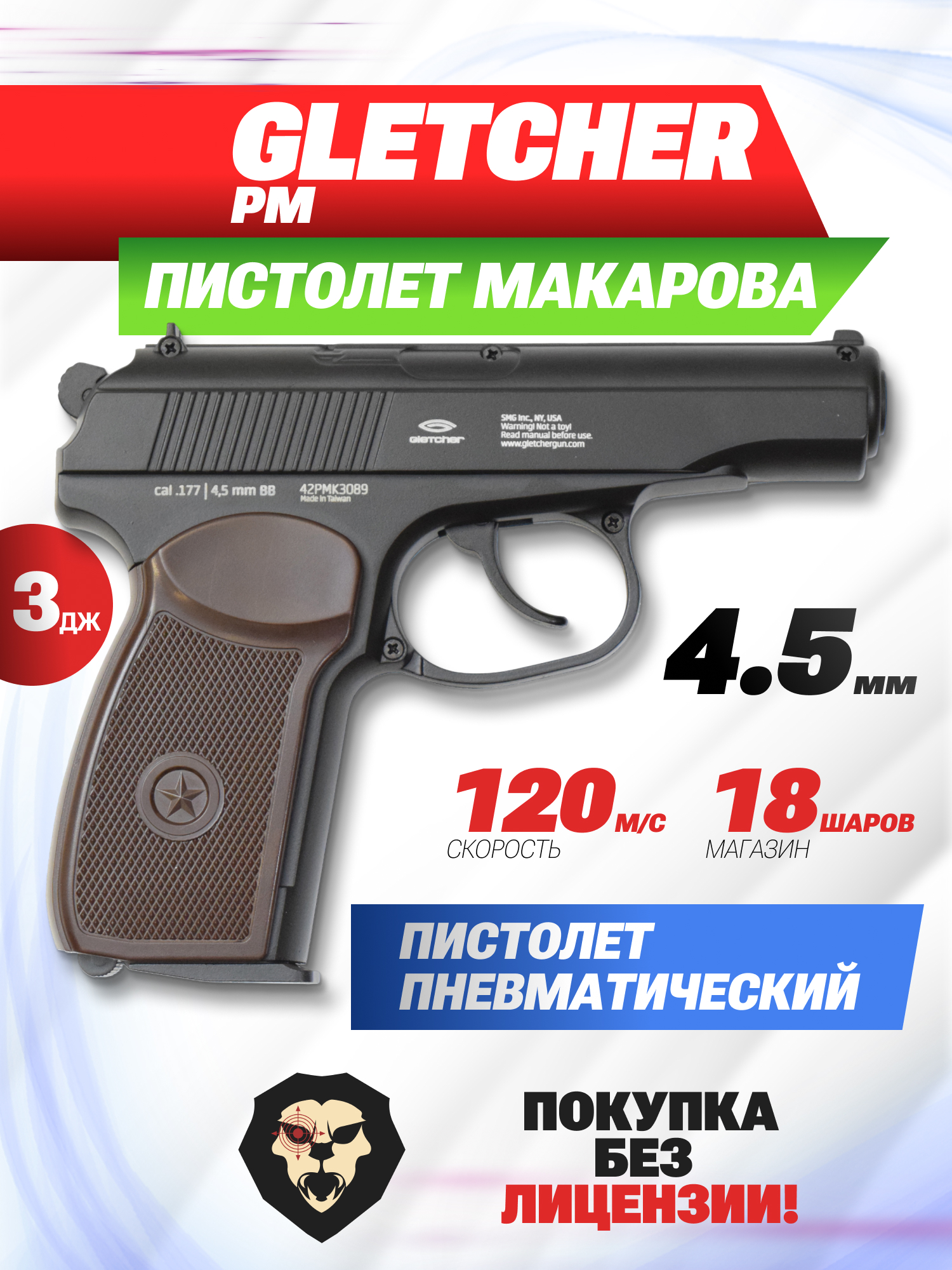 Артикул производителя Пневматический пистолет Gletcher PM (4.5 мм, металл, Макаров) по низкой цене 19590 руб. Модель со штрихкодом производителя Вы можете оплатить наложенным платежем с доставкой или в отделении транспортной компании (ПЭК, СДЭК, Boxberry). Ваш заказ со штрихкодом 2000000063768 забрать на почте с оплатой при получении в любой части Российской Федерации.