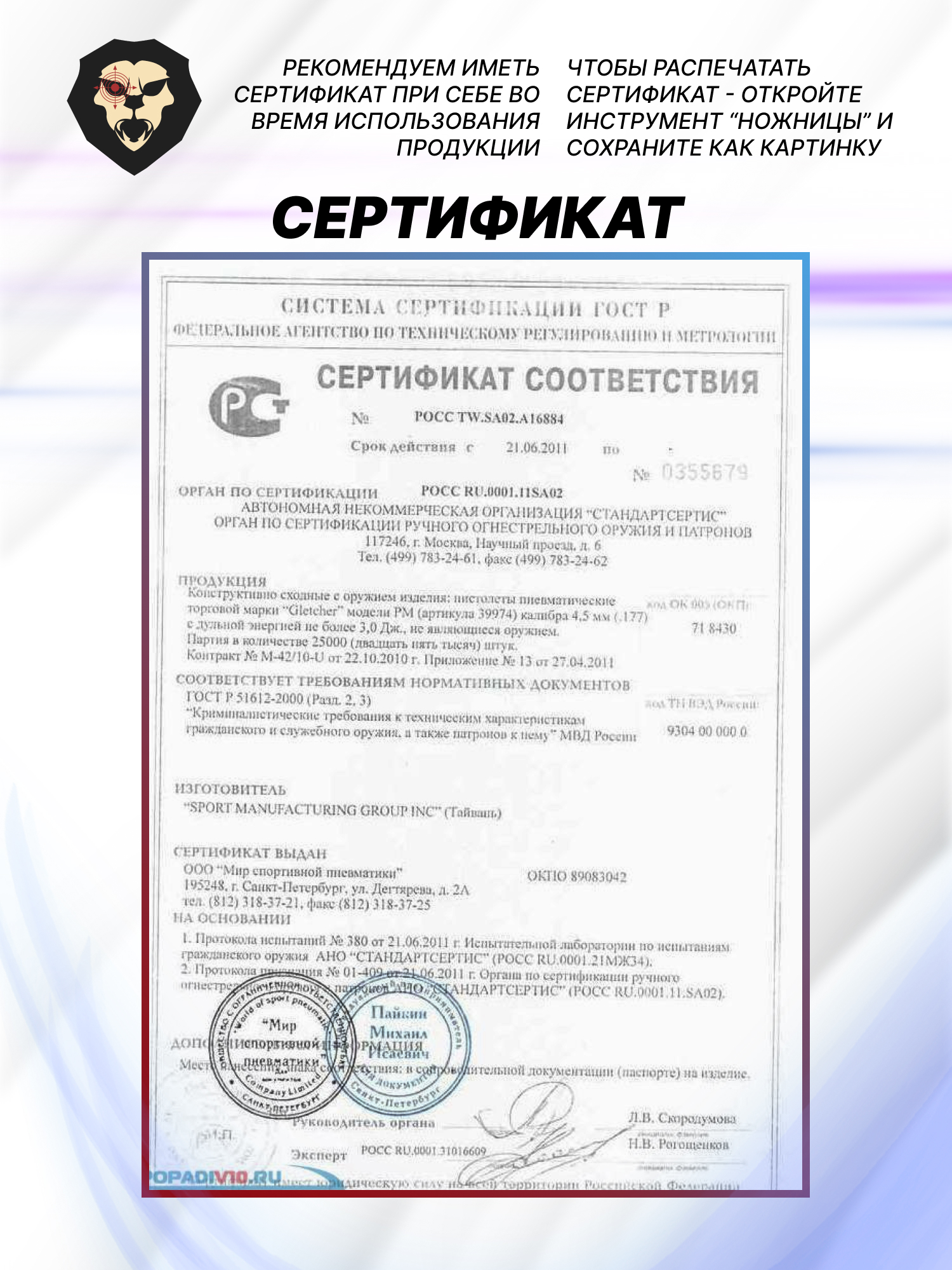 | Комплектация | Пистолет, упаковка, краткая документация, копия сертификата (по запросу покупателя) |