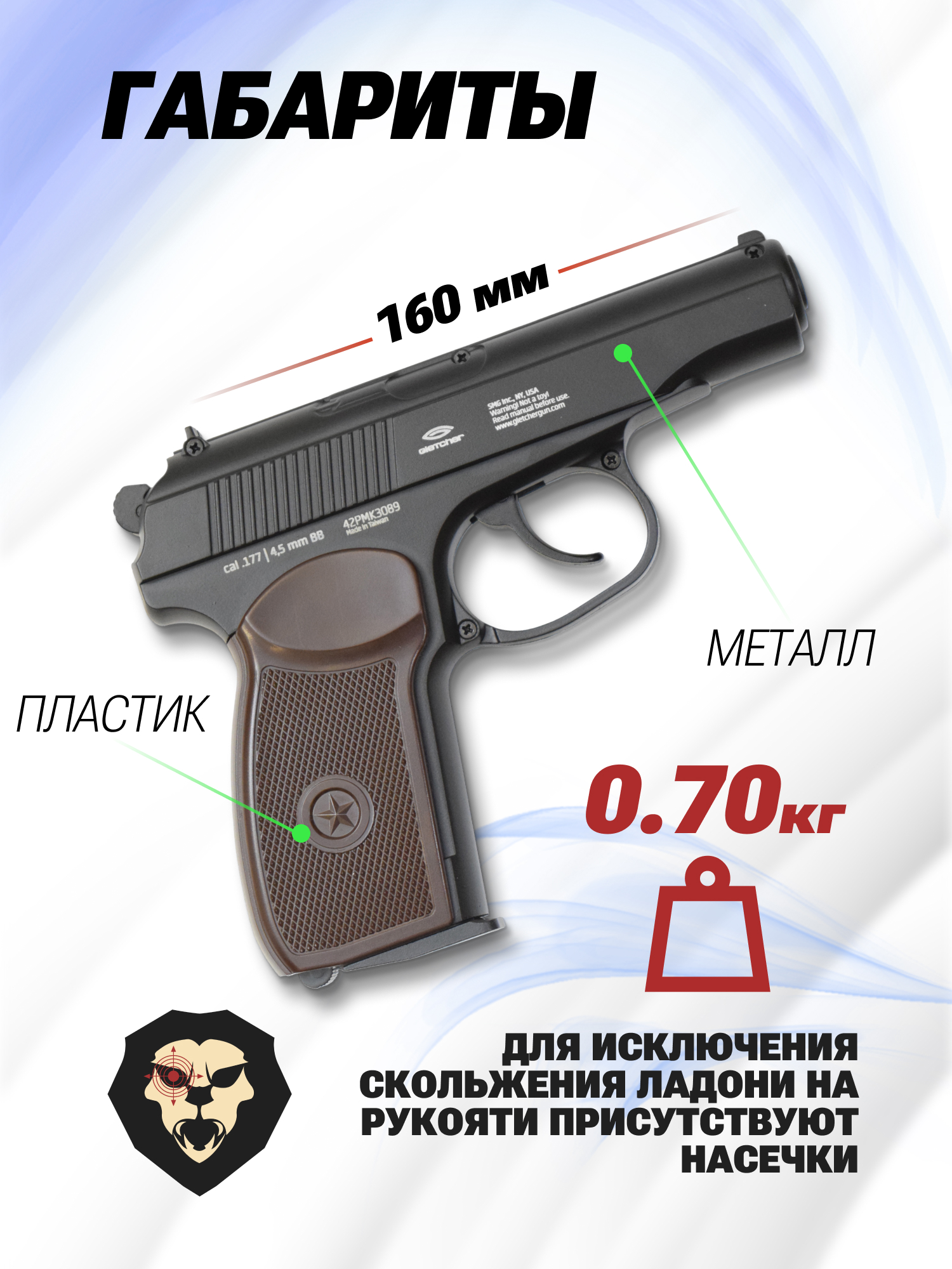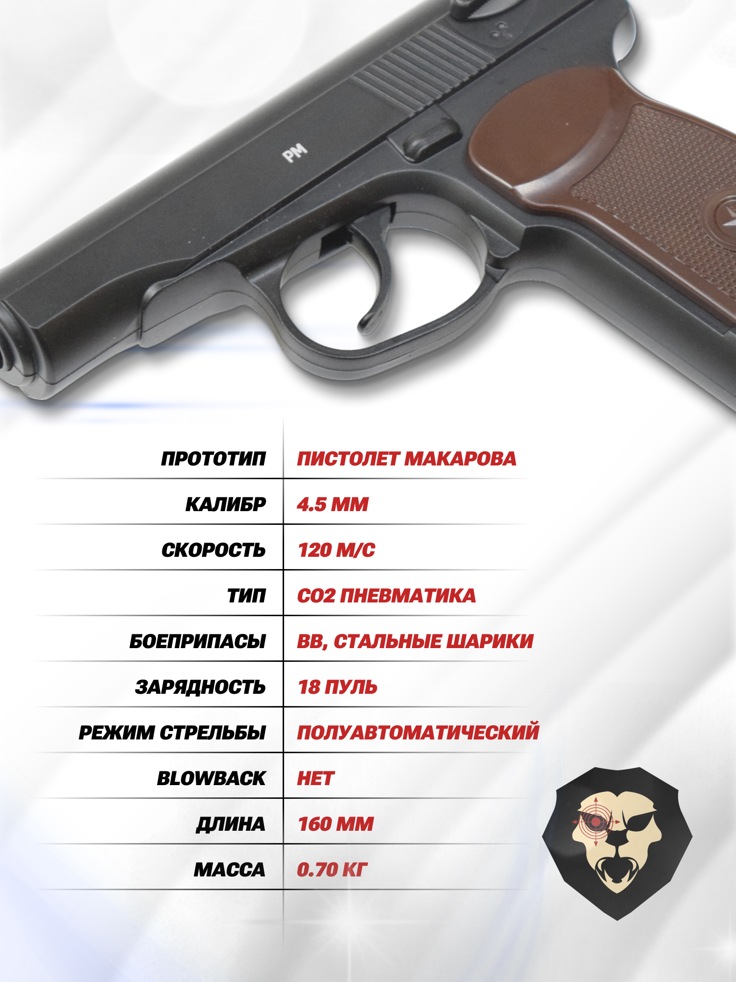 Пневматический пистолет Gletcher PM (4.5 мм, металл) выступает в роли точной копии боевого прототипа в лице Пистолета Макарова ПМ, который разработан в 1948 году и по сей день используется при снаряжении полицейских составов и армии.