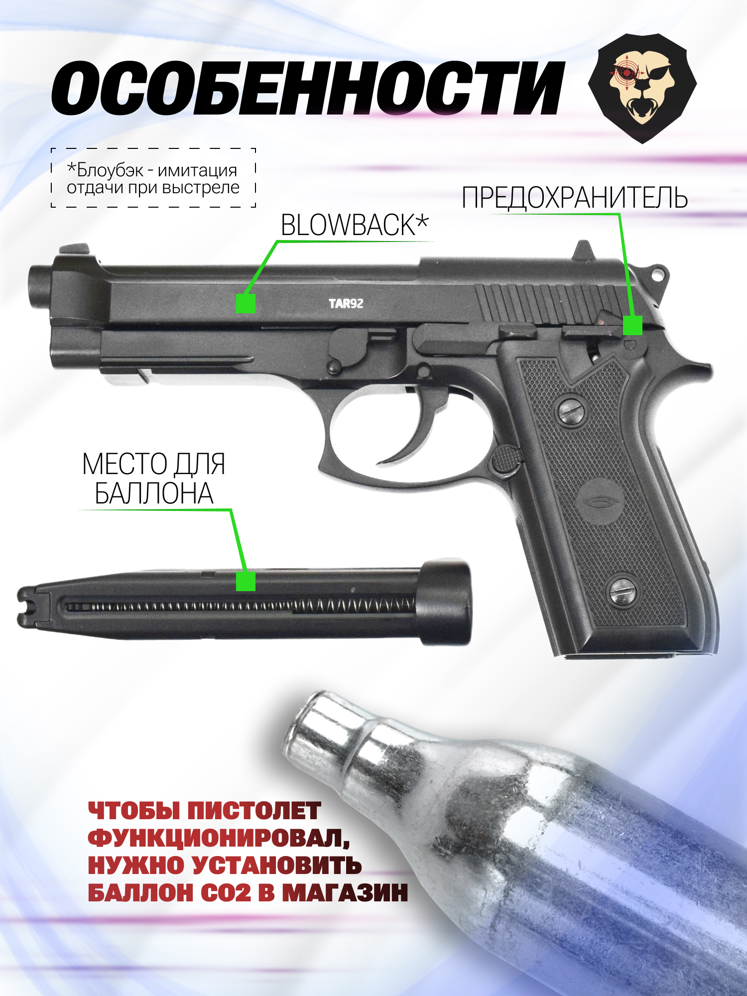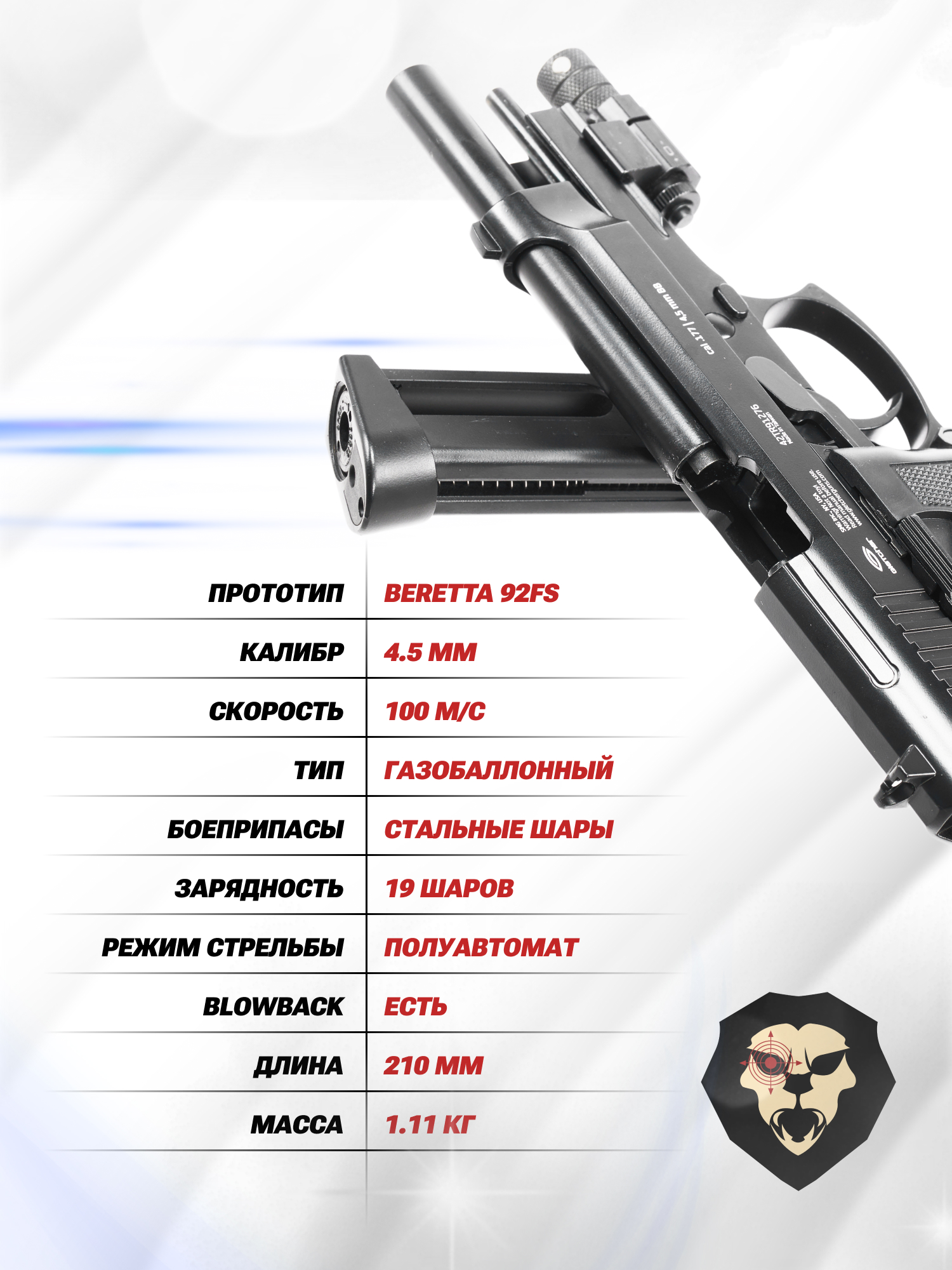 Рынок пневматики ежегодно расширяется моделями как отечественного, так и зарубежного производства. Компания Глетчер пополнила товарный ряд газобаллонным пистолетом, который отличается не только высокой степенью детализации, но и функционалом. Образец станет отличным выбором для ценителей итальянской Беретты и удивит своим продуманным устройством.