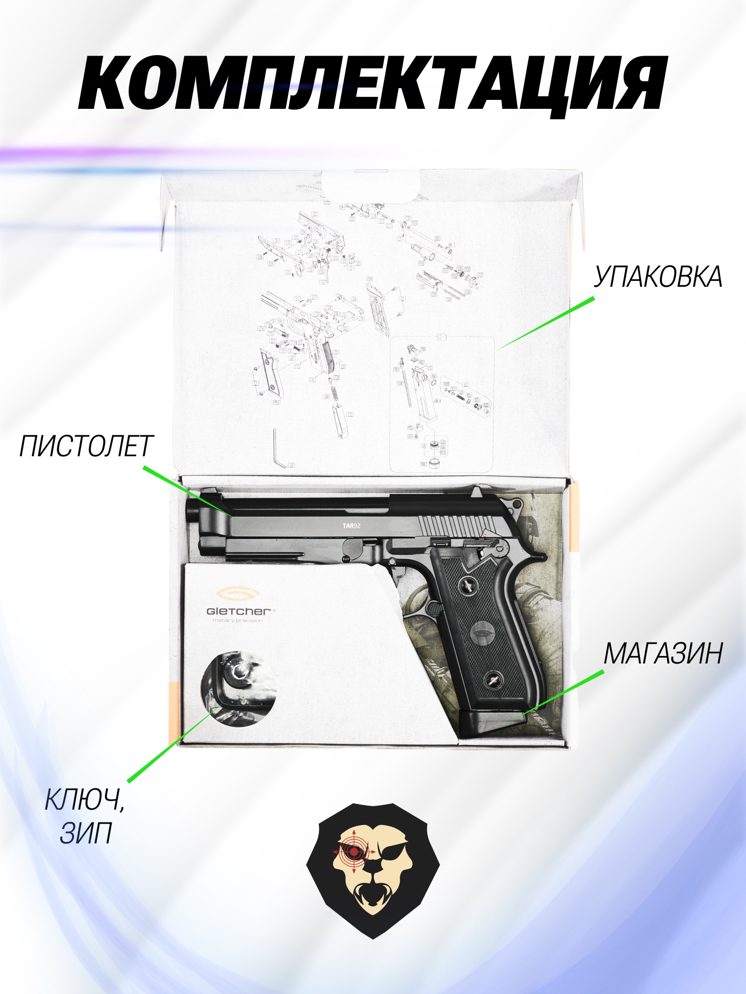 Информация о товаре "Пневматический пистолет Gletcher TAR 92 Auto 4.5 мм (Beretta 92FS)" носит ознакомительный характер, и не является публичной офертой, определяемой положениями Статьи 437 Гражданского кодекса Российской Федерации, характеристики, внешний вид, цвет и комплектация могут быть изменены производителем без уведомления.