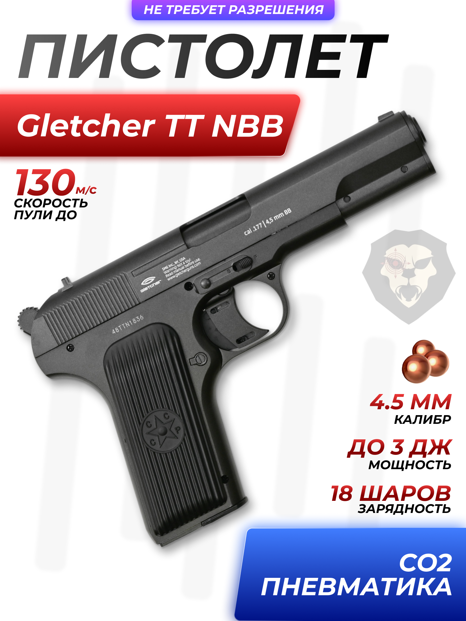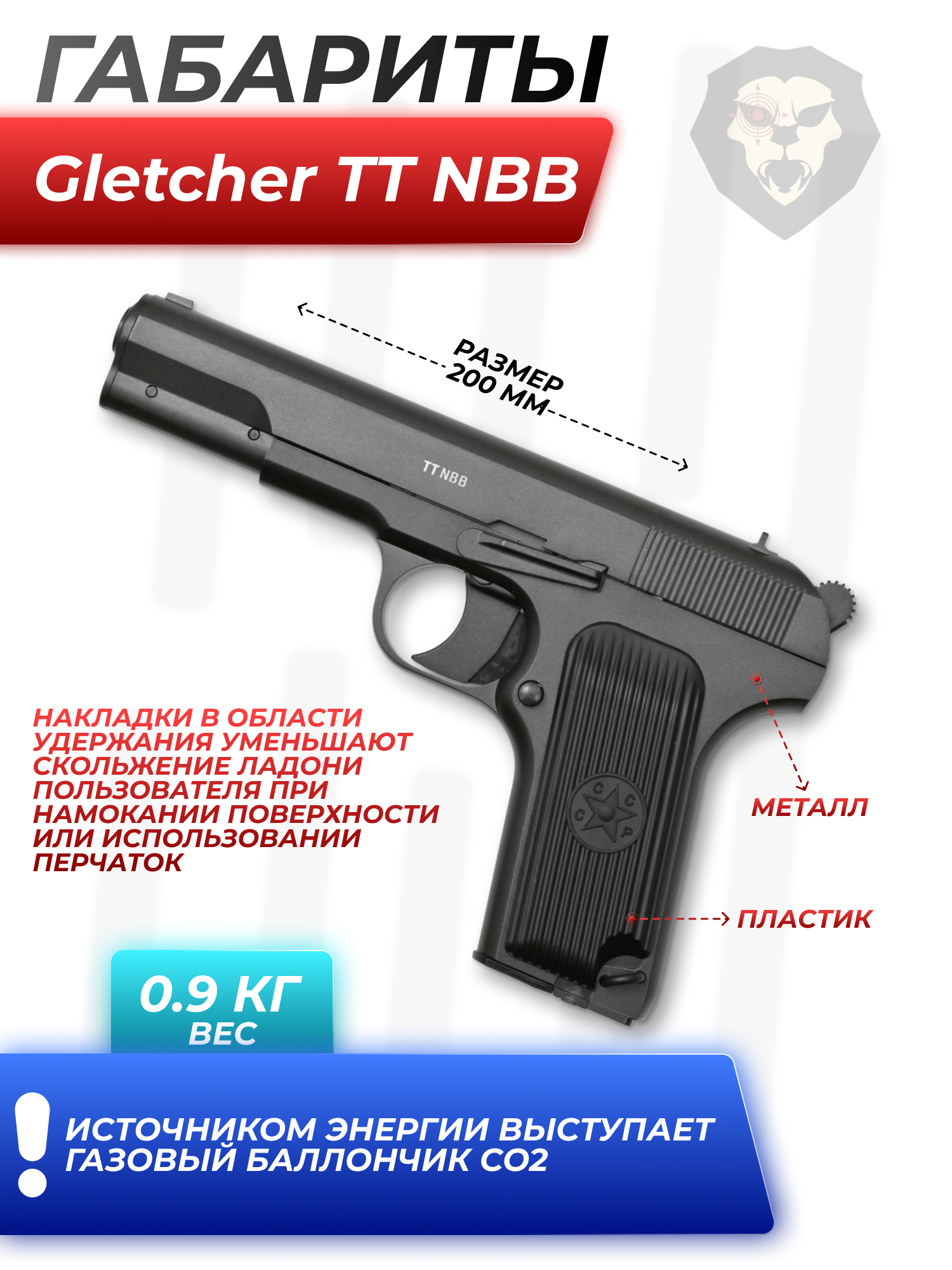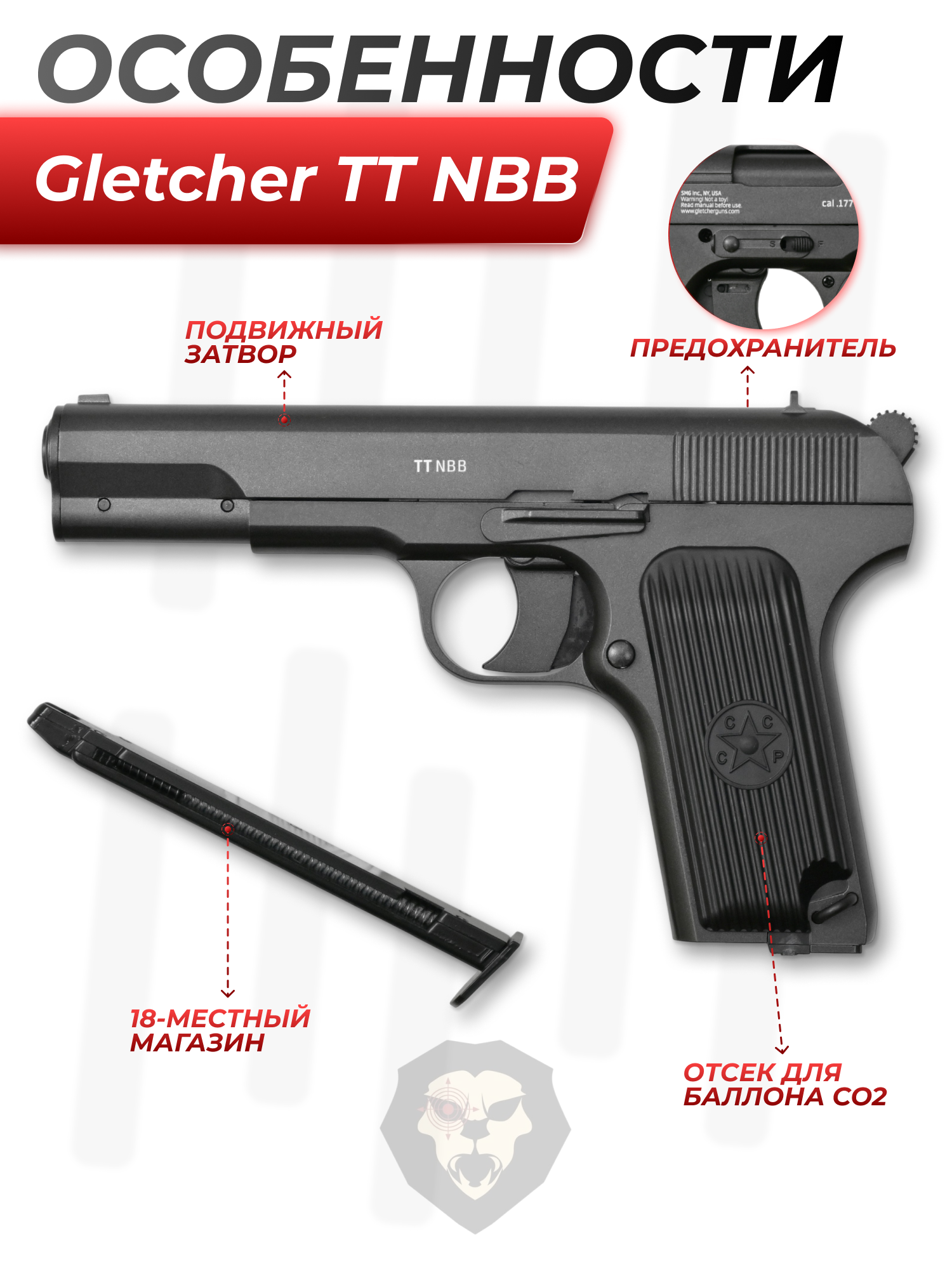 мощный пневматический пистолет, являющийся копией боевого ТТ, который стреляет со скоростью до 120 м/с ( так заявляет производитель в паспорте к устройству, более точные результаты измерений есть в видео обзоре пистолета Gletcher TT NBB от попади в десятку).