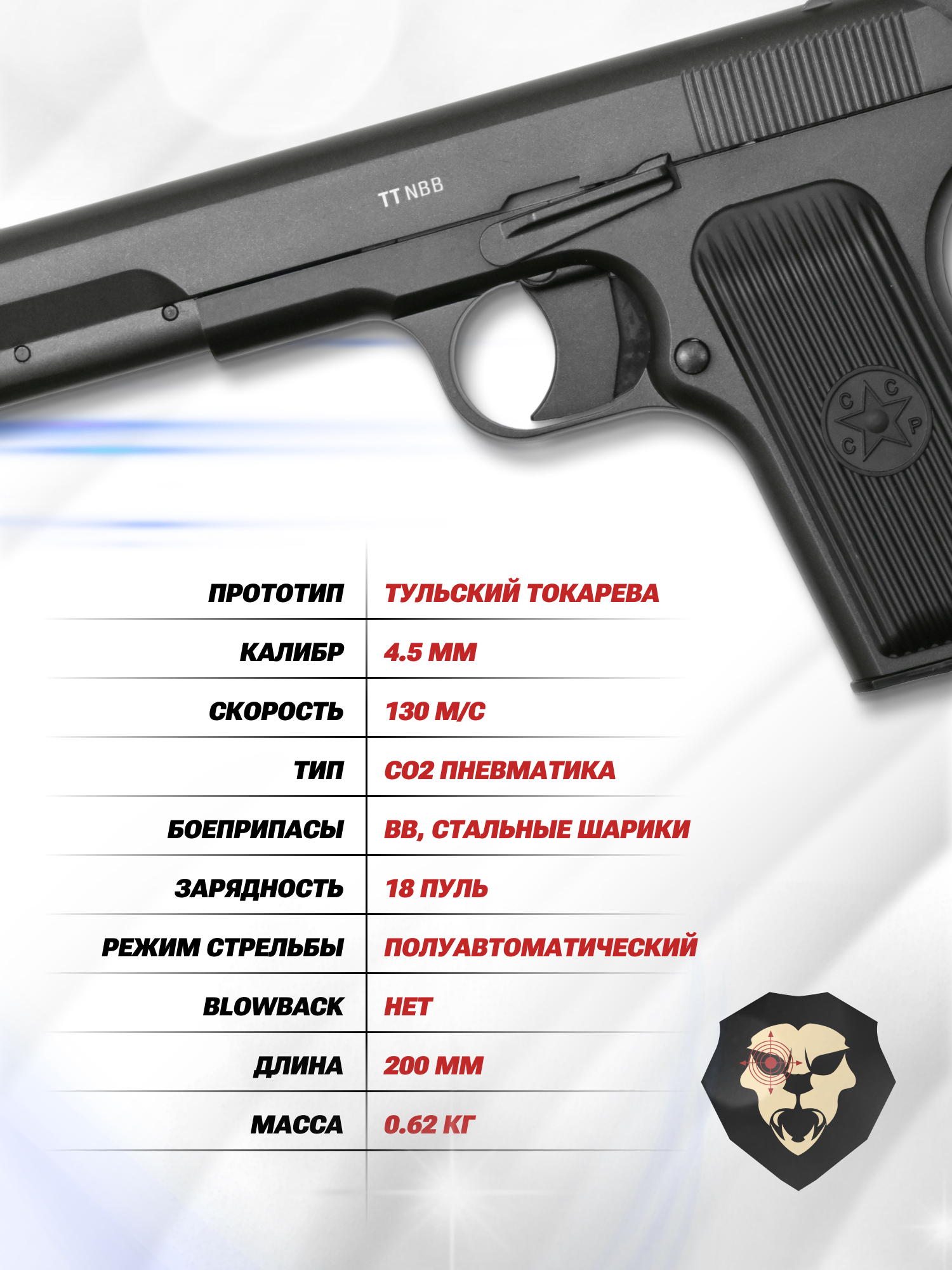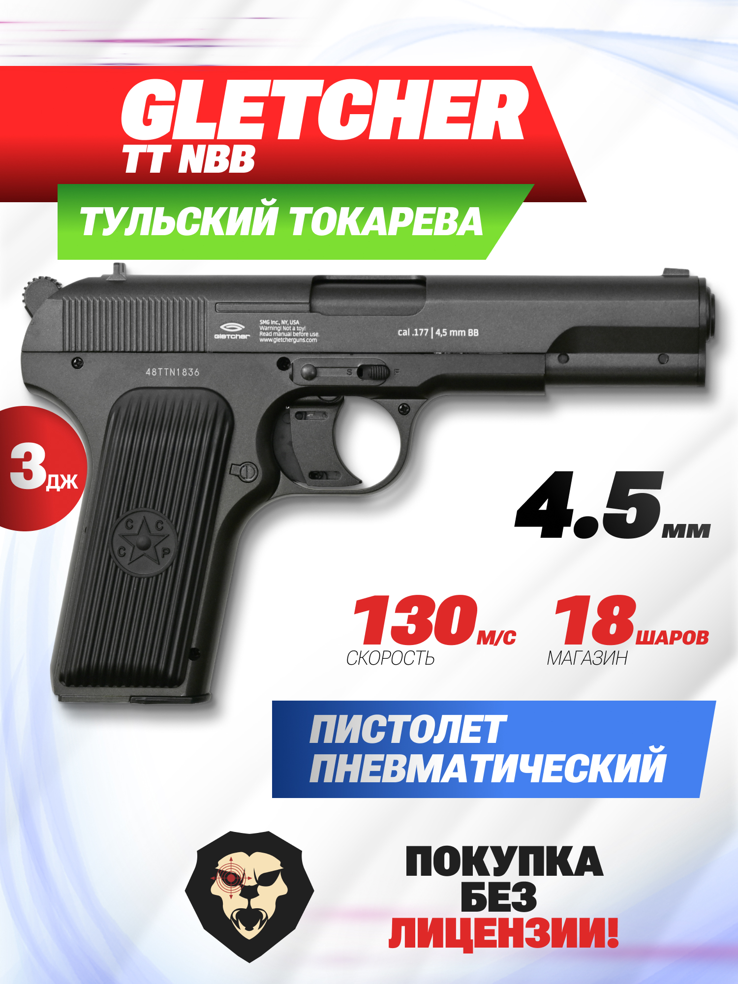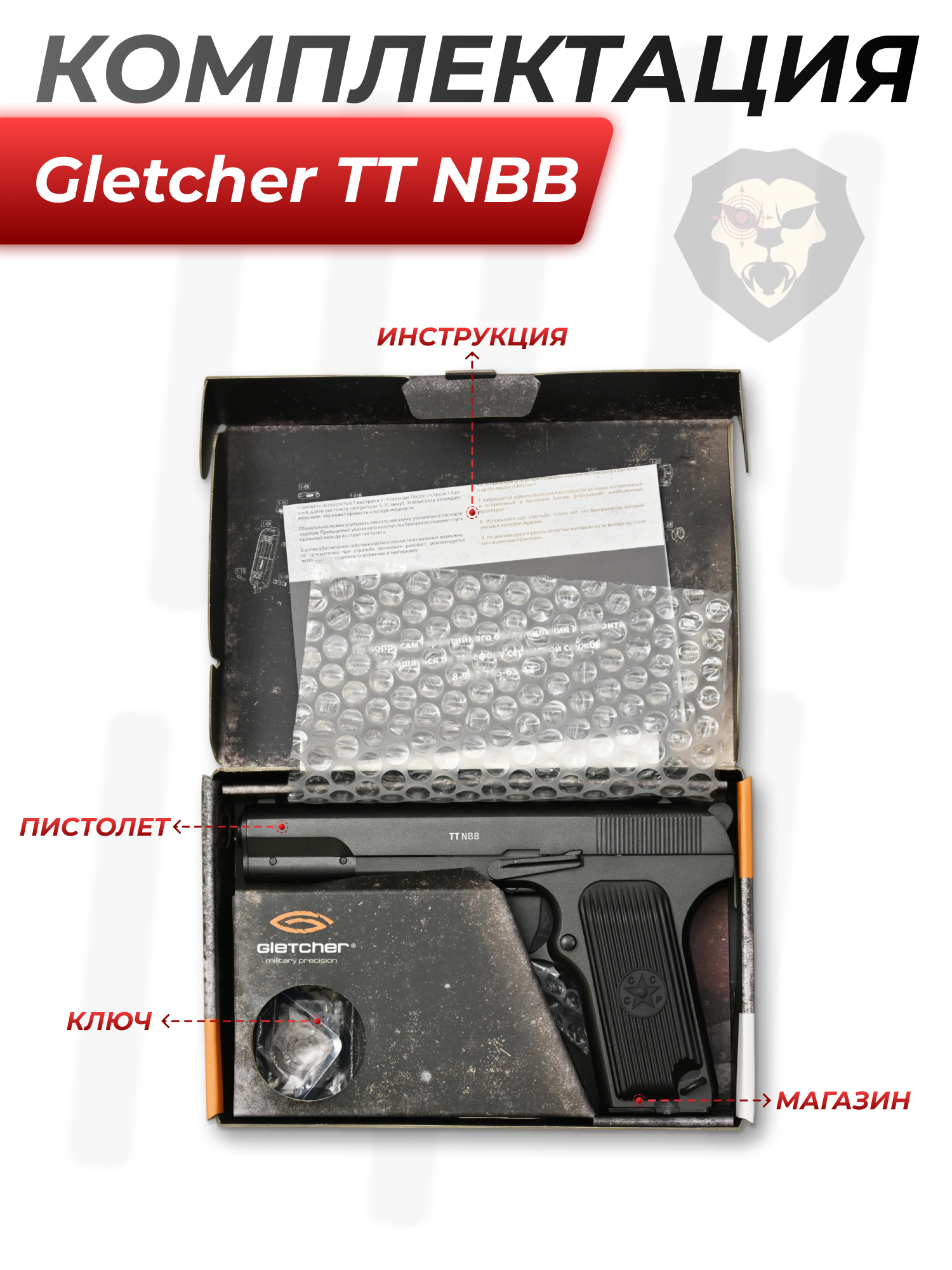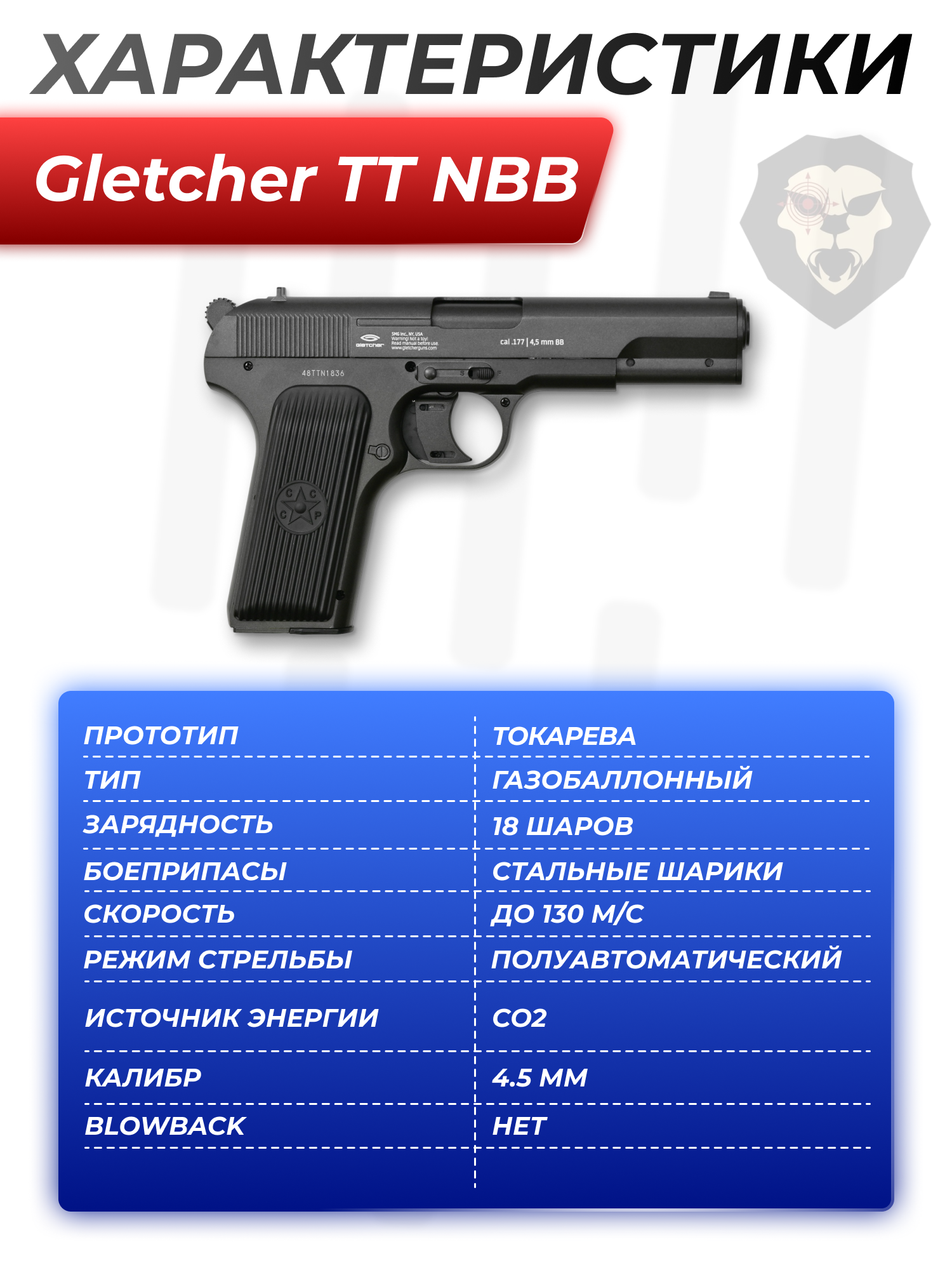 мощный пневматический пистолет, являющийся копией боевого ТТ, который стреляет со скоростью до 120 м/с ( так заявляет производитель в паспорте к устройству, более точные результаты измерений есть в видео обзоре пистолета Gletcher TT NBB от попади в десятку).