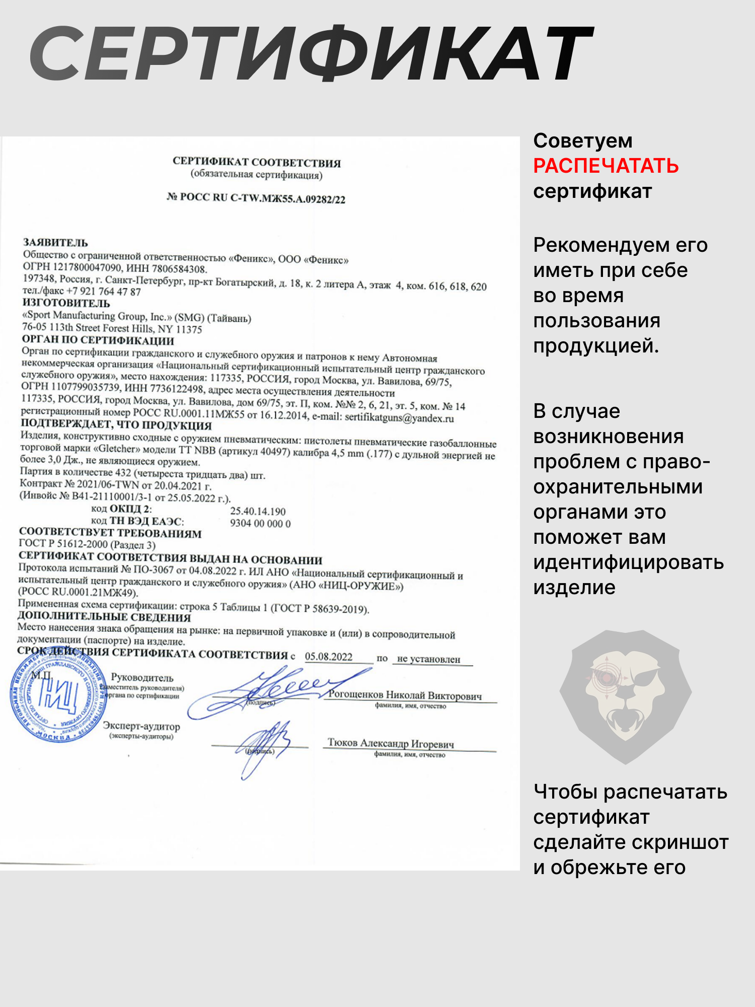 Комплектация | Пистолет, упаковка, краткая документация, копия сертификата (по запросу покупателя) |