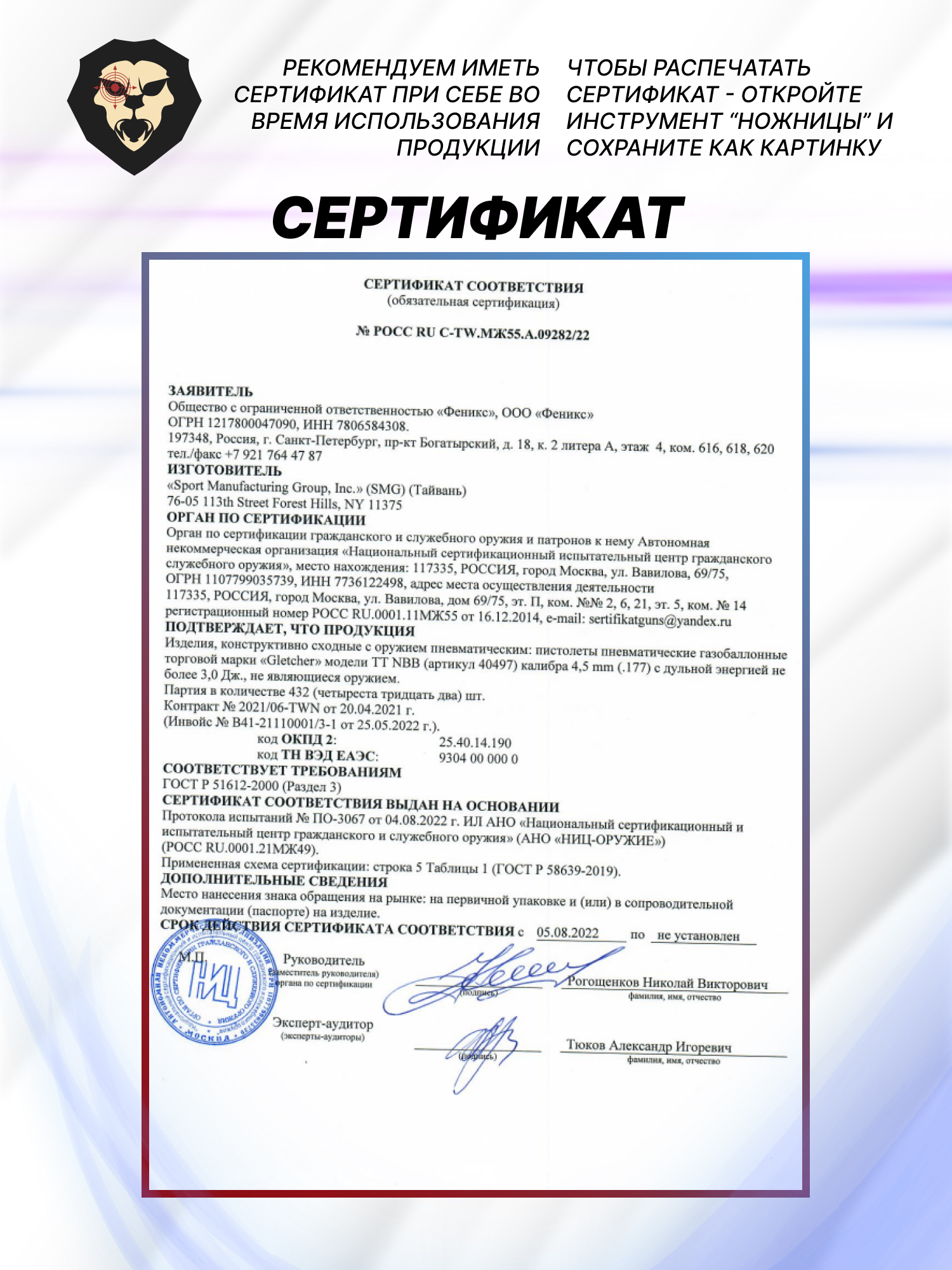 | Комплектация | Пистолет, упаковка, краткая документация, копия сертификата (по запросу покупателя) |