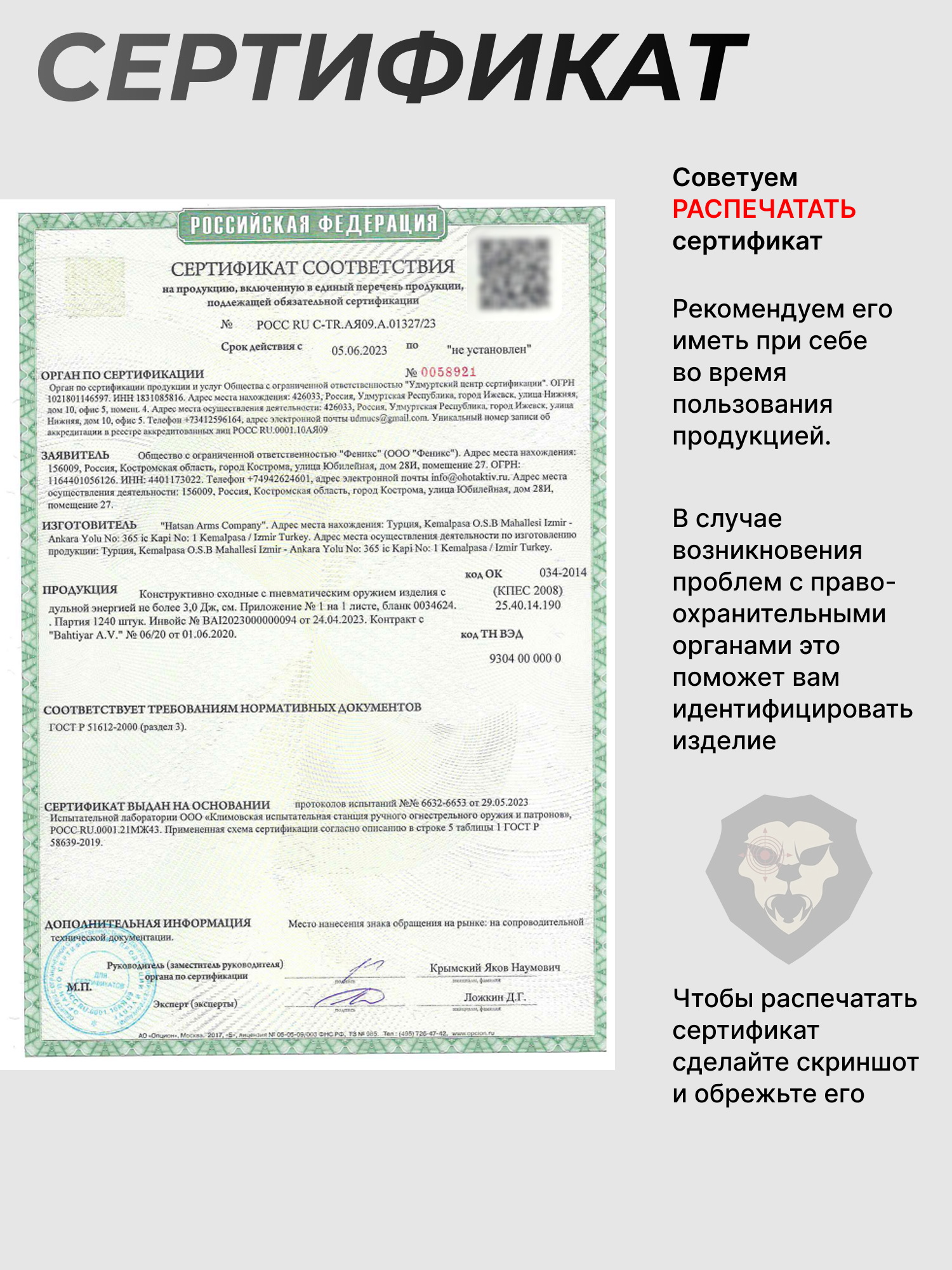 Комплектация | Пистолет, приклад, кейс, заправочный штуцер, упаковка, краткая документация, копия сертификата (по запросу покупателя) |