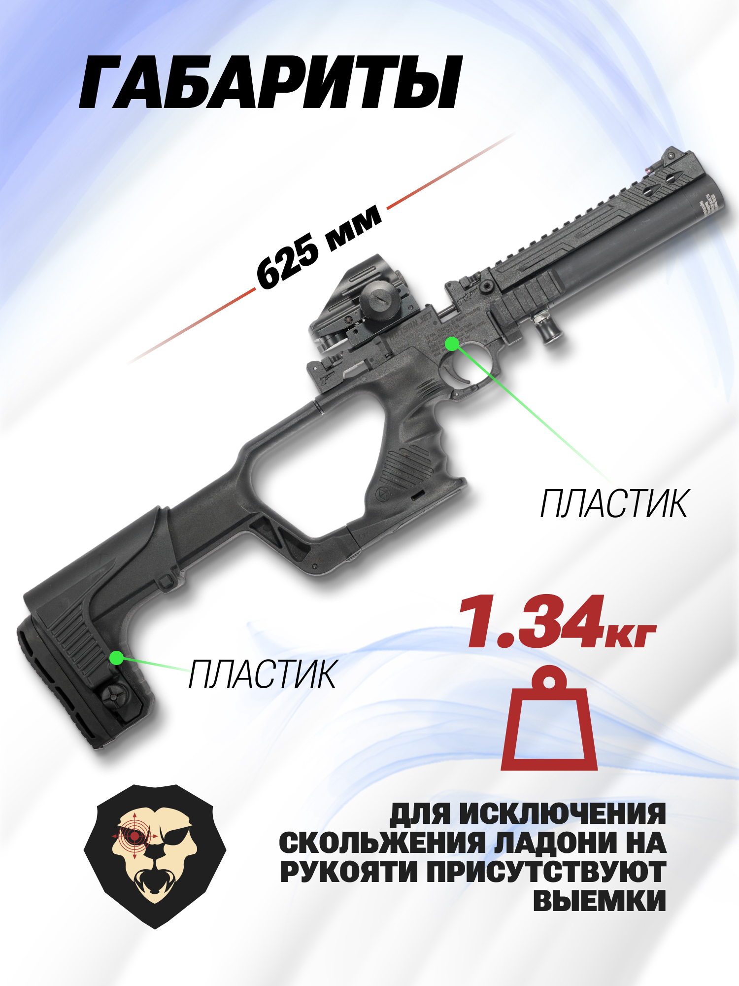 Длина образца составляет 380 мм, с присоединенным и разложенным прикладом - 625 мм. Масса пистолета Jet1 в форм-факторе «карабин» не превышает 1.34 кг, что делает оружие удобным для переноски и использования.