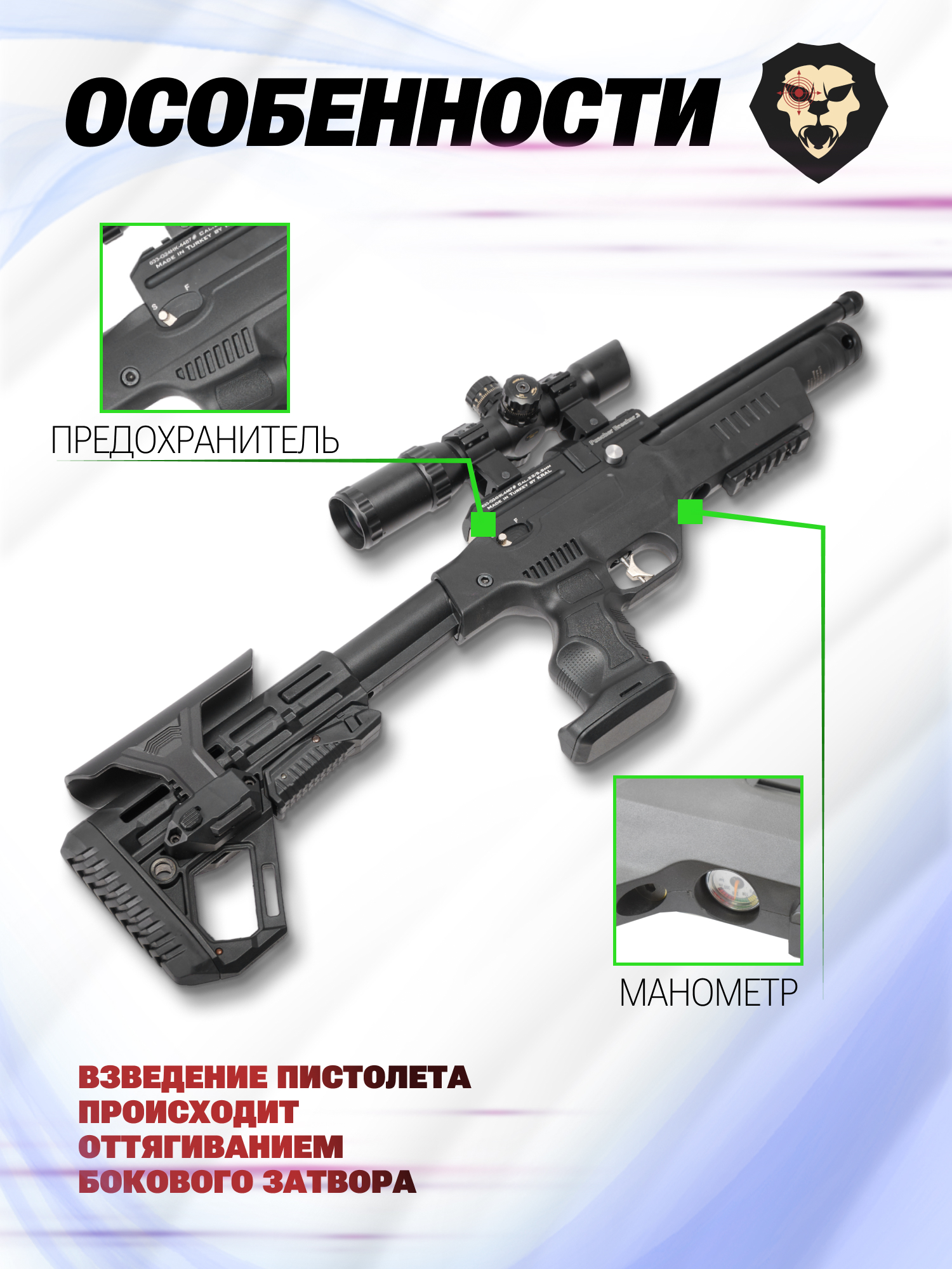 Внимание! Данная модель поставляется в разрешенной мощности для свободного приобретения на территории Российской Федерации. При этом в модели имеется возможность увеличения мощности путем замены части деталей или настройки конструкции, однако не стоит забывать о Федеральном законе «Об оружии» № 150 - ФЗ. В случае необходимости, опираясь на данный закон и руководствуясь им, возможно, потребуется получить разрешение от ЛЛР ГУ МВД России после вмешательства в конструкцию.