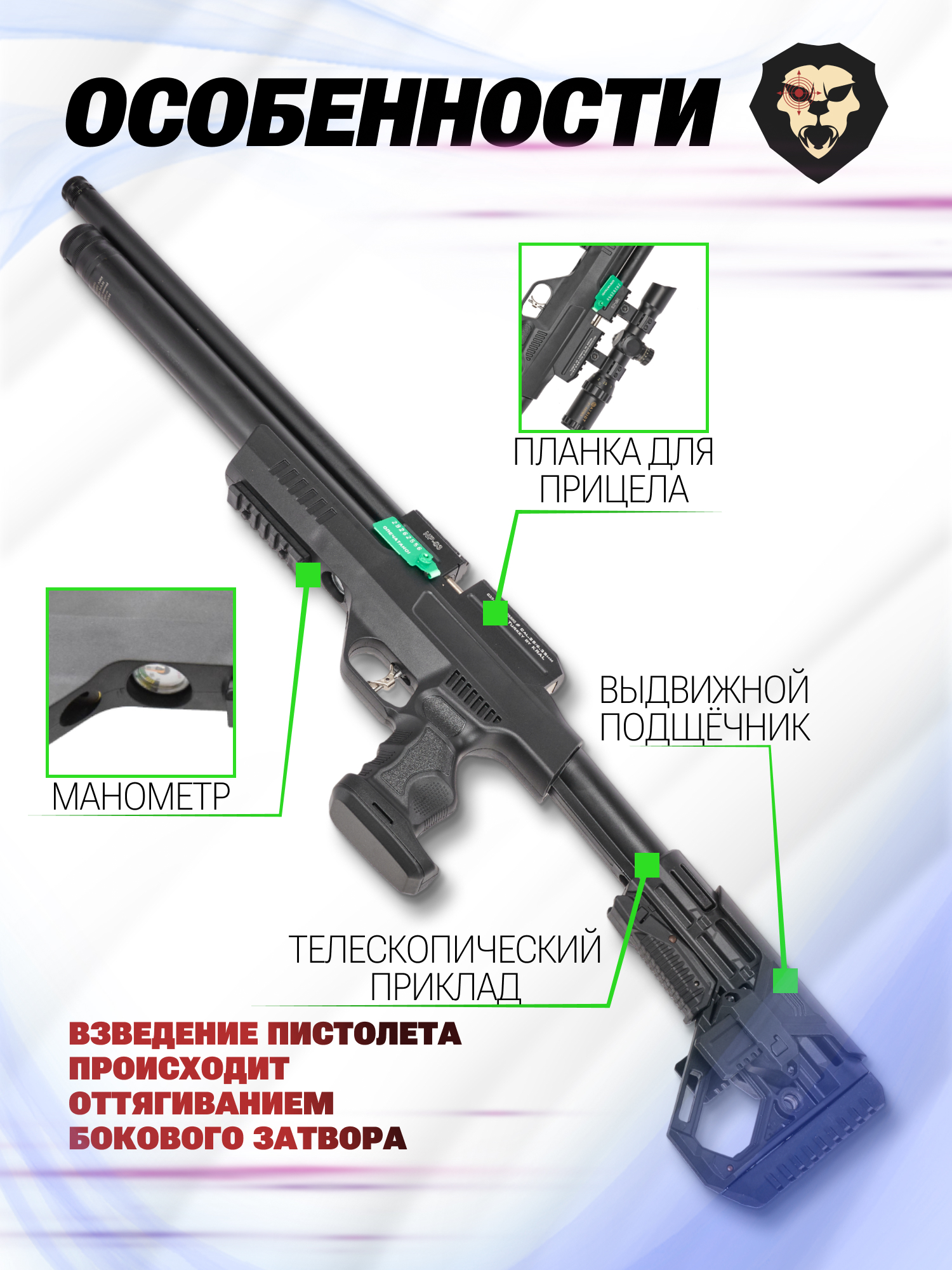 Представленный образец гражданской пневматики относится к категории оружия, в котором источником энергии для выстрела выступает сжатый под давлением воздух, закачивающийся в специализированный резервуар под стволом, объем которого позволяет заправить до 105 кубических сантиметров газообразной смеси. При нажатии на спусковой крючок ранее взведенный ударник бьет по пропускному клапану, за счет чего из баллона порционно высвобождается воздушная масса, которая разгоняет снаряд. Чтобы отследить нагнетаемое внутри ресивера давление изготовитель разместил под цевьем манометр.
