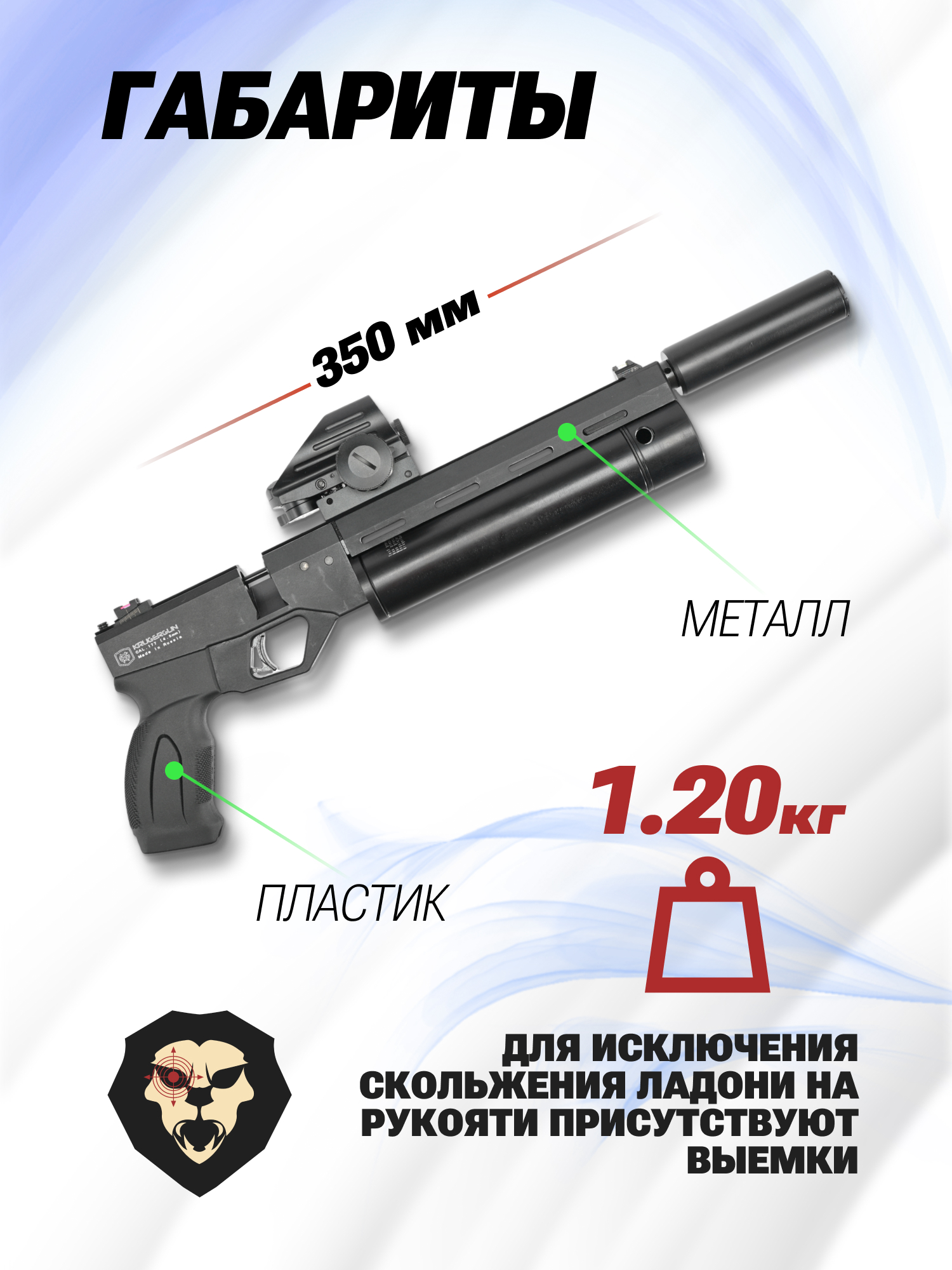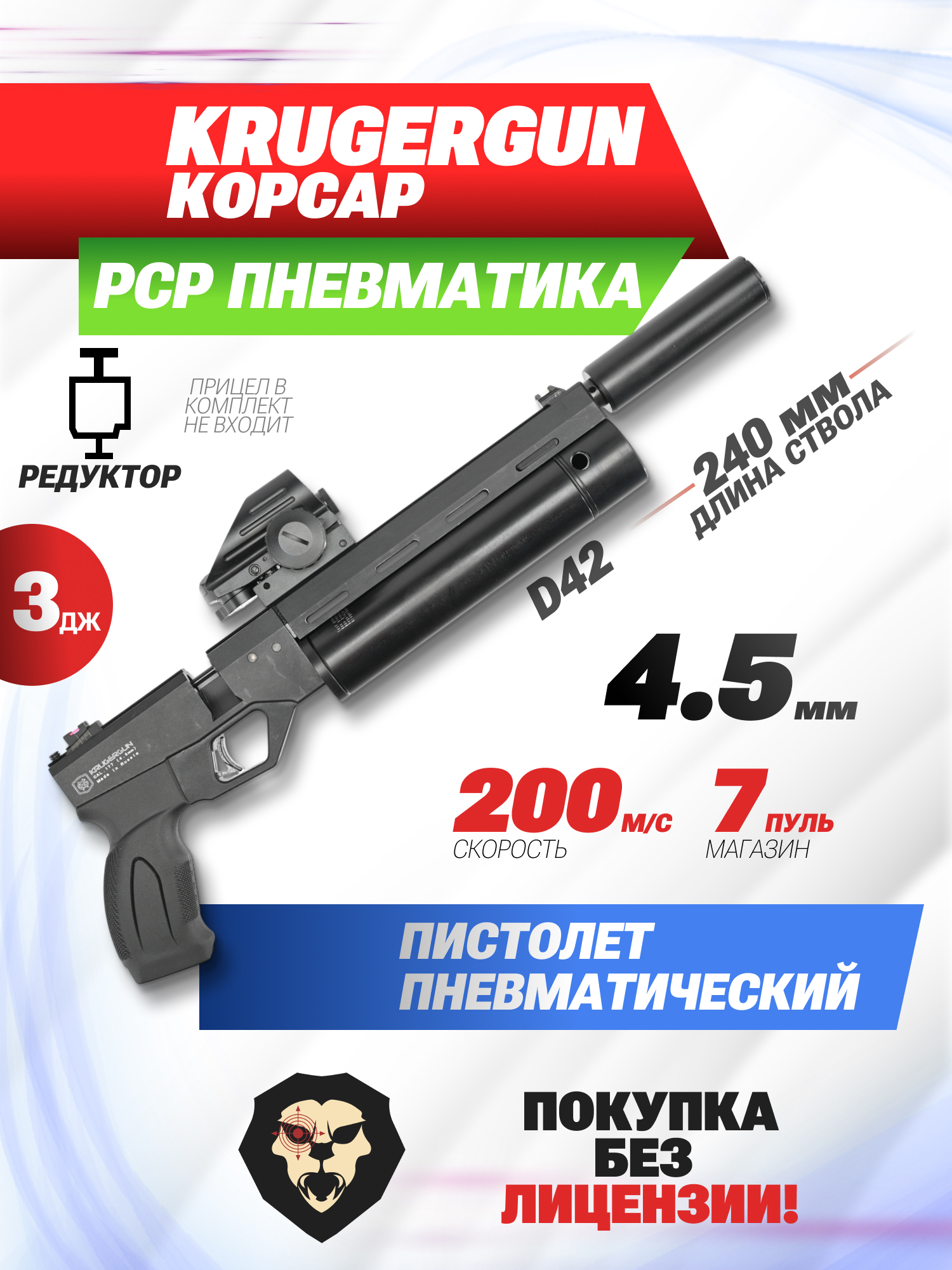 Информация о товаре "Пневматический пистолет Krugergun Корсар 4.5 мм (240 мм, редуктор, D42, с манометром)" носит ознакомительный характер, и не является публичной офертой, определяемой положениями Статьи 437 Гражданского кодекса Российской Федерации, характеристики, внешний вид, цвет и комплектация могут быть изменены производителем без уведомления.