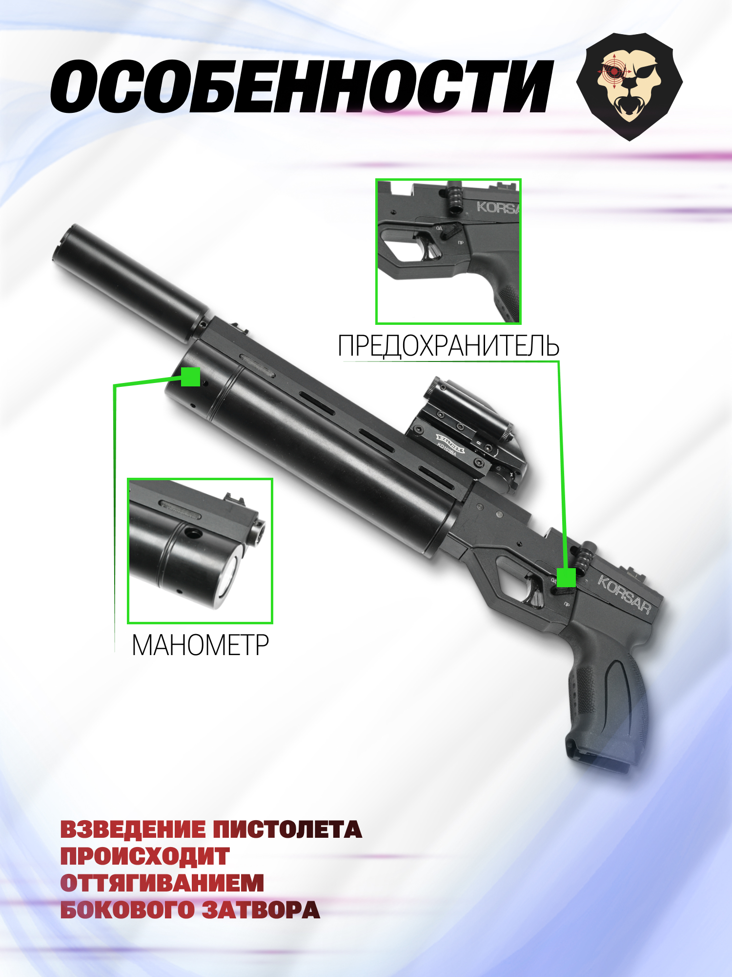 Пистолет Корсар от Крюгера оснащается флажковым предохранителем на левой части рукояти, задача которого защитить пользователя и окружающих от произвольного неконтролируемого выстрела. Кроме того, наличие предохранителя – это требование российских законов, регулирующих оборот пневматического оружия.