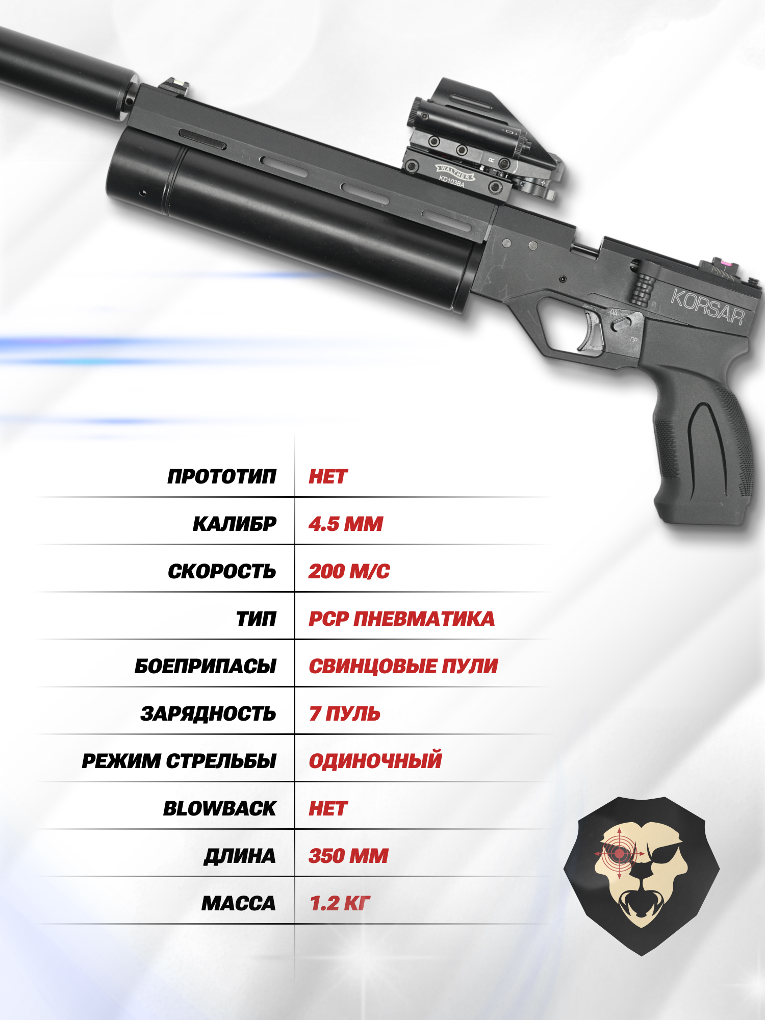 | Комплектация | Пистолет, магазин, модератор, упаковка, заправочный штуцер, краткая документация, набор РТИ, копия сертификата (по запросу покупателя) |