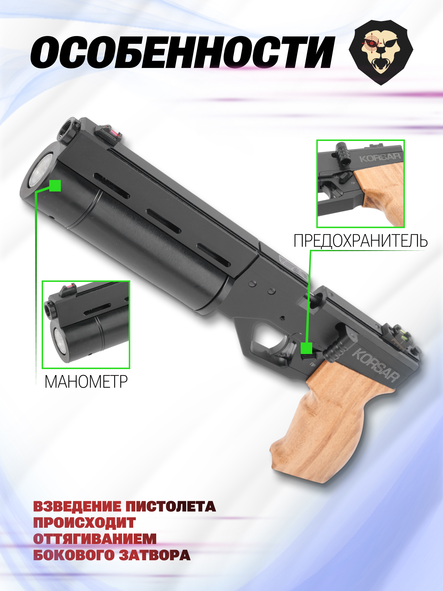 Пневматический пистолет Krugergun Корсар 5.5 мм (180 мм, D42, с манометром, с прикладом, дерево, редуктор) купить в интернет-магазине Popadiv10.