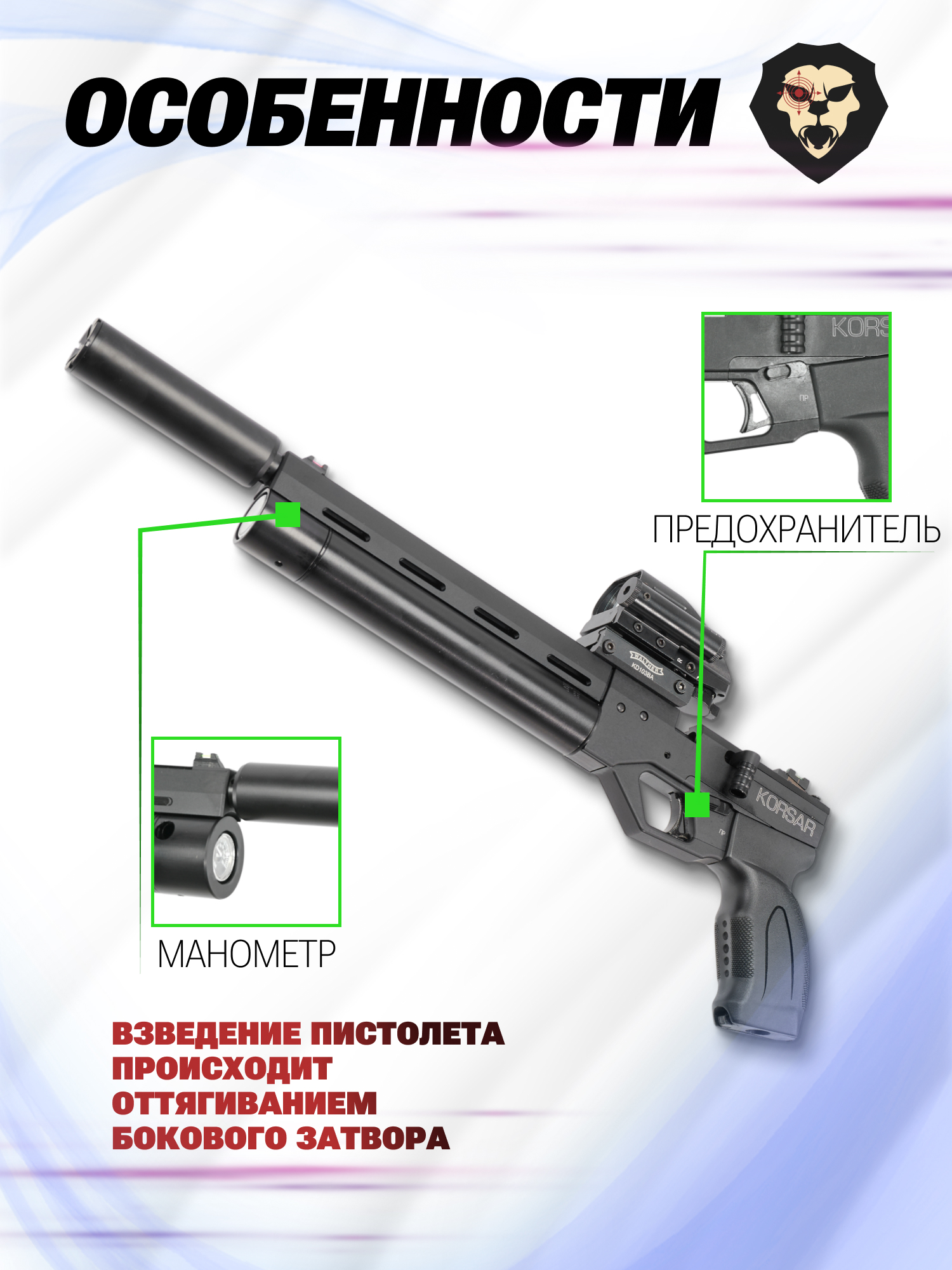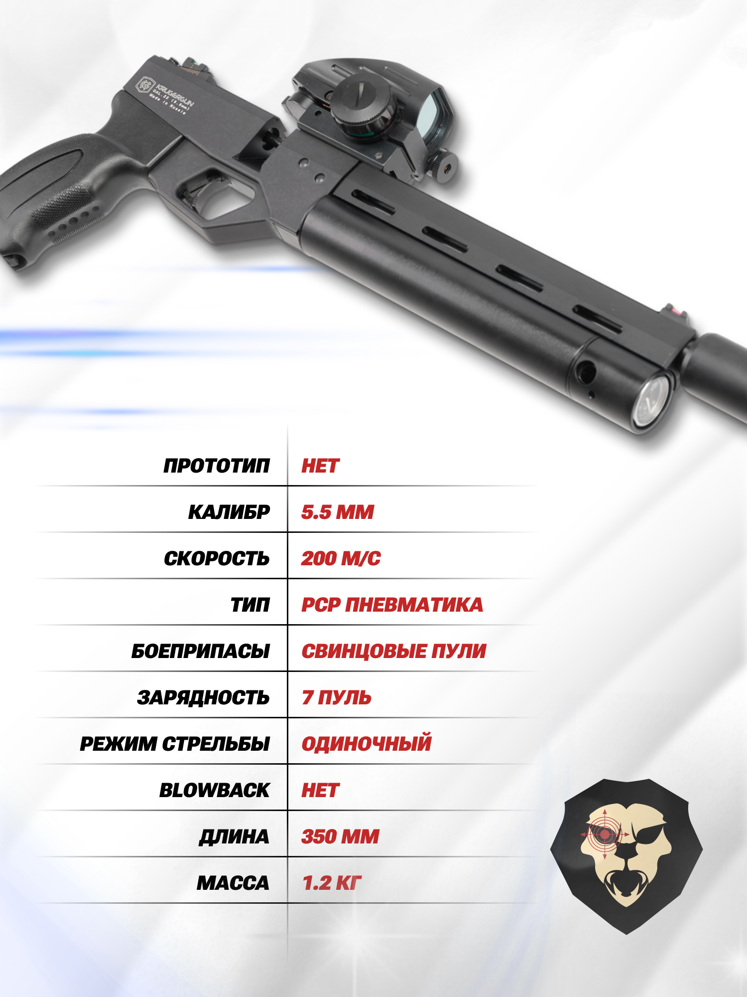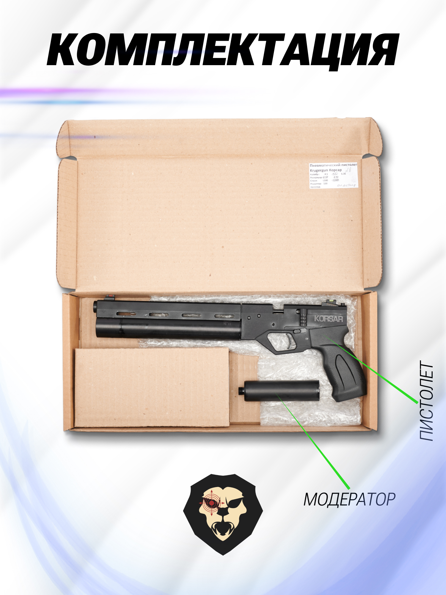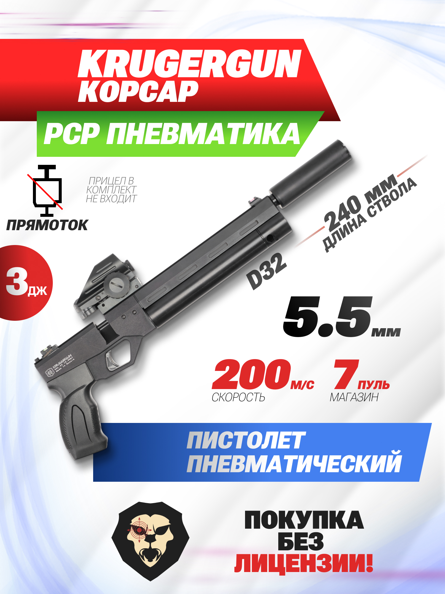 Информация о товаре "Пневматический пистолет KrugerGun Корсар 5.5 мм (d32, ствол 240, прямоток, манометр, пластик)" носит ознакомительный характер, и не является публичной офертой, определяемой положениями Статьи 437 Гражданского кодекса Российской Федерации, характеристики, внешний вид, цвет и комплектация могут быть изменены производителем без уведомления.