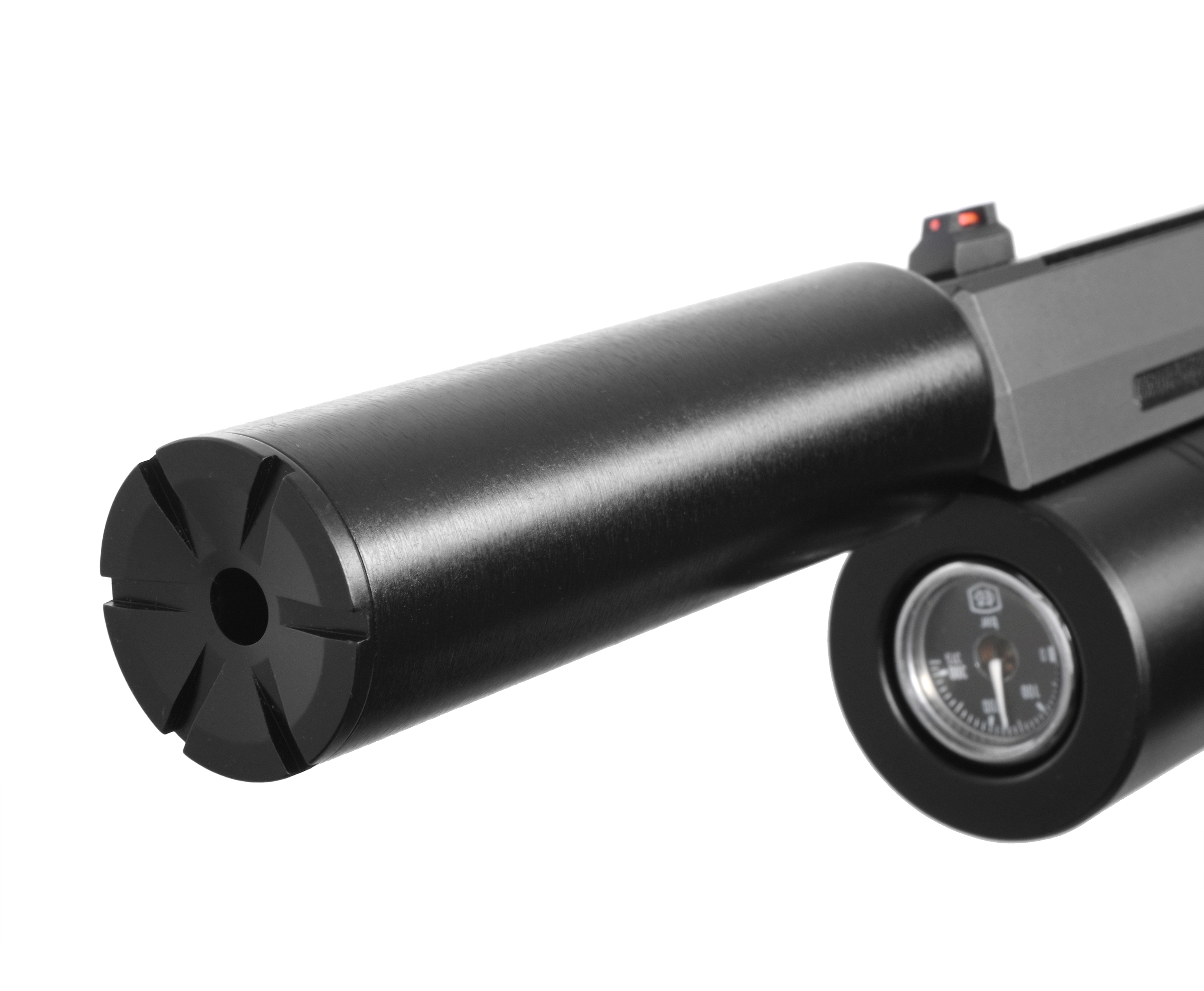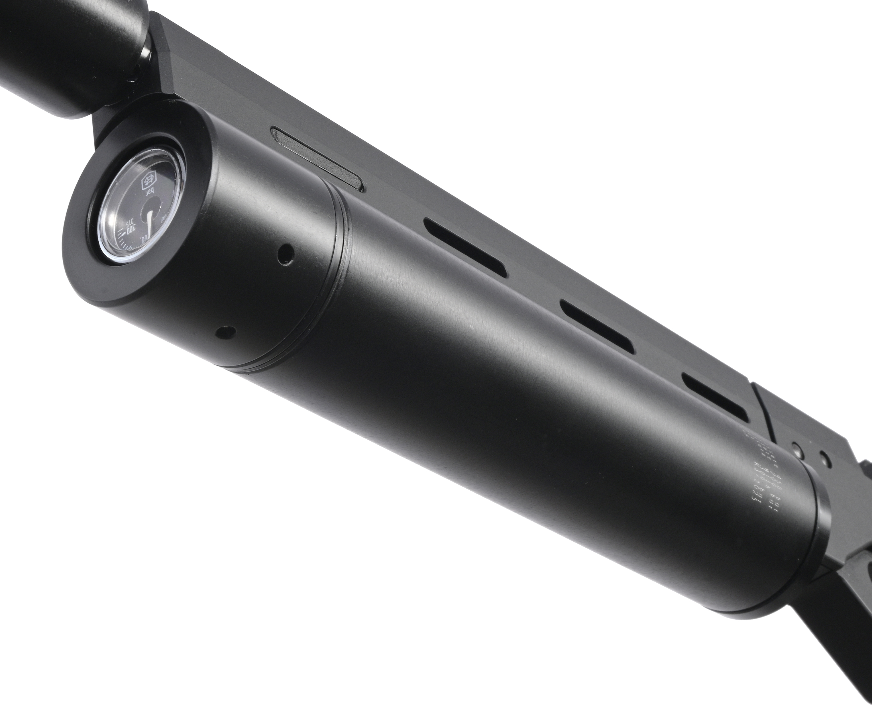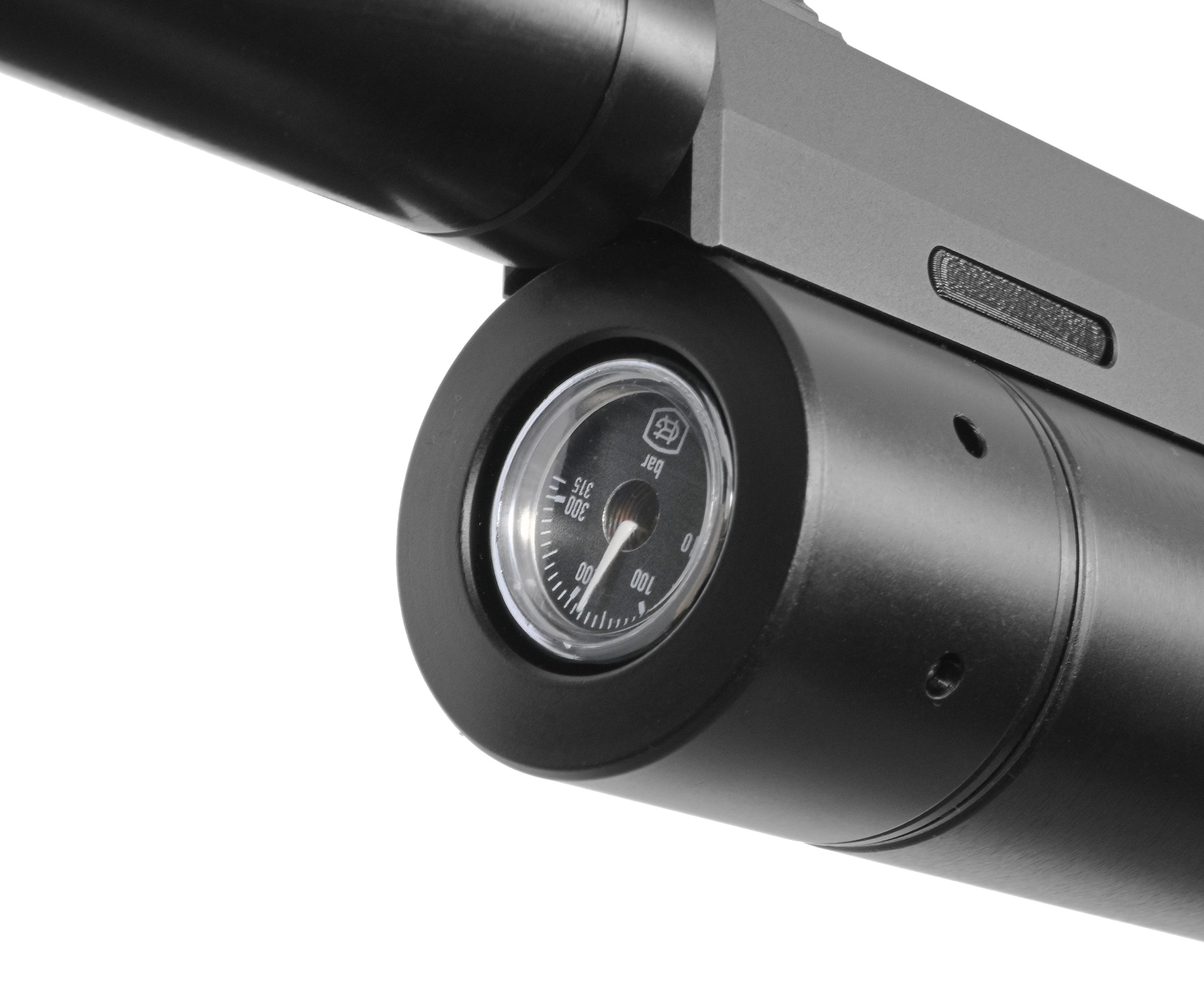 Заправлять баллон рекомендуется не выше 300 Бар, а газораспределение происходит по прямоточному принципу. Для оперативного контроля текущего давления в системе предусмотрен манометр. Датчик интегрирован с торца ресивера.