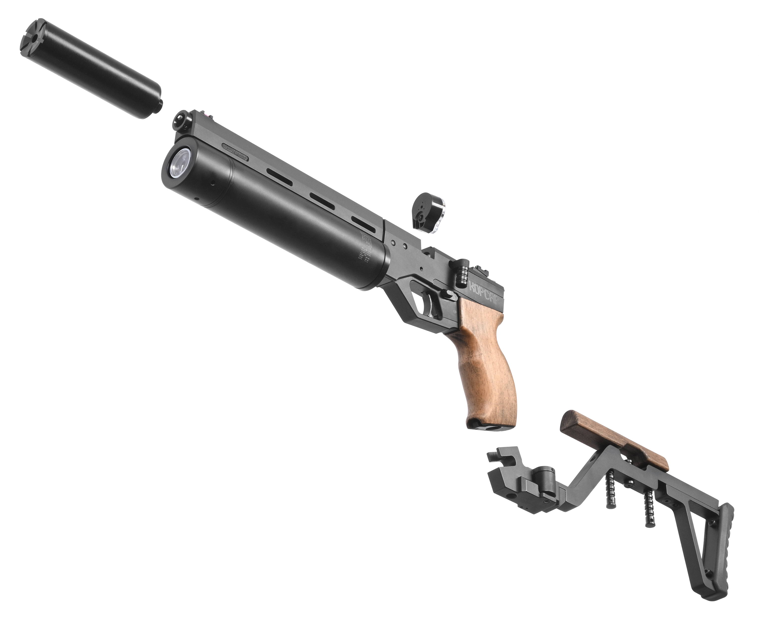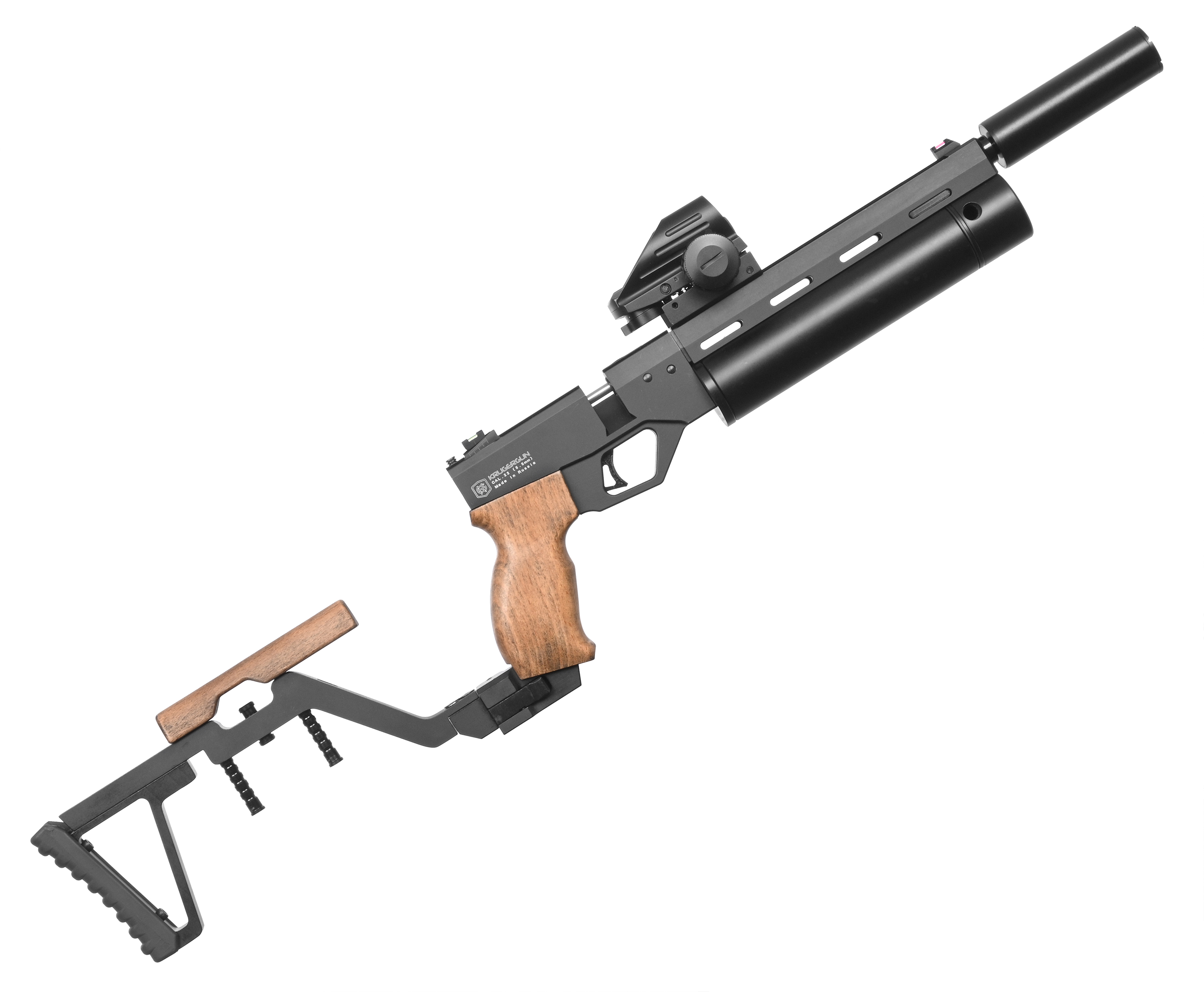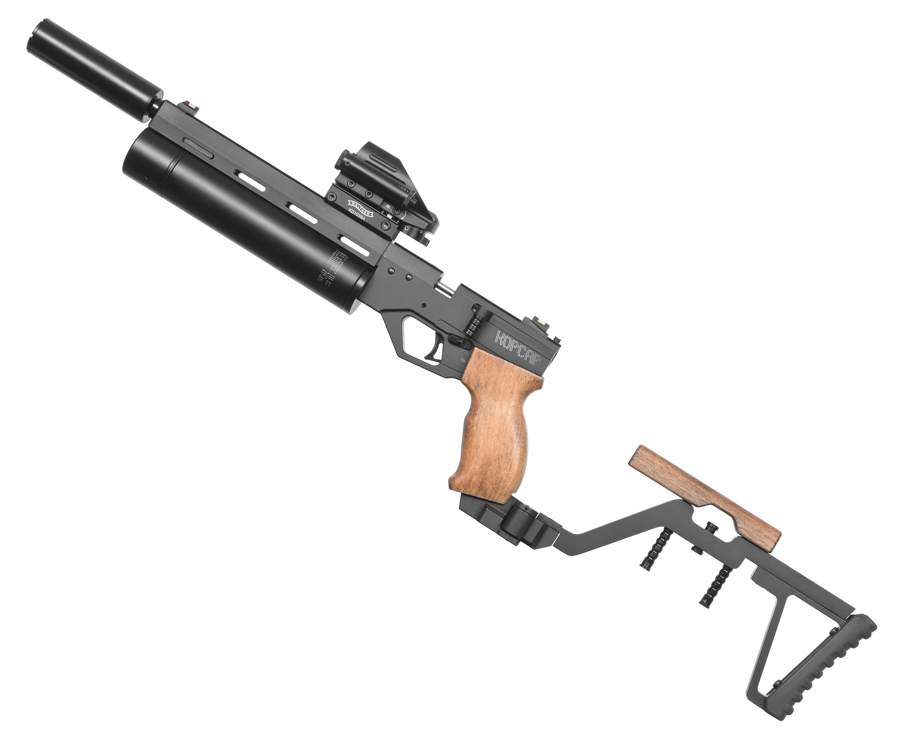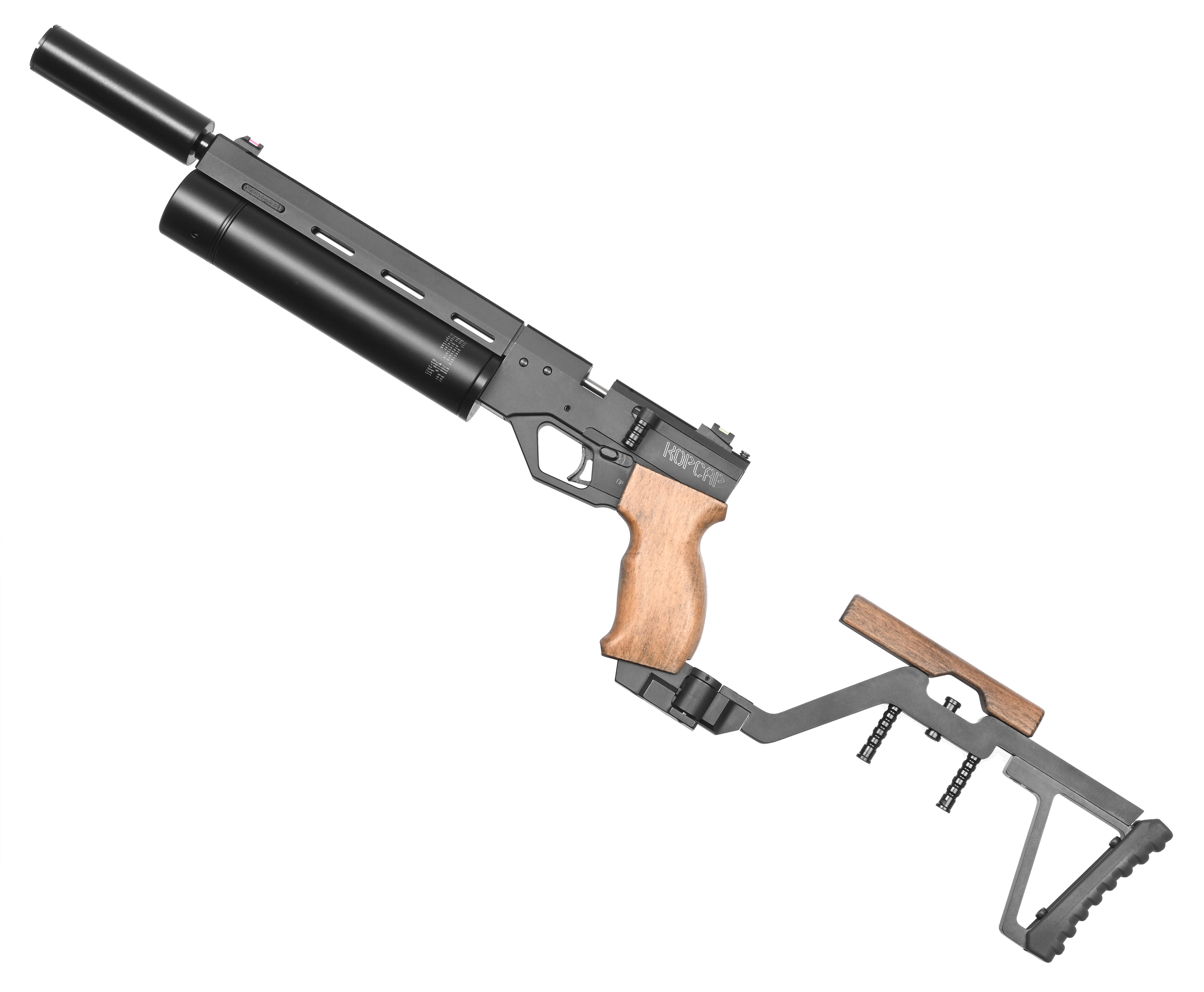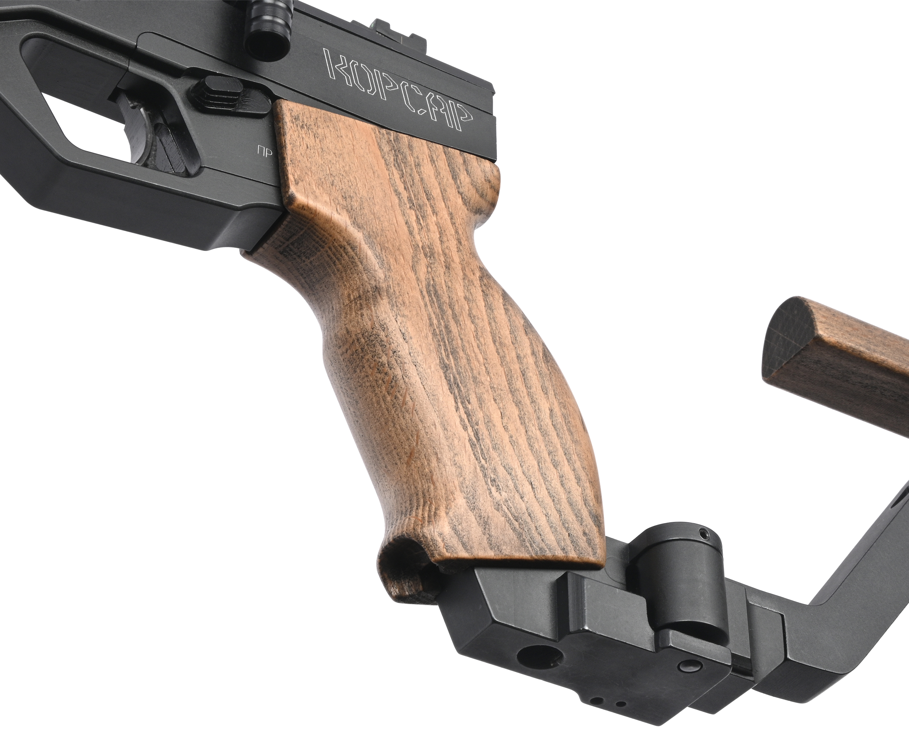 Пристального внимания заслуживает серия Корсар, которая регулярно совершенствуется и пополняется обновленными интересными моделями. В рассматриваемой конфигурации популярный пистолет поставляется совместно с прикладом, что позволяет трансформировать пневматику по мере необходимости в компактный мини-карабин. Устанавливается усовершенствованный плечевой упор с регулируемым деревянным подщечником и функцией складывания по нажатию фиксатора.
