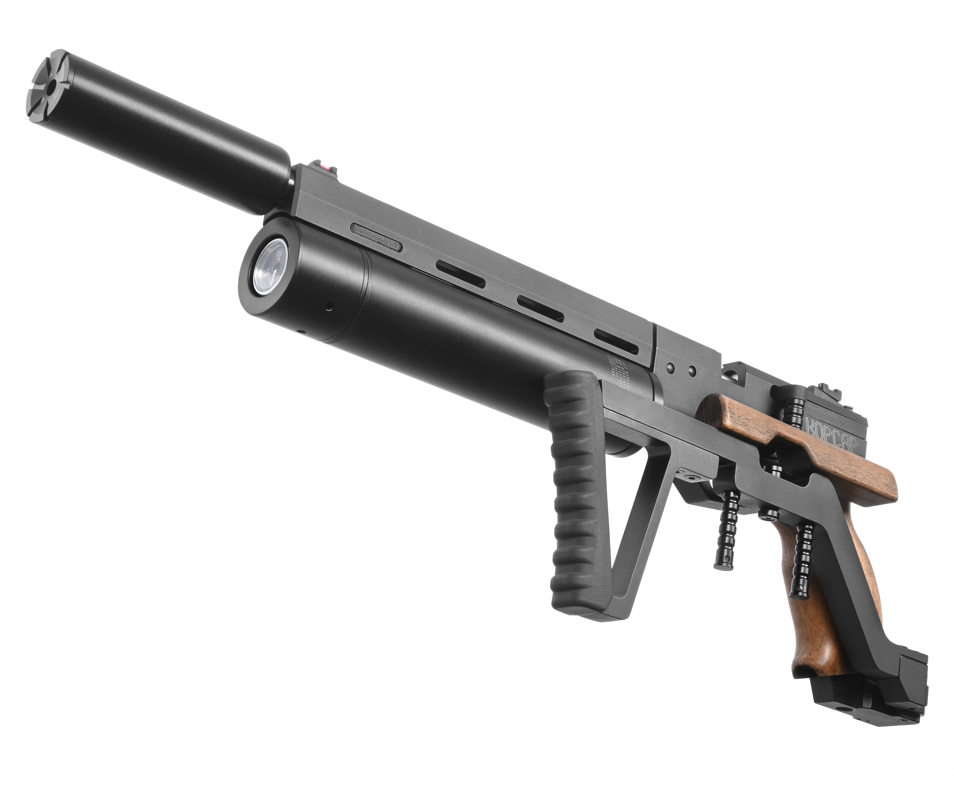 Из натурального материала также выполнена рукоять Корсара - дерево создает приятные тактильные ощущения при удержании и благоприятно сказывается на внешнем виде пистолета. Помимо эстетичного дизайна стрелковая единица может похвастаться высокой кучностью, что достигается установкой 24-сантиметрового нарезного ствола со съемным модератором. Реализовать потенциал точности поможет оптика, которая при желании монтируется на «Ласточкин хвост».