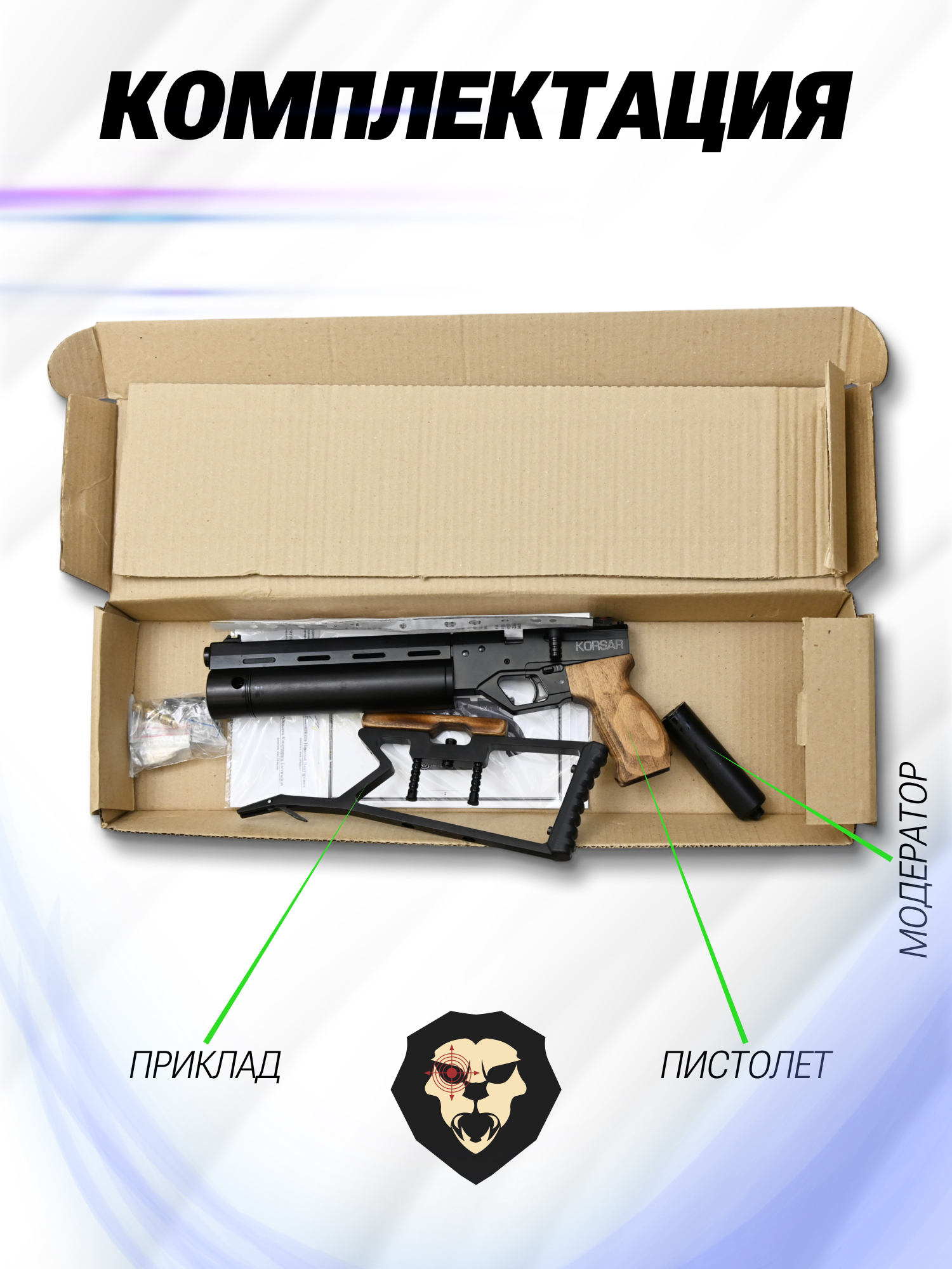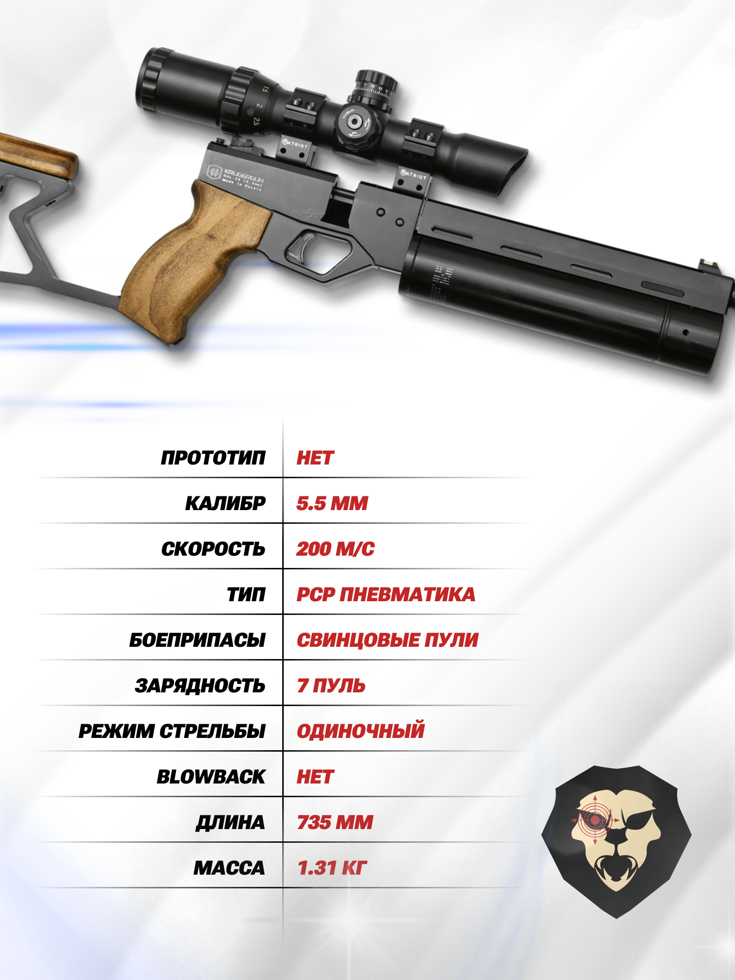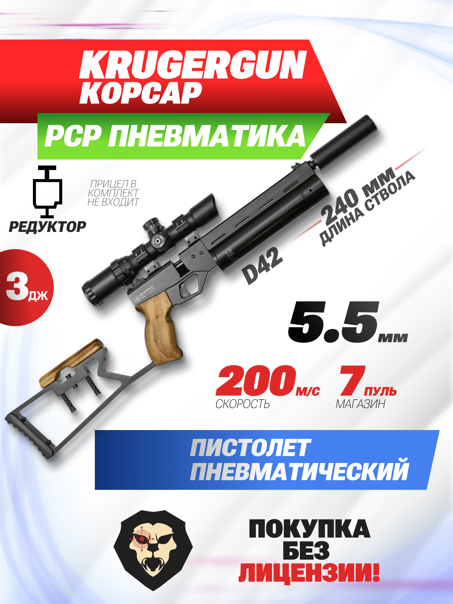 Информация о товаре "Пневматический пистолет KrugerGun Корсар 5.5 мм (D42, ствол 240, с манометром, с прикладом, дерево, редуктор)" носит ознакомительный характер, и не является публичной офертой, определяемой положениями Статьи 437 Гражданского кодекса Российской Федерации, характеристики, внешний вид, цвет и комплектация могут быть изменены производителем без уведомления.