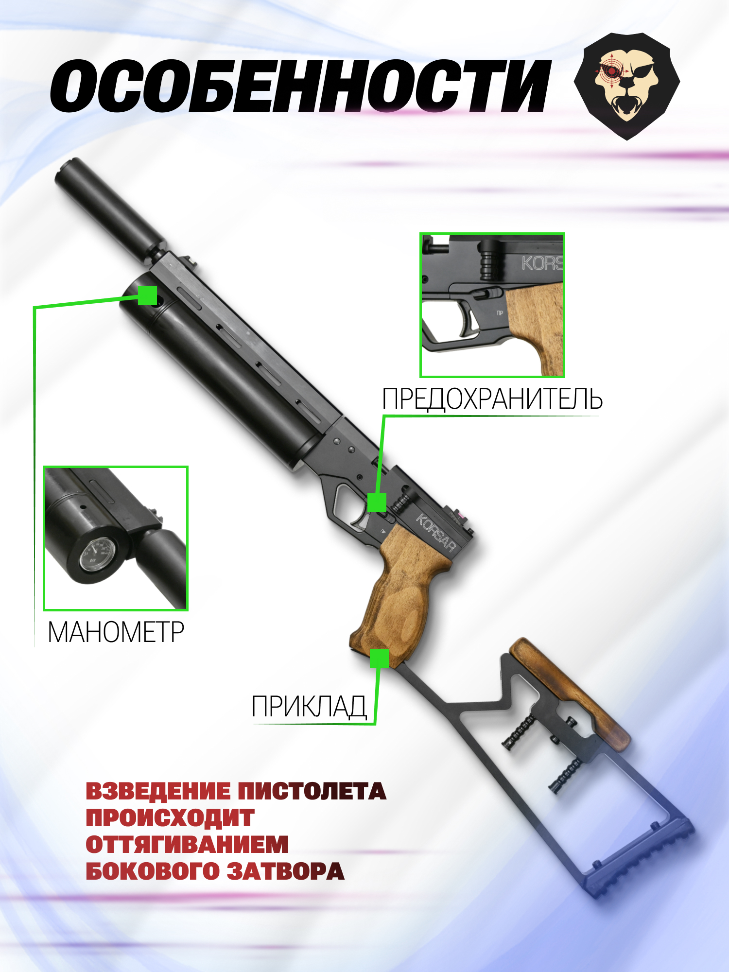 Пневматический пистолет KrugerGun Корсар 5.5 мм (D42, ствол 240, с манометром, с прикладом, дерево, редуктор) купить в интернет-магазине Popadiv10.