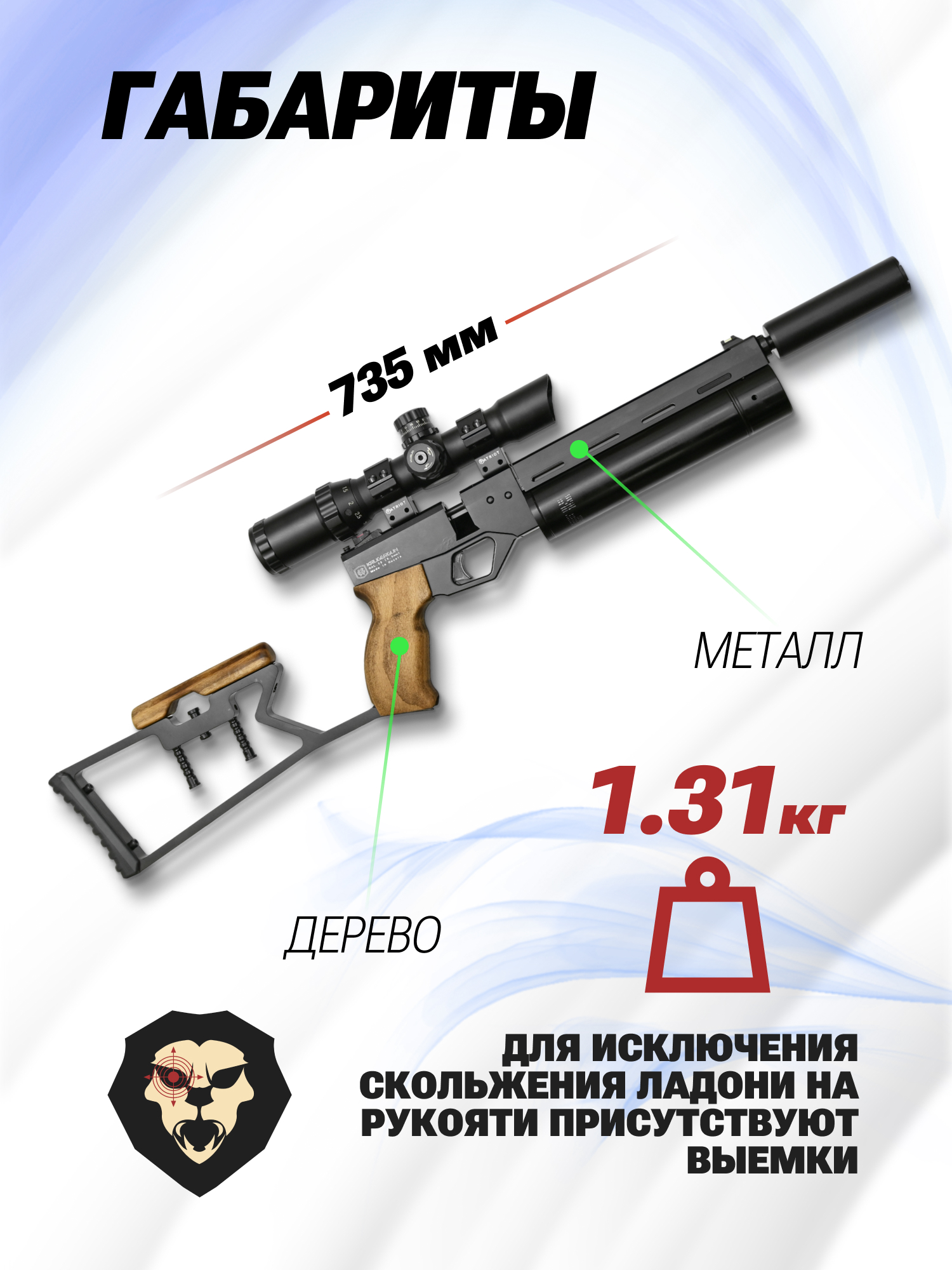 На изделие штатно устанавливают съемный Крюгерган модератор. Кроме того, в набор вошел и демонтируемый дюралевый приклад с регулировкой подщечника и мягким резиновым затыльником-упором. Для установки прицельных устройств имеется Ласточкин хвост на 11 мм. Кроме того, в модели есть штатный комплекс из мушки и целика.