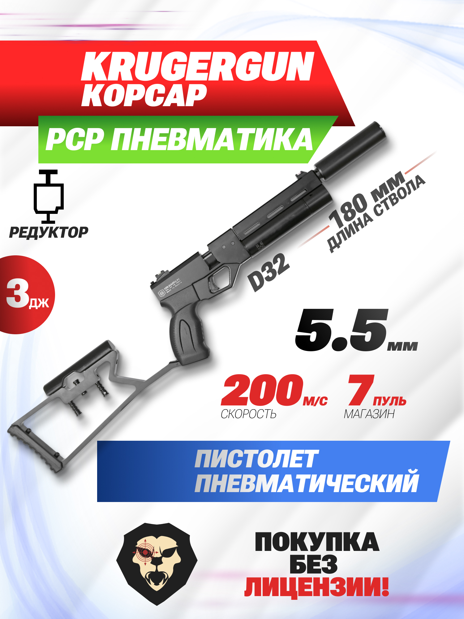 Информация о товаре "Пневматический пистолет Krugergun Корсар 5.5 мм (PCP, 180 мм, редуктор, D32, с манометром, с прикладом)" носит ознакомительный характер, и не является публичной офертой, определяемой положениями Статьи 437 Гражданского кодекса Российской Федерации, характеристики, внешний вид, цвет и комплектация могут быть изменены производителем без уведомления.