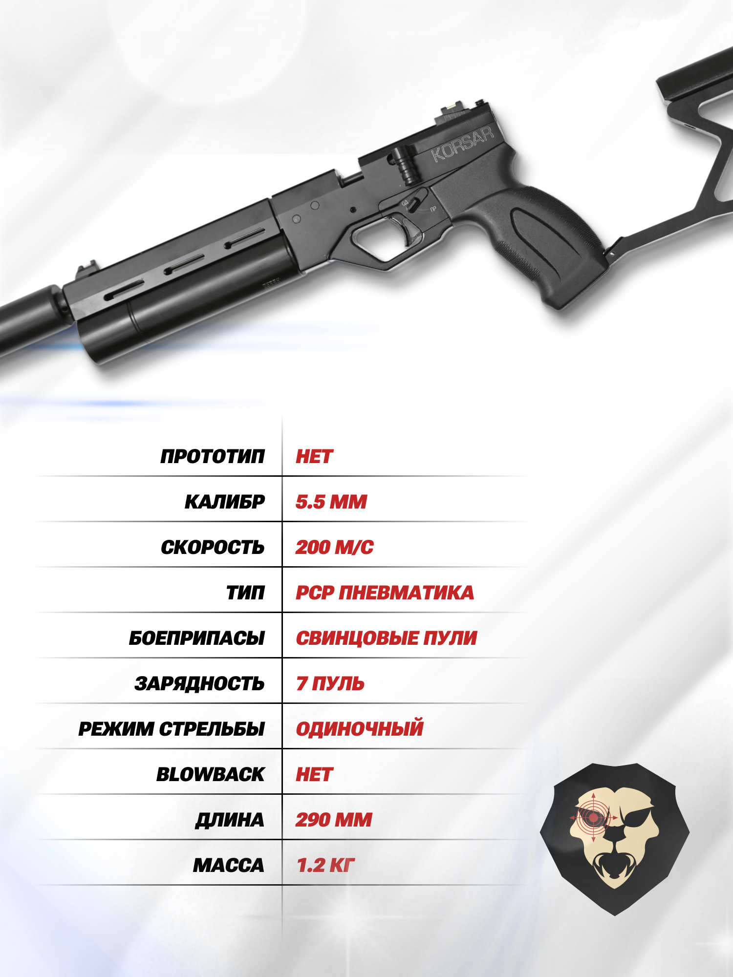 КрюгерГан пистолет Корсар – это пистолет, дульной энергии которого при выстреле достаточно чтобы разогнать боеприпас калибра 5.5 миллиметров до скоростей больше двухсот метров в секунду. Однако, чтобы соблюсти требования действующих в России законов, мощность изделия намеренно ограничивается в пороговой отметке не больше 3 Джоулей.