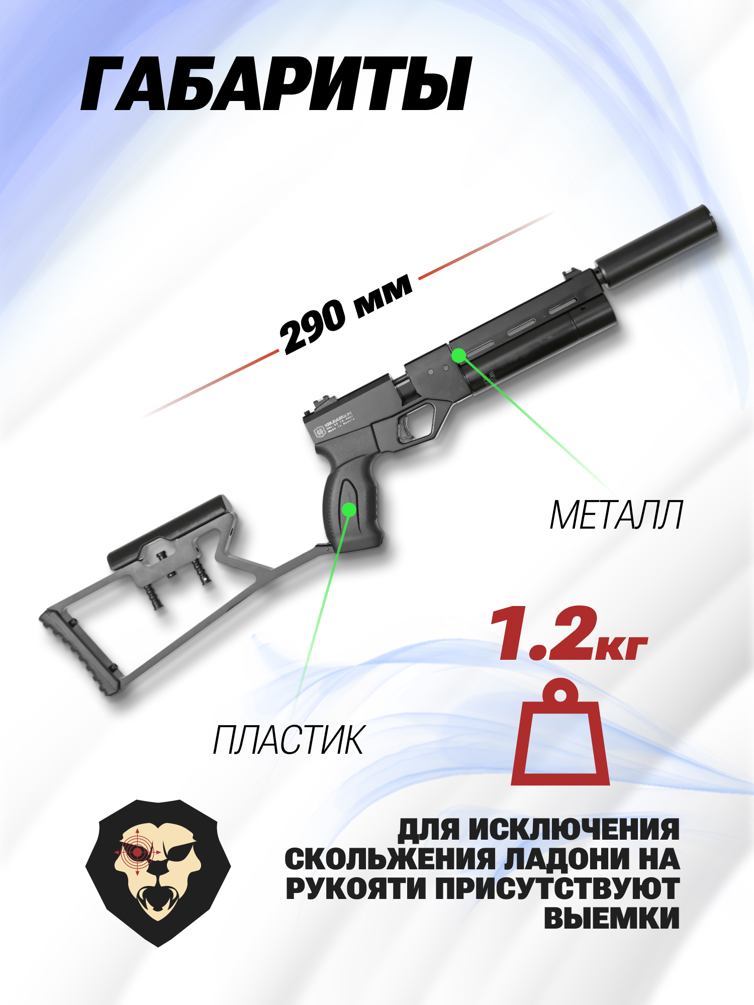 РСР Крюгер Корсар в этом исполнении оснащается съемным прикладом, который обеспечивает комфортную вкладку в оружие, что дает стрелку осуществлять прицельную стрельбу. Скелетный приклад оснащен регулируемым подщечником.