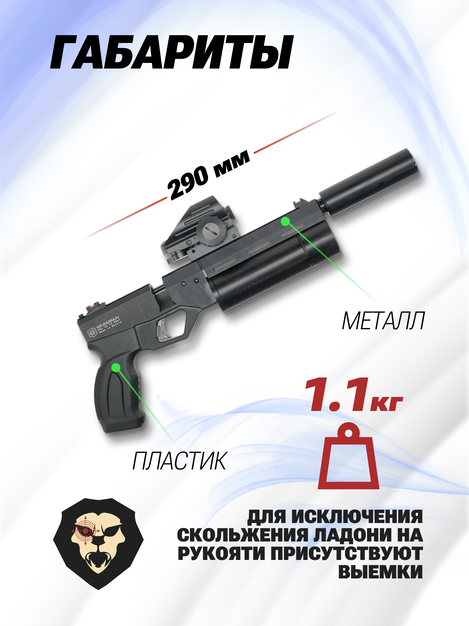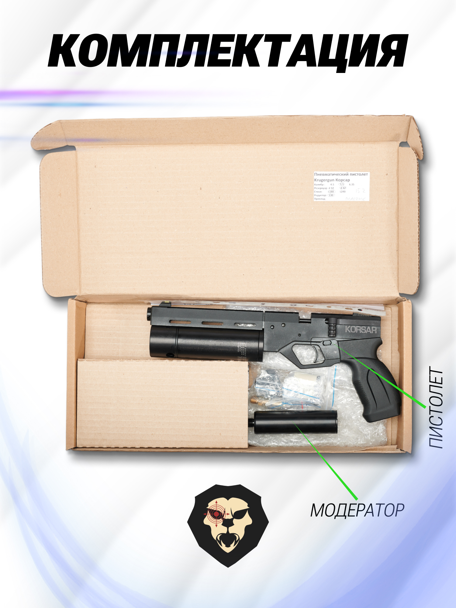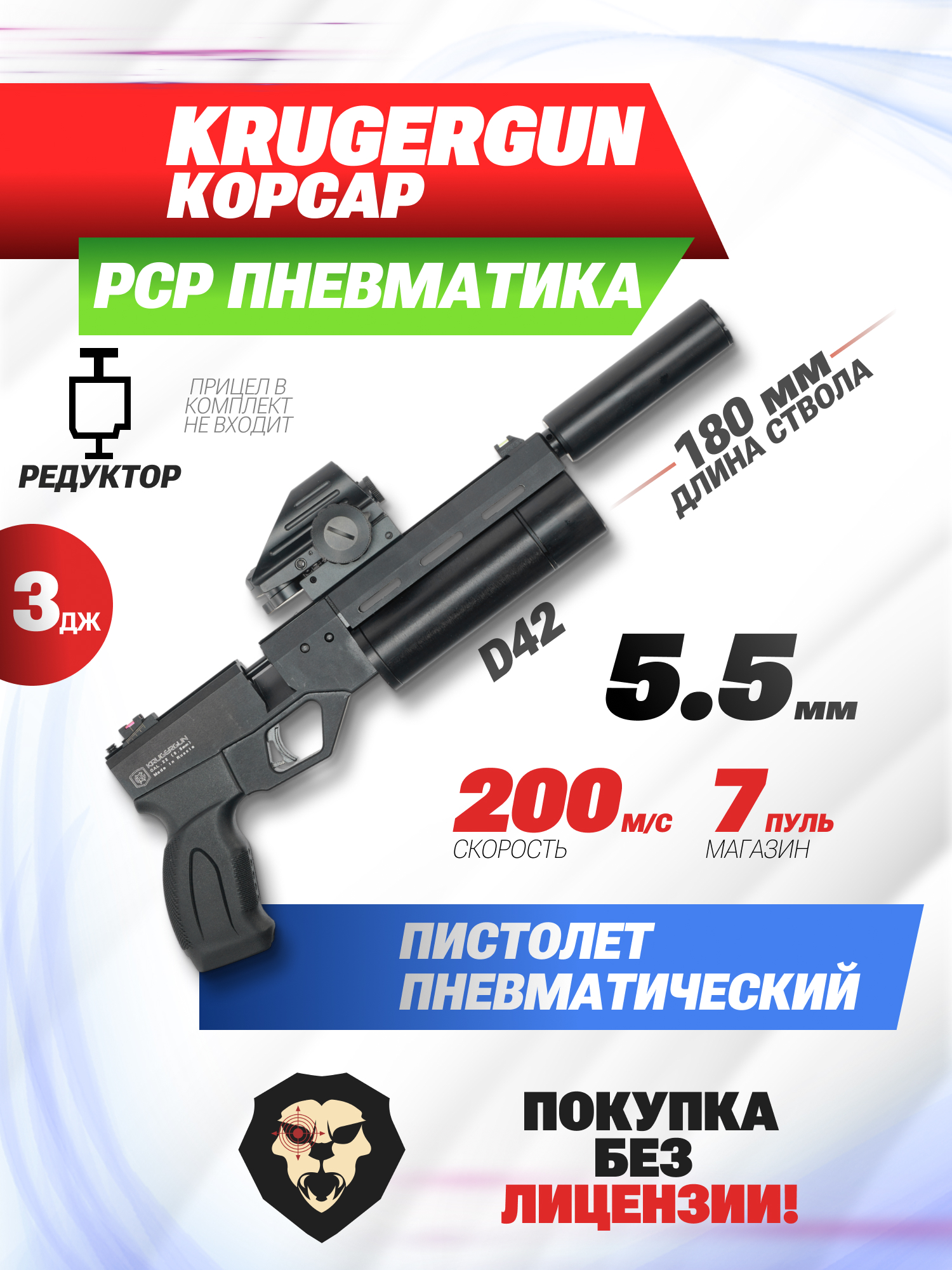 Информация о товаре "Пневматический пистолет KrugerGun Корсар 5.5 мм (PCP, 180 мм, редуктор, D42, пластик, с манометром)" носит ознакомительный характер, и не является публичной офертой, определяемой положениями Статьи 437 Гражданского кодекса Российской Федерации, характеристики, внешний вид, цвет и комплектация могут быть изменены производителем без уведомления.