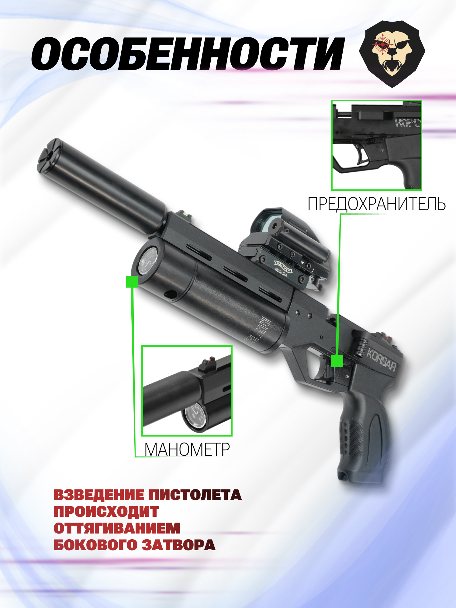 Рассматриваемый экземпляр Корсара отличается от похожих моделей не только объемом резервуара и калибром используемых снарядов, но и длиной ствола. В представленном варианте она составляет 180 миллиметров, поэтому благодаря таким габаритам в совокупности с пониженным весом обеспечивается повышенный уровень удобства при стрельбе и транспортировке.