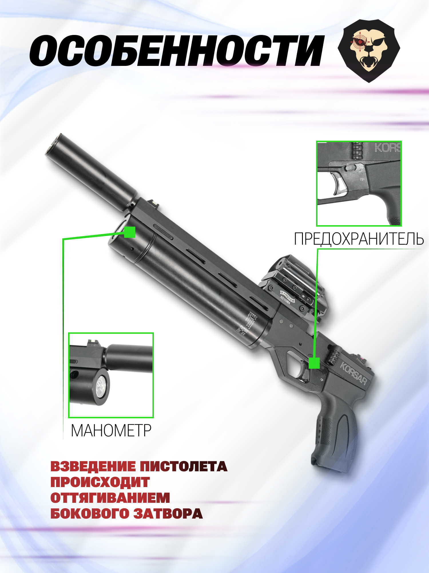 РСР Корсар многозарядный пистолет с одиночным режимом ведения огня. Рекомендованная для использования свинцовая пуля досылается из барабанного магазина на 7 пуль калибром 5.5 миллиметра. Взвод осуществляется удобным рычагом расположенном на ствольной коробке.