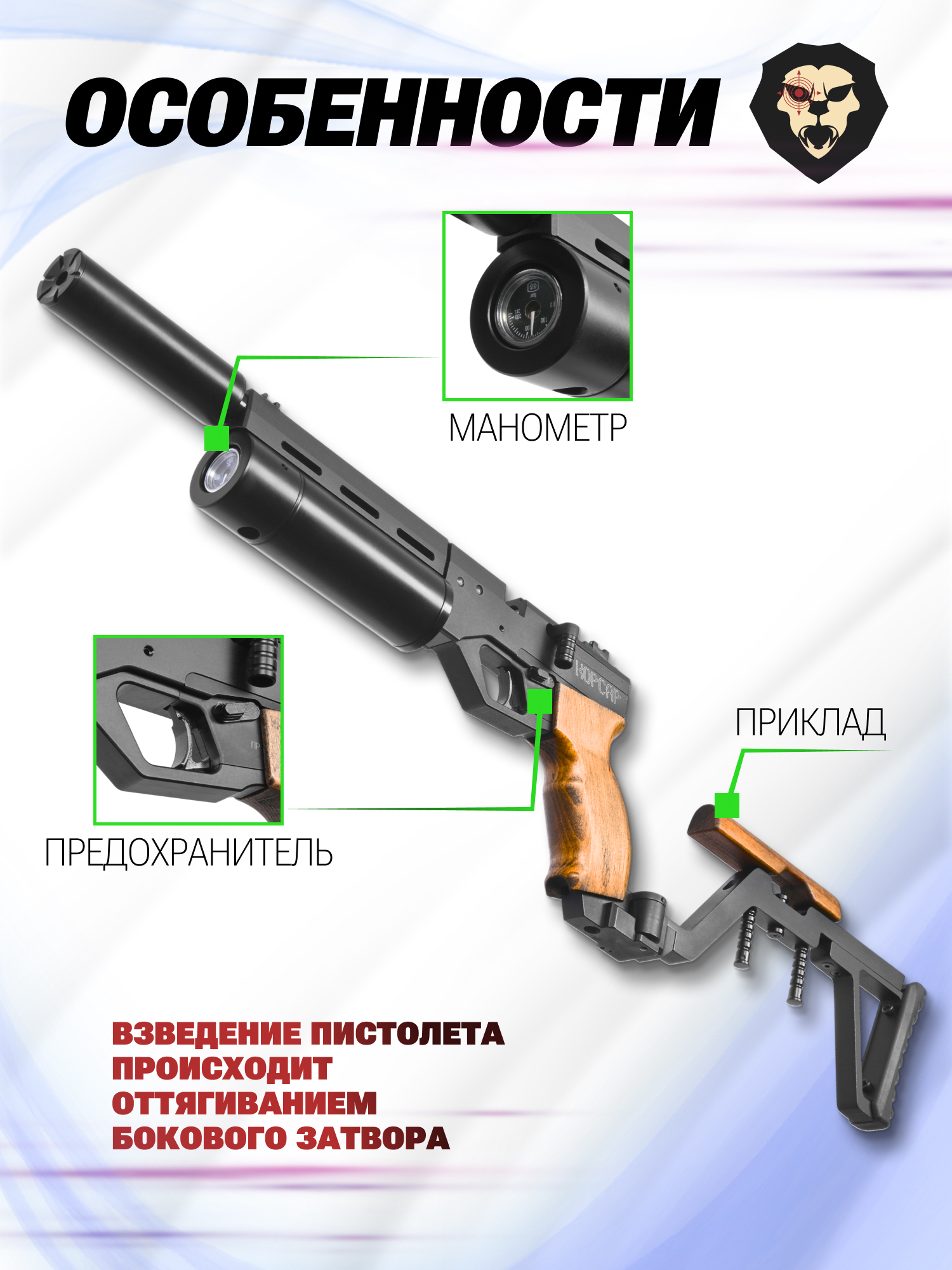 Пневматический пистолет KrugerGun Корсар 6.35 мм (180 мм, d42, прямоток, манометр, приклад, дерево) купить в интернет-магазине Popadiv10.