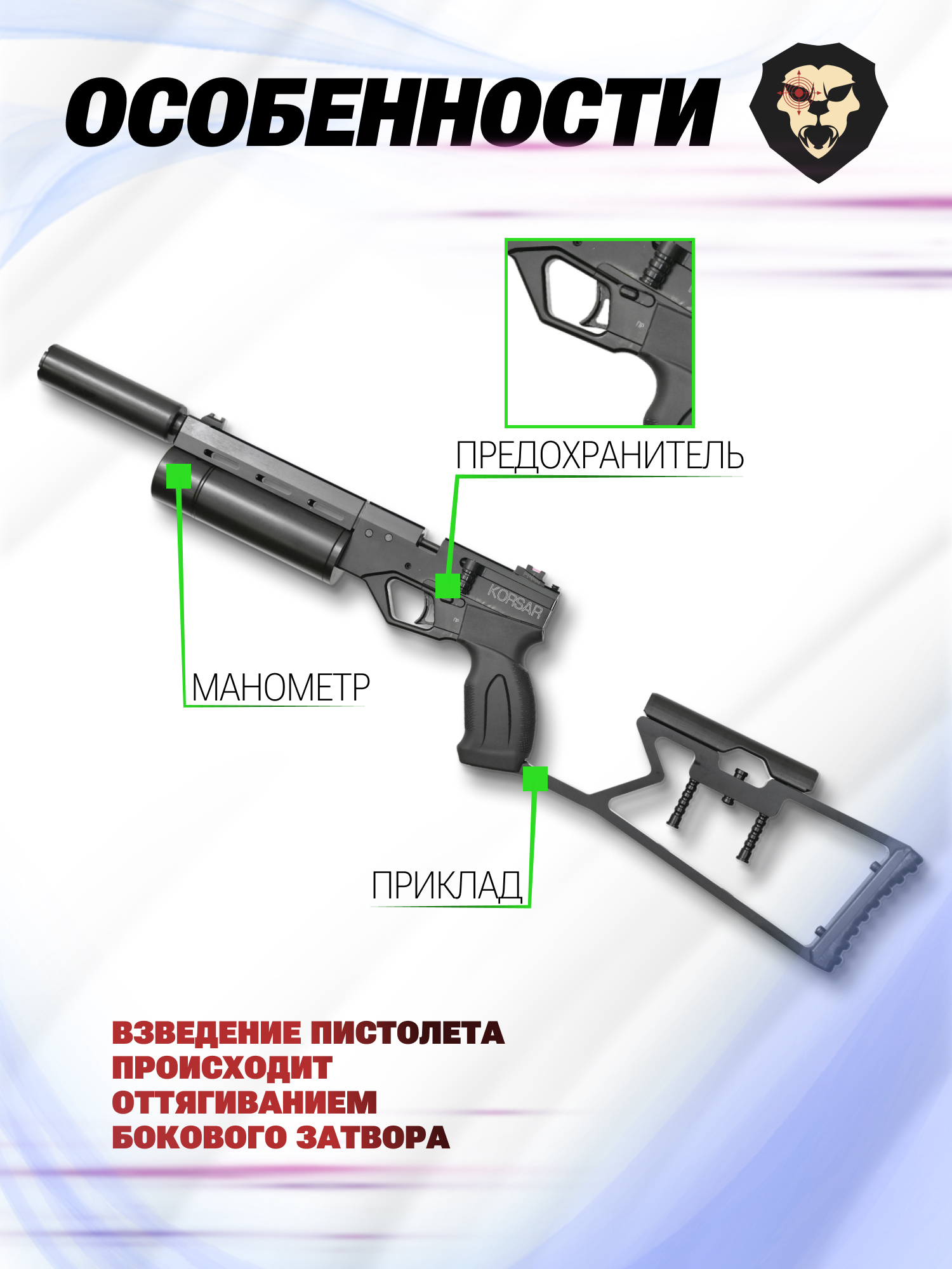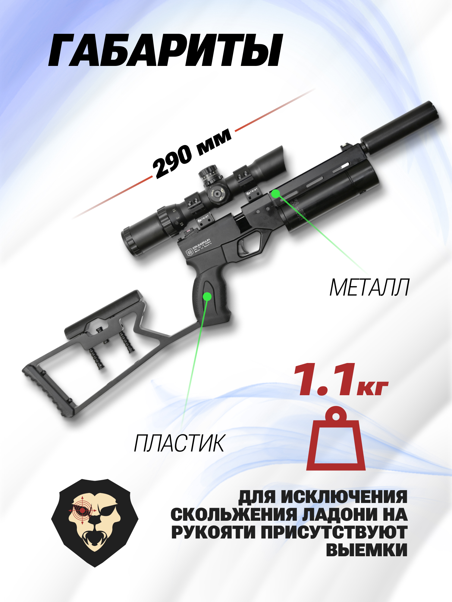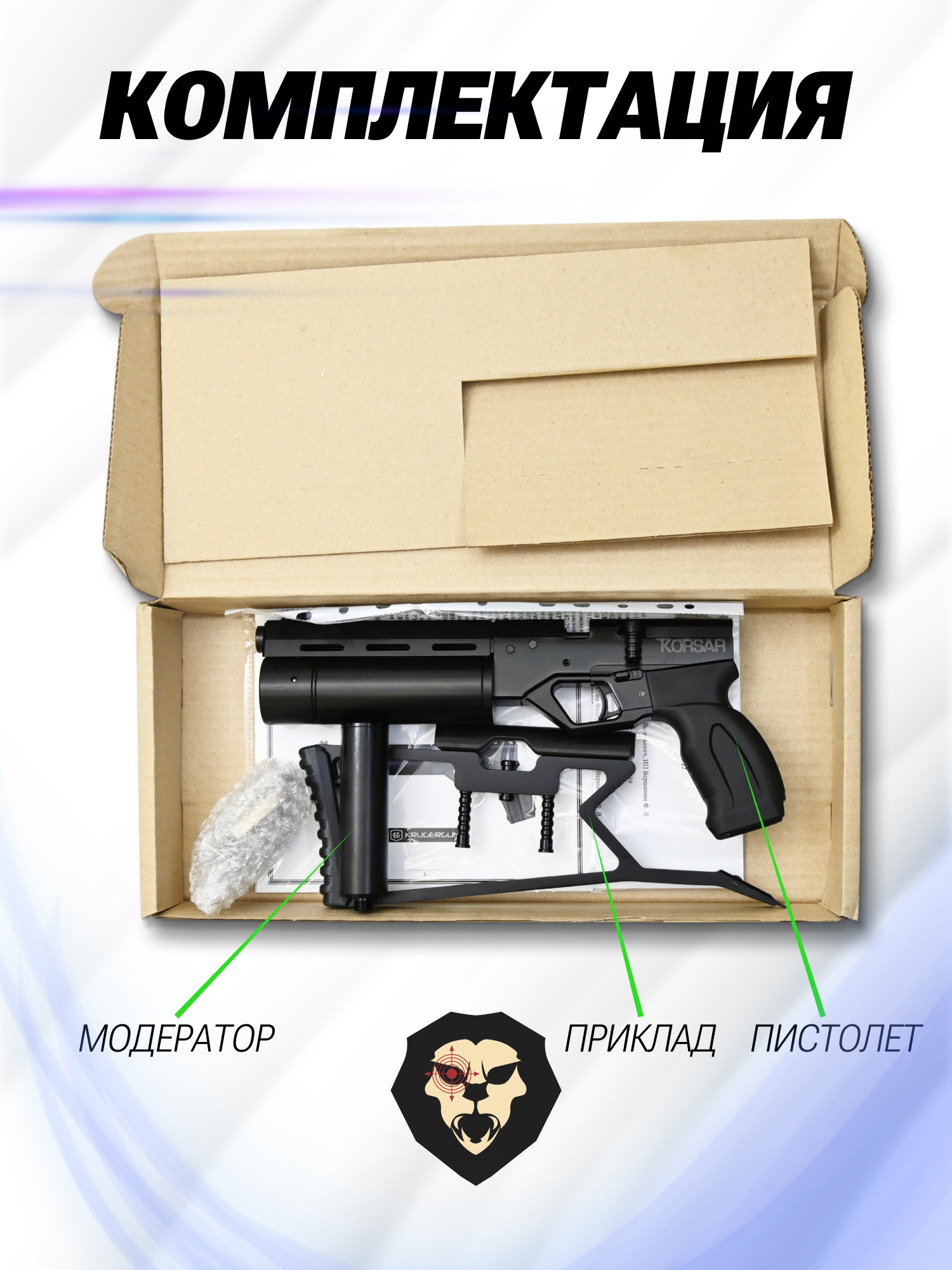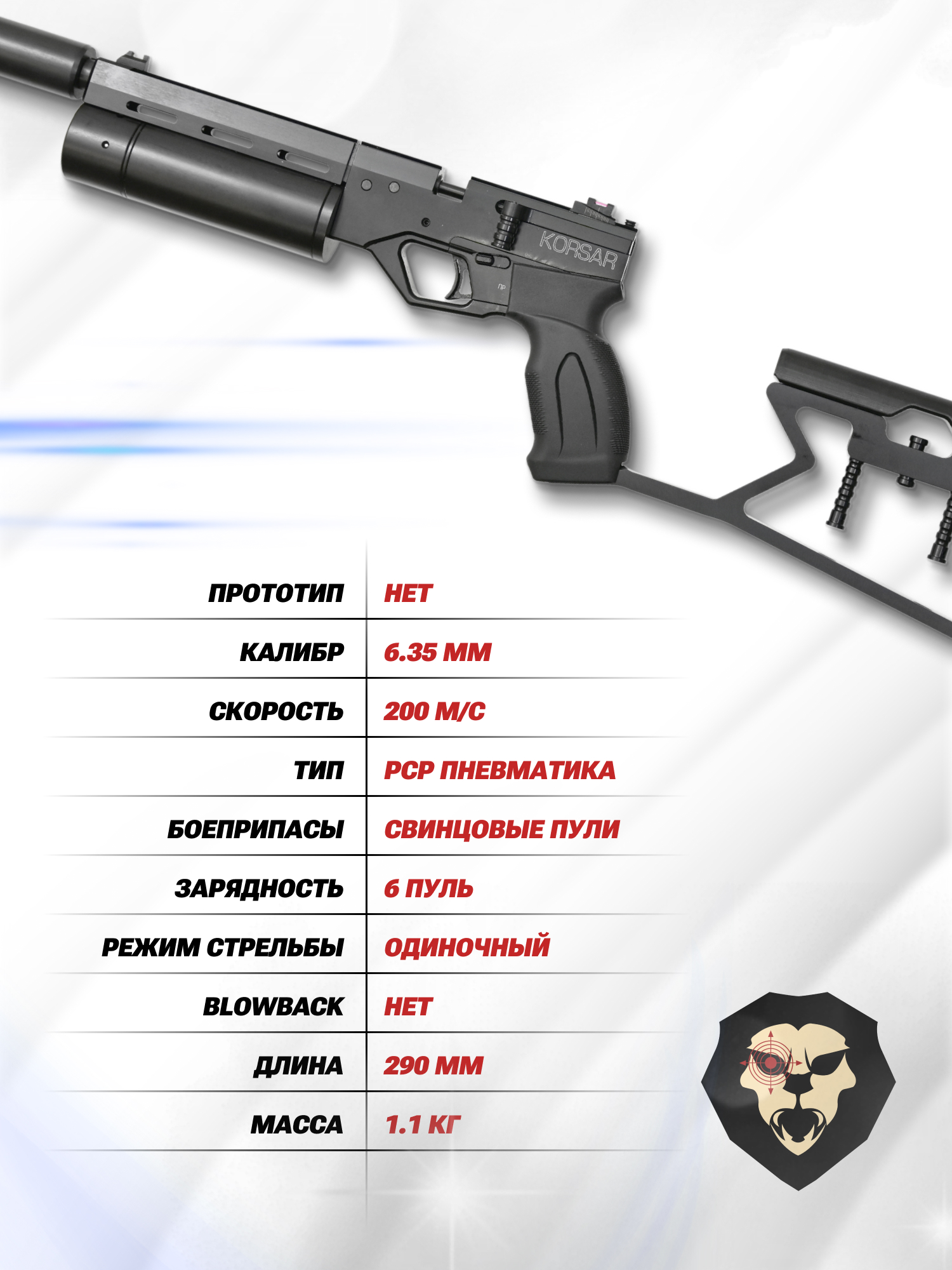 | Комплектация | Пистолет, упаковка, магазин, саундмодератор, приклад, заправочный штуцер, краткая документация, копия сертификата (по запросу покупателя) |