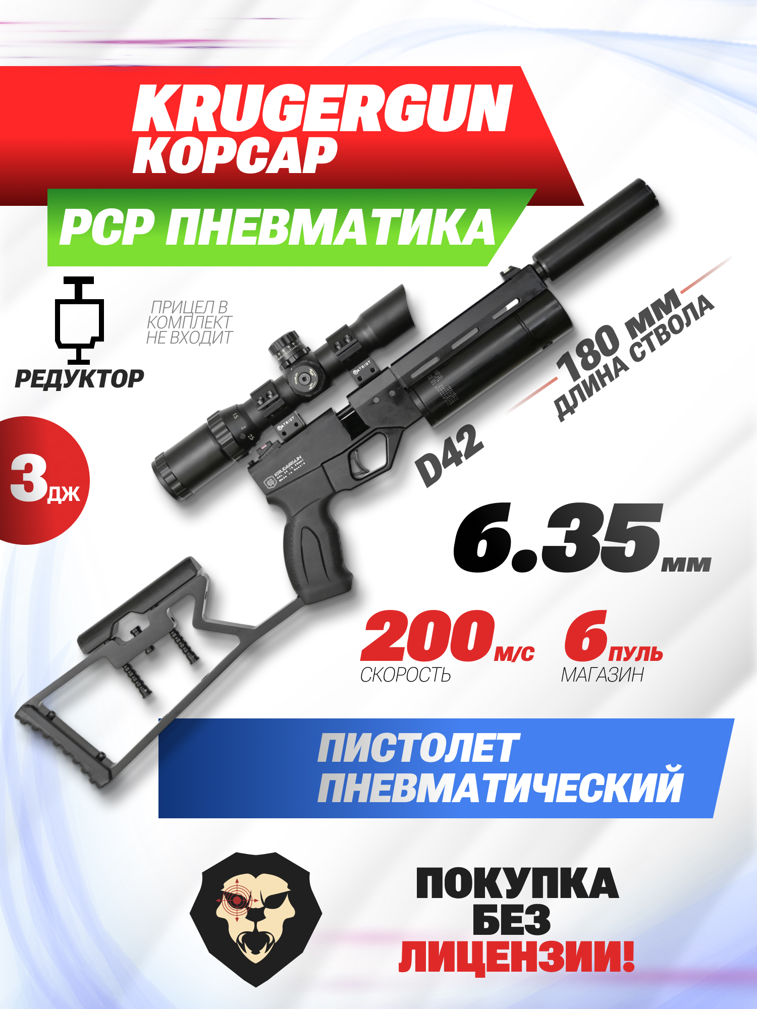 Информация о товаре "Пневматический пистолет Krugergun Корсар 6.35 мм (180 мм, с прикладом, D42, с манометром, редуктор)" носит ознакомительный характер, и не является публичной офертой, определяемой положениями Статьи 437 Гражданского кодекса Российской Федерации, характеристики, внешний вид, цвет и комплектация могут быть изменены производителем без уведомления.
