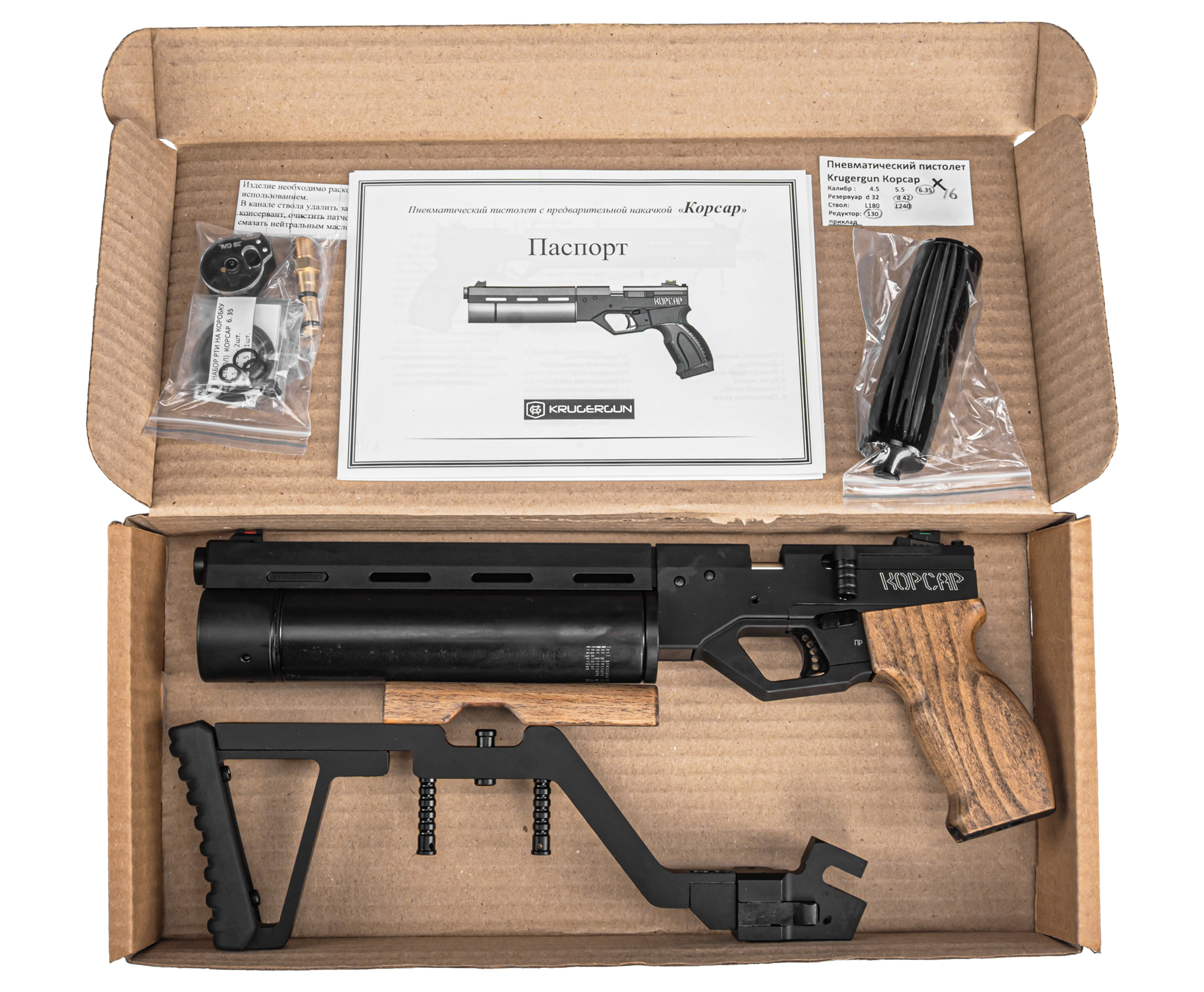 Для расширения коллекции пневматического оружия компания KrugerGun разработала новую модифицированную версию пистолета Корсар КрюгерГан с деревянной рукоятью и возможностью установки приклада скелетного типа, которая была недоступна на моделях прошлой серии. Ствол нарезного типа изготавливается с длиной 24 см при диаметре дульного среза 0.25 дюймов. В качестве боеприпасов для такого оружия применяются свинцовые пули форм-фактора «воланчик» в калибре 6.35 миллиметров.