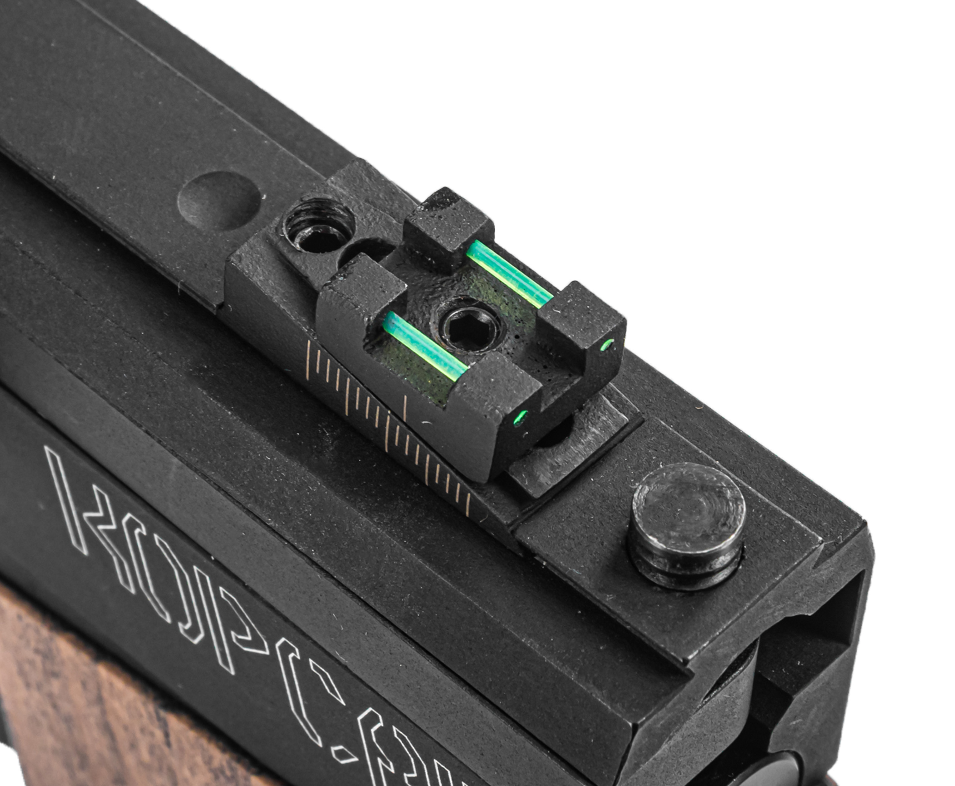В стандартном варианте комплектации ПСП Крюгер 6.35 мм Корсар Ф42 комплектуется открытыми прицельными приспособлениями, которые дают вести точную стрельбу на небольших дистанциях до цели. Оснащаются стандартные целик и мушка светонакопительными элементами, упрощающими прицеливание в условиях недостаточного освещения.
