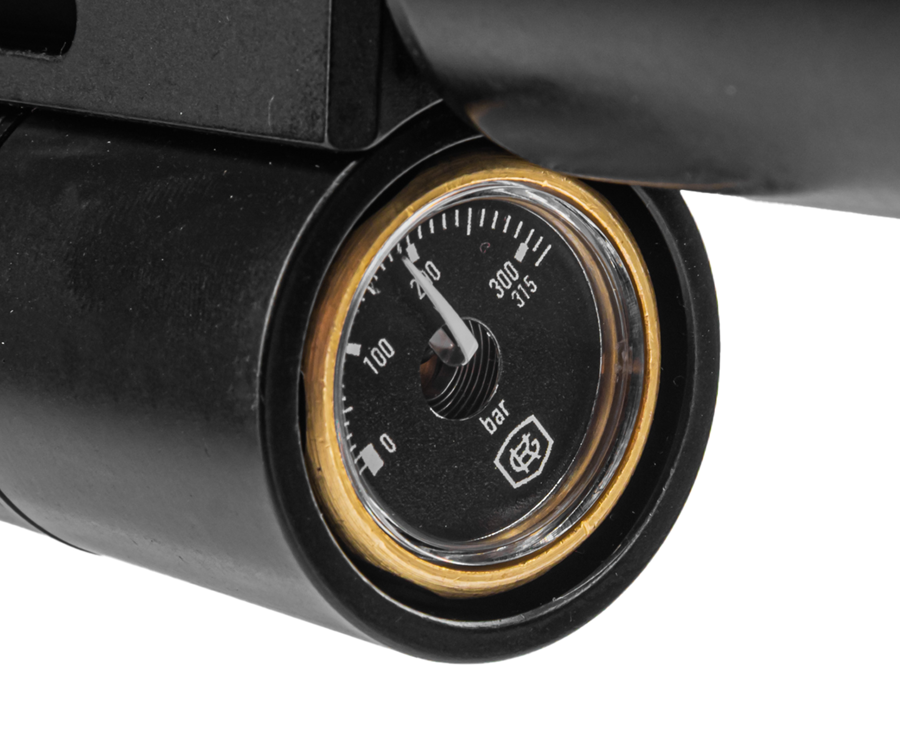 К числу новинок фирмы относится представленный пневматический пистолет, применяющий энергию расширения сжатого воздуха, который под высоким давлением содержится в трубчатом баллоне под стволом. Вместимость ресивера рассчитана на закачку 70.9 кубических сантиметров газа, нагнетая при этом давление до 300 Бар. Для отслеживания отмеченного показателя изготовитель разместил на торцевой части цилиндрического элемента манометр, также применяющийся для расчета стабильного плато.