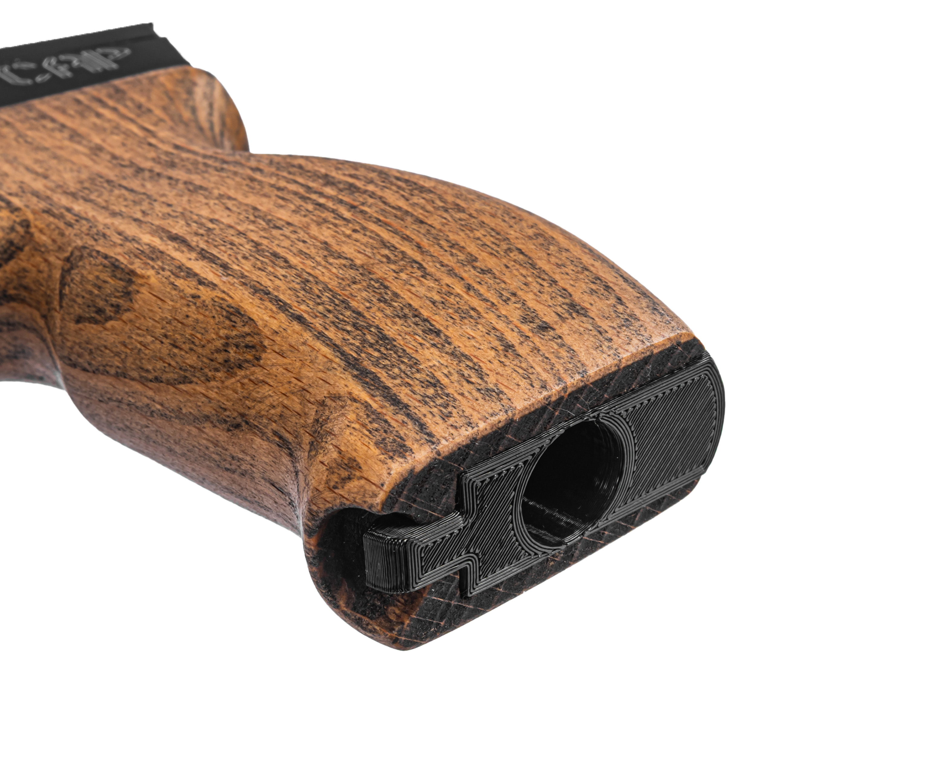 Рассматриваемый пистолет Корсар 6.35 мм от Крюгера выделяется повышенным удобством удержания, что обеспечено эргономичной рукоятью, изготовленной из дерева. Утолщение в области обхвата ладонью, а также выемка под большой палец руки обеспечивают комфортное использование оружия при стрельбе.