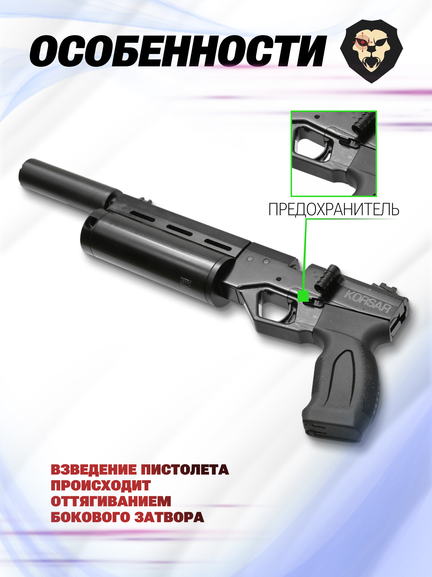 В российском законодательстве присутствует дополнительное требование относительно поставляемого на рынок пневматического оружия, а именно – наличие в устройстве предохранителя. В связи с этим, Пистолет Корсар для обеспечения должного уровня безопасности снабжен флажковым предохранителем на пластиковой рукоятке.