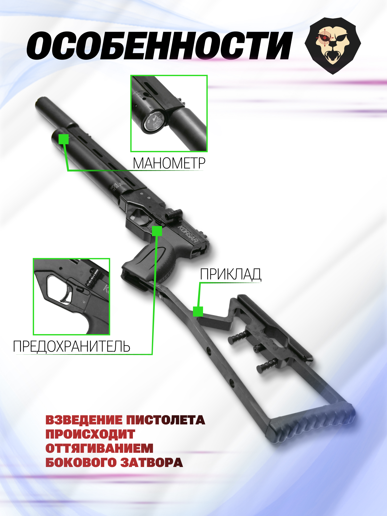 Пневматический пистолет Krugergun Корсар 6.35 мм (с прикладом, D32, редуктор, 240 мм, с манометром) купить в интернет-магазине Popadiv10.