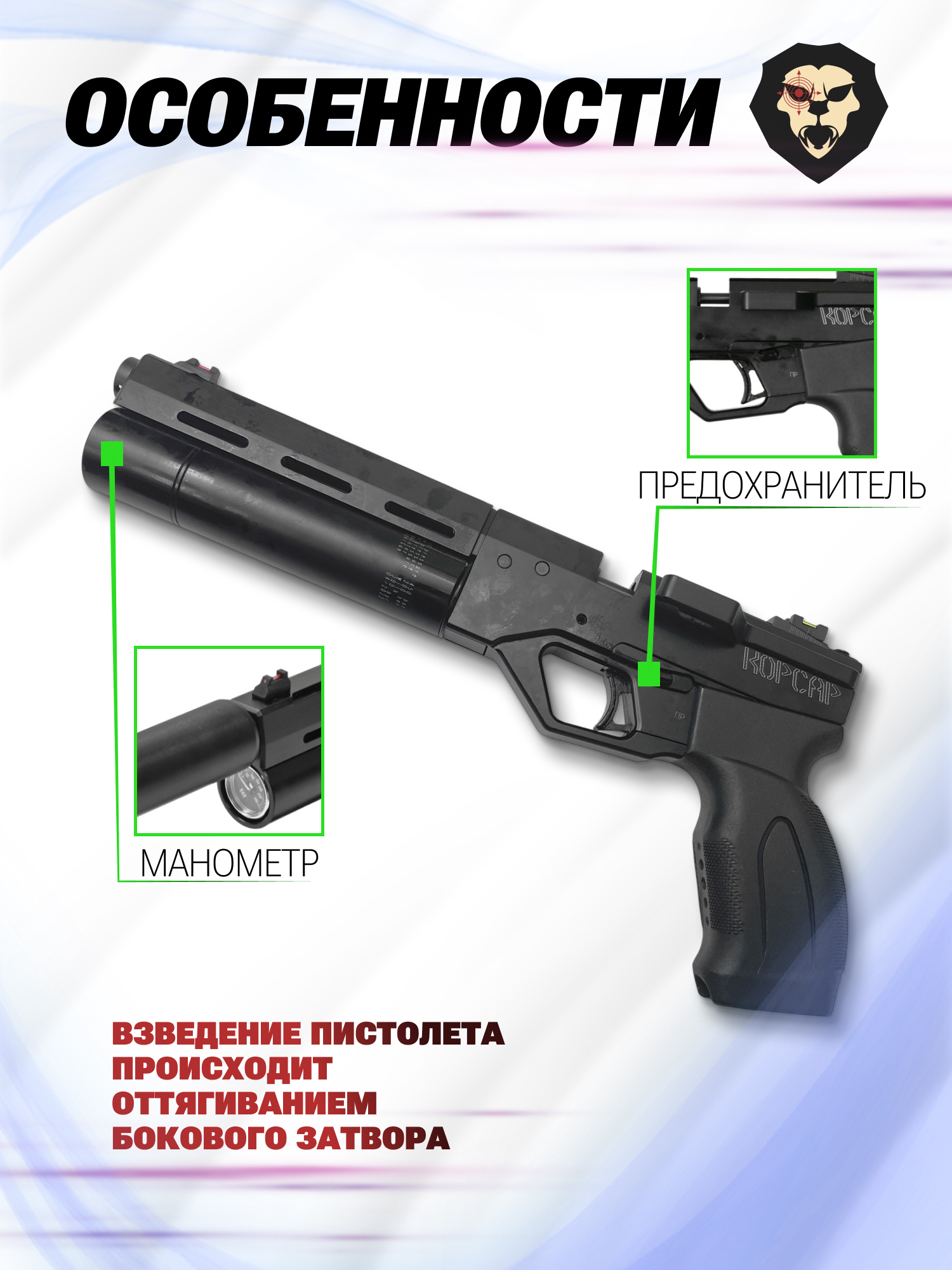 ПСП Крюгера Корсар F32 это редукторный пистолет. Эта особенность обеспечивает стабильную стрельбу за счет газового редуктора, который контролирует давление поступающего воздуха.