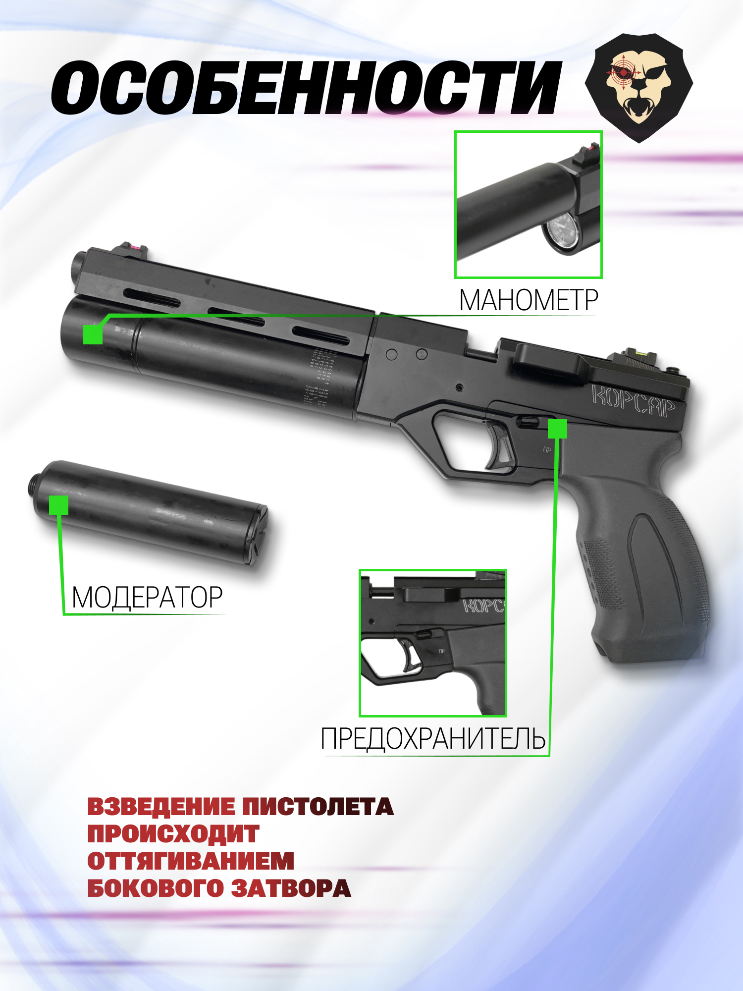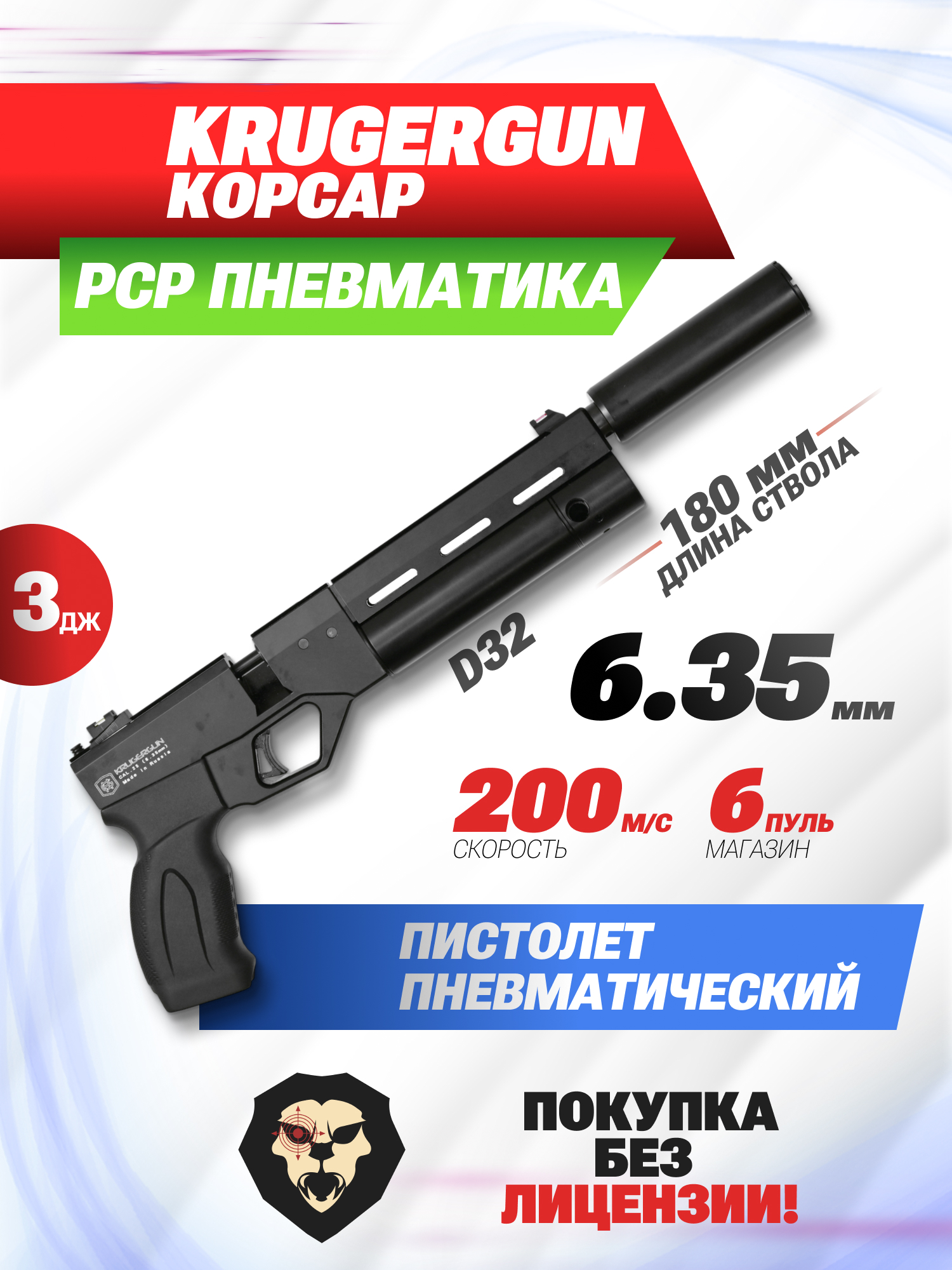 Информация о товаре "Пневматический РСР пистолет Krugergun Корсар (D32, редуктор, 180 мм, 6.35 мм, с манометром)" носит ознакомительный характер, и не является публичной офертой, определяемой положениями Статьи 437 Гражданского кодекса Российской Федерации, характеристики, внешний вид, цвет и комплектация могут быть изменены производителем без уведомления.