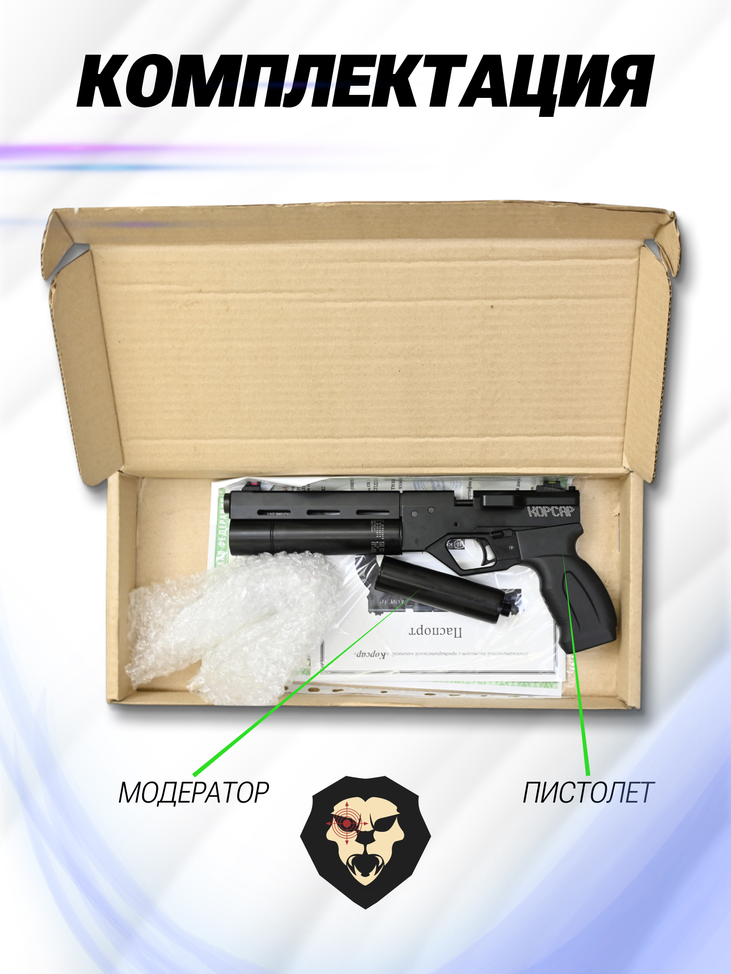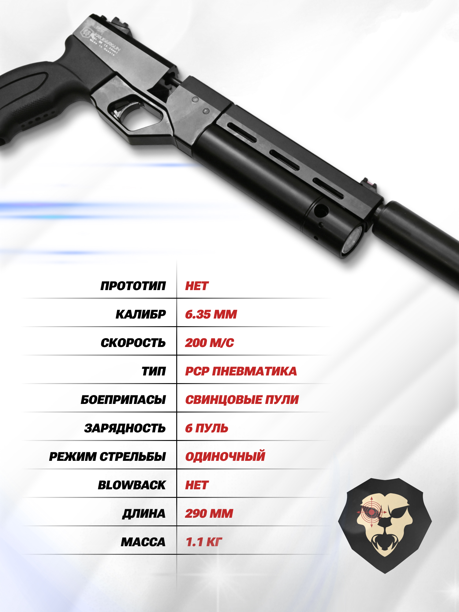 | Комплектация | Пистолет, заправочный штуцер, магазин, саунд-модератор, комплект ЗИП, краткая документация, копия сертификата (по запросу покупателя), упаковка |