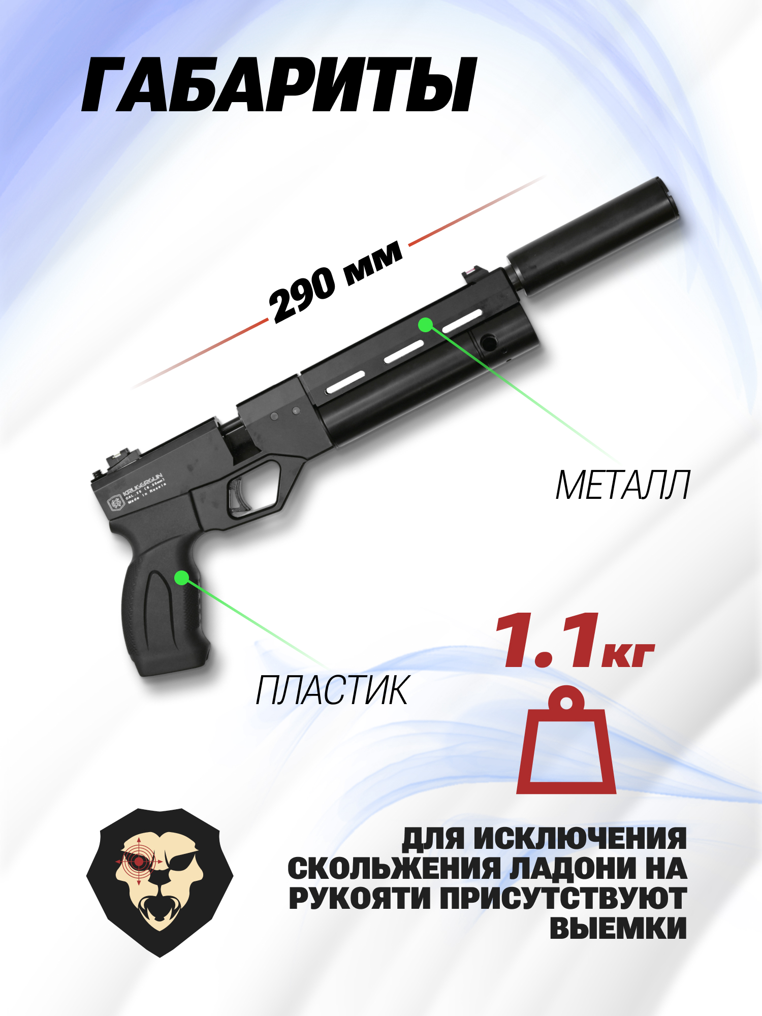 Помимо прочности стоит отметить, что пневматика ПСП Крюгерган отличается сниженной массой конструкции. При длине корпуса равной 290 миллиметров, вес не превышает 1100 грамм.
